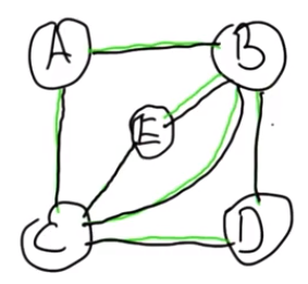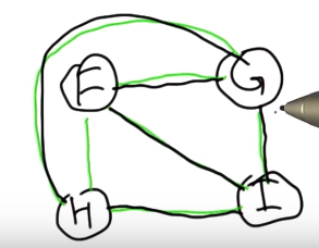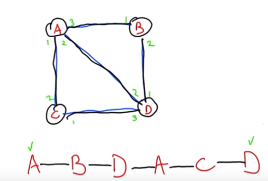 在圖中我們可以討論一個叫做歐拉路徑的東西,而我們行走的路線沿著邊緣從節點移動到節點,在這種情況下,有一條歐拉路徑從A開始以D結束,而四個節點均至少有兩條線。