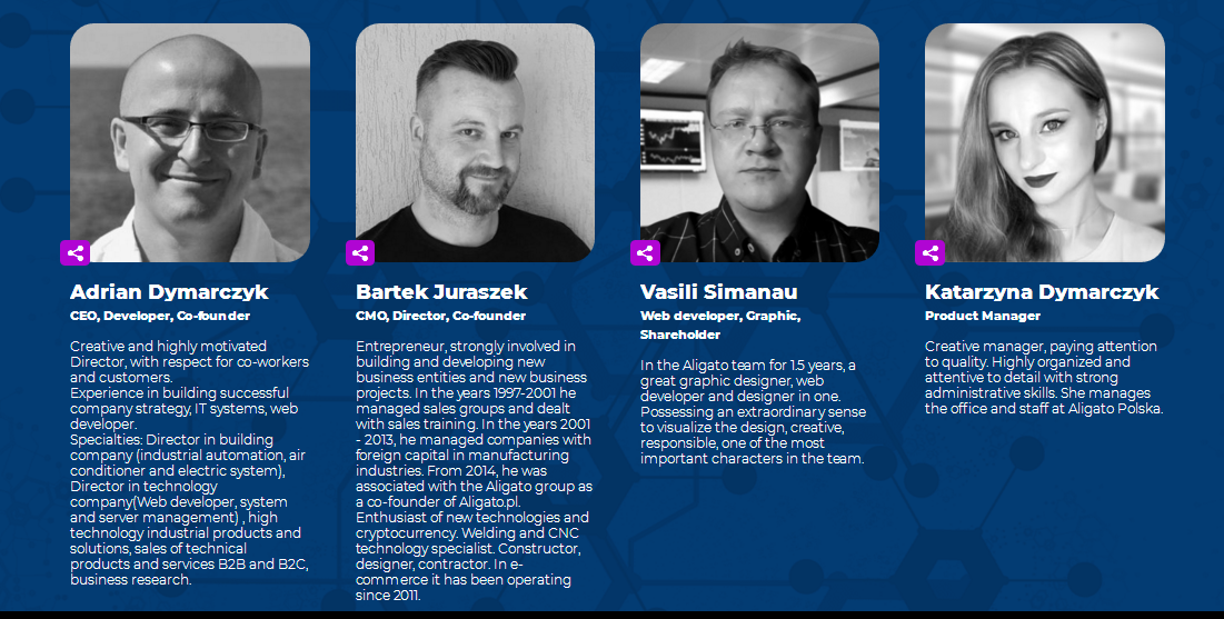 Компанию представляют опытные профессионалы в своем деле. За их плечами многолетний опыт работы, что внушает надежду на то, что все трудности, которые встанут на пути будут преодолены. Главным боссом является Adrian Dymarczyk – основатель всей этой заварушки. Имеет опыт в создании построения своего бизнеса.