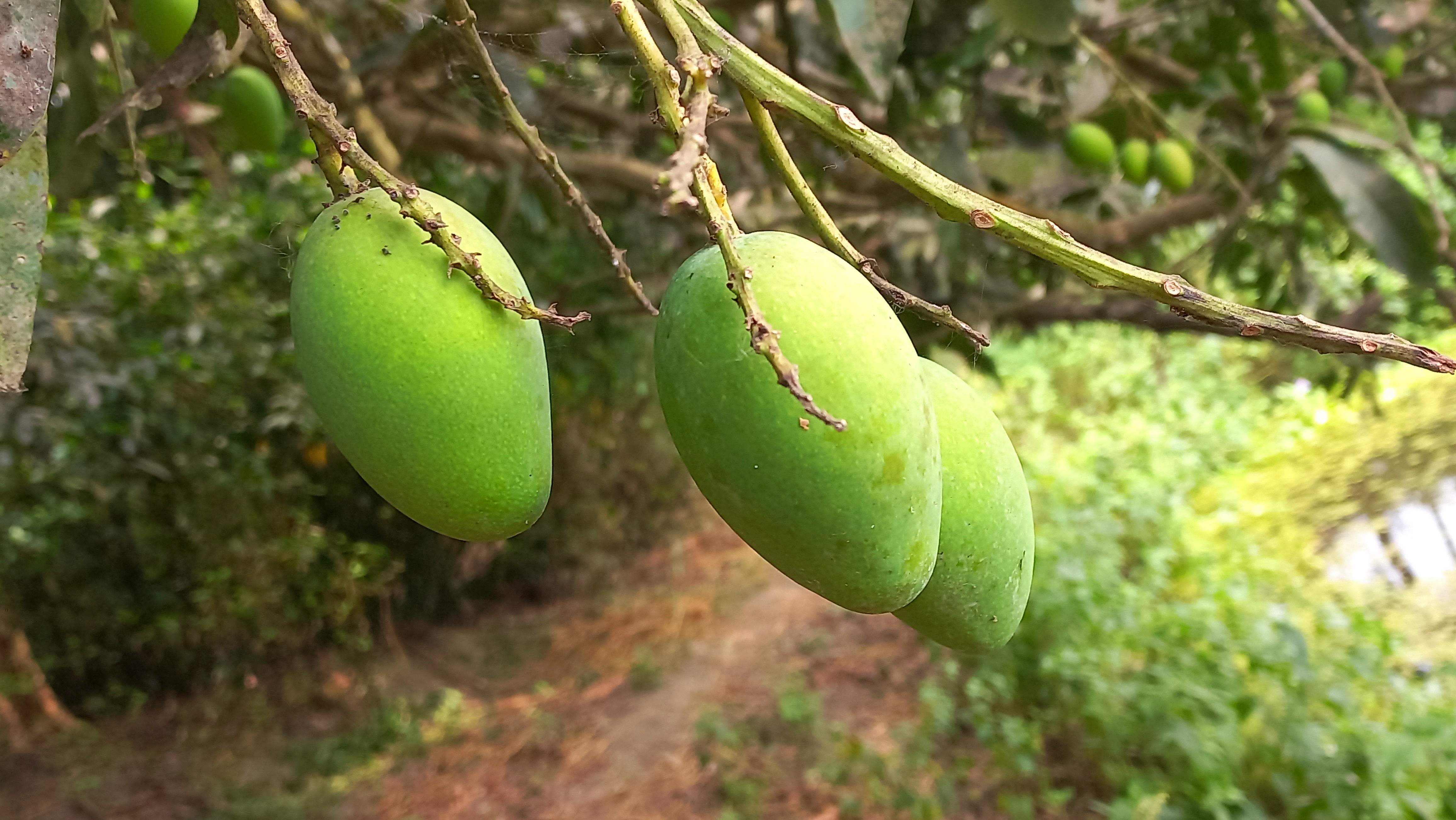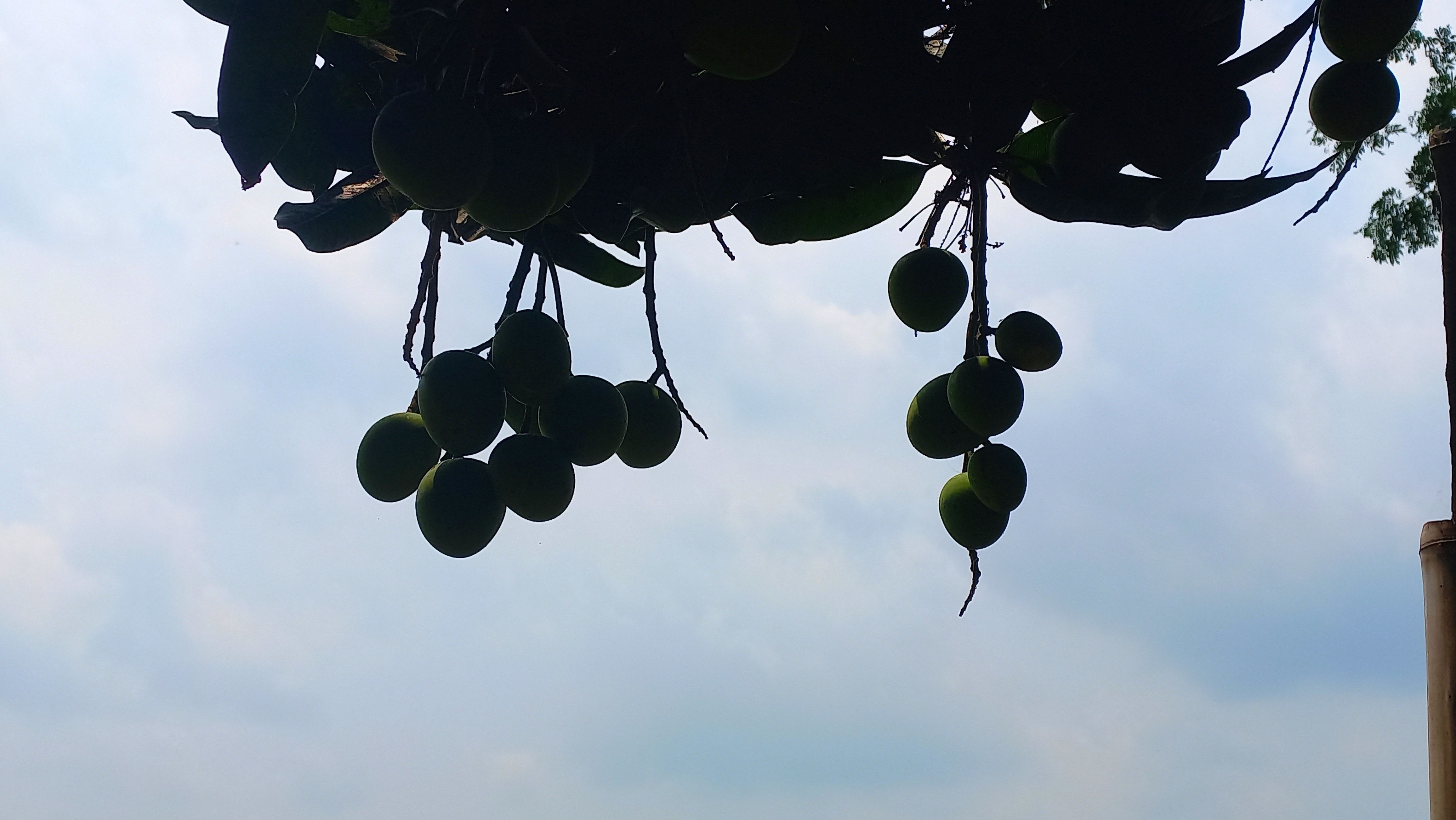 Since it is summer now, every mango tree has mangoes. I saw many mangoes on the banks of a small pond nearby. And these mangoes were in a condition where they were almost touching the ground. However, I saw some mangoes that were in bunches at the top and I took photographs of them. It was very nice to see these beautiful mangoes in bunches.