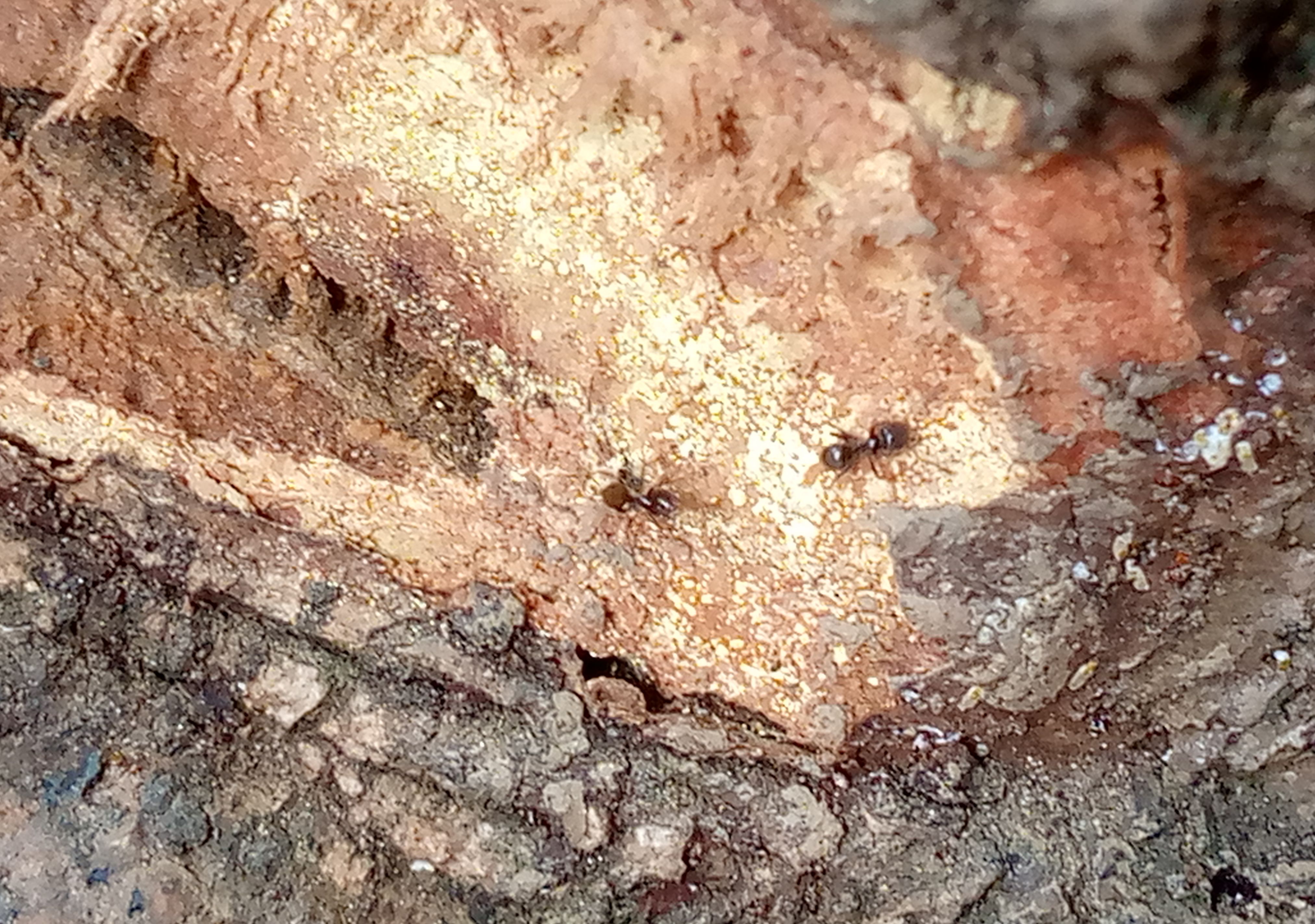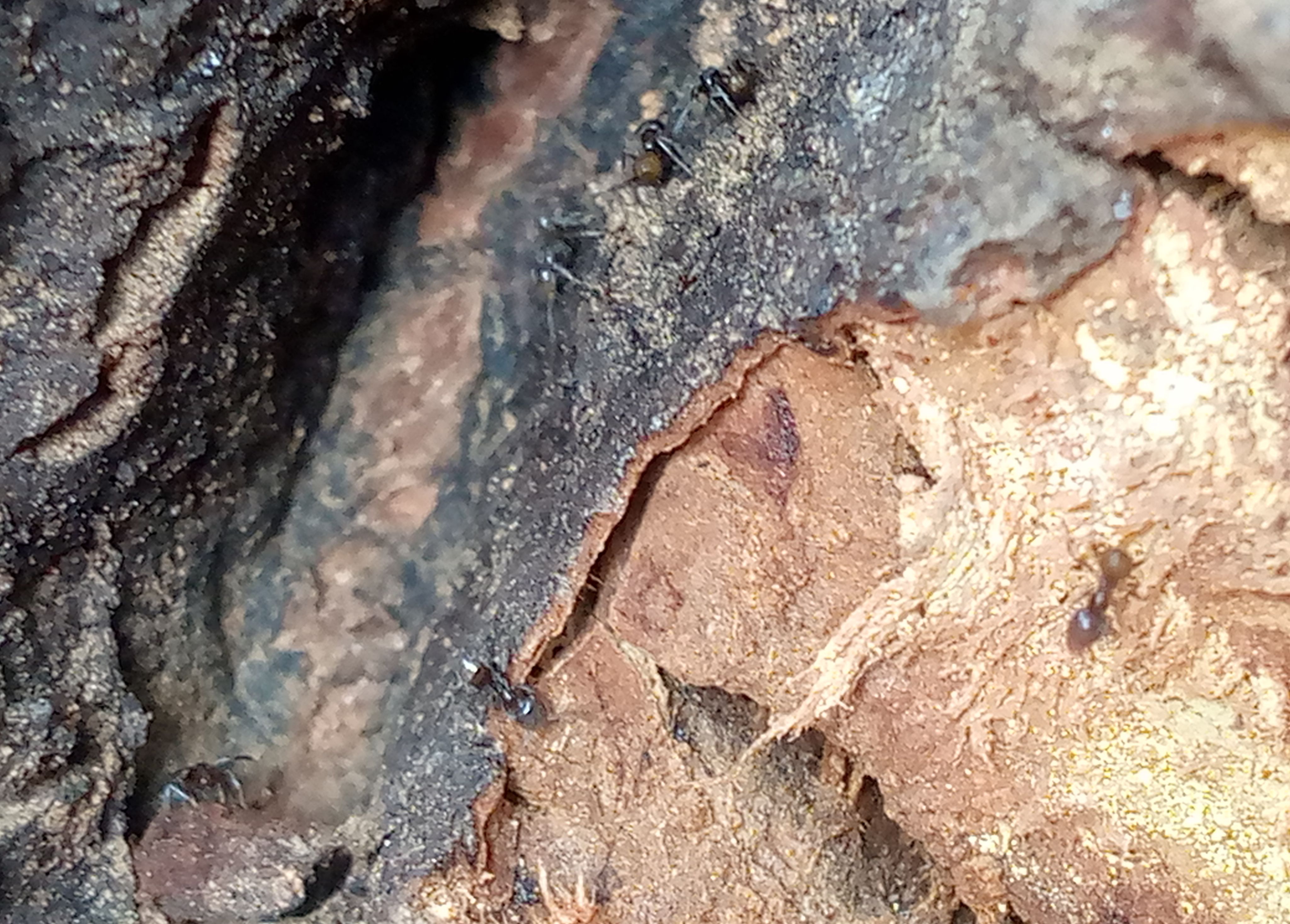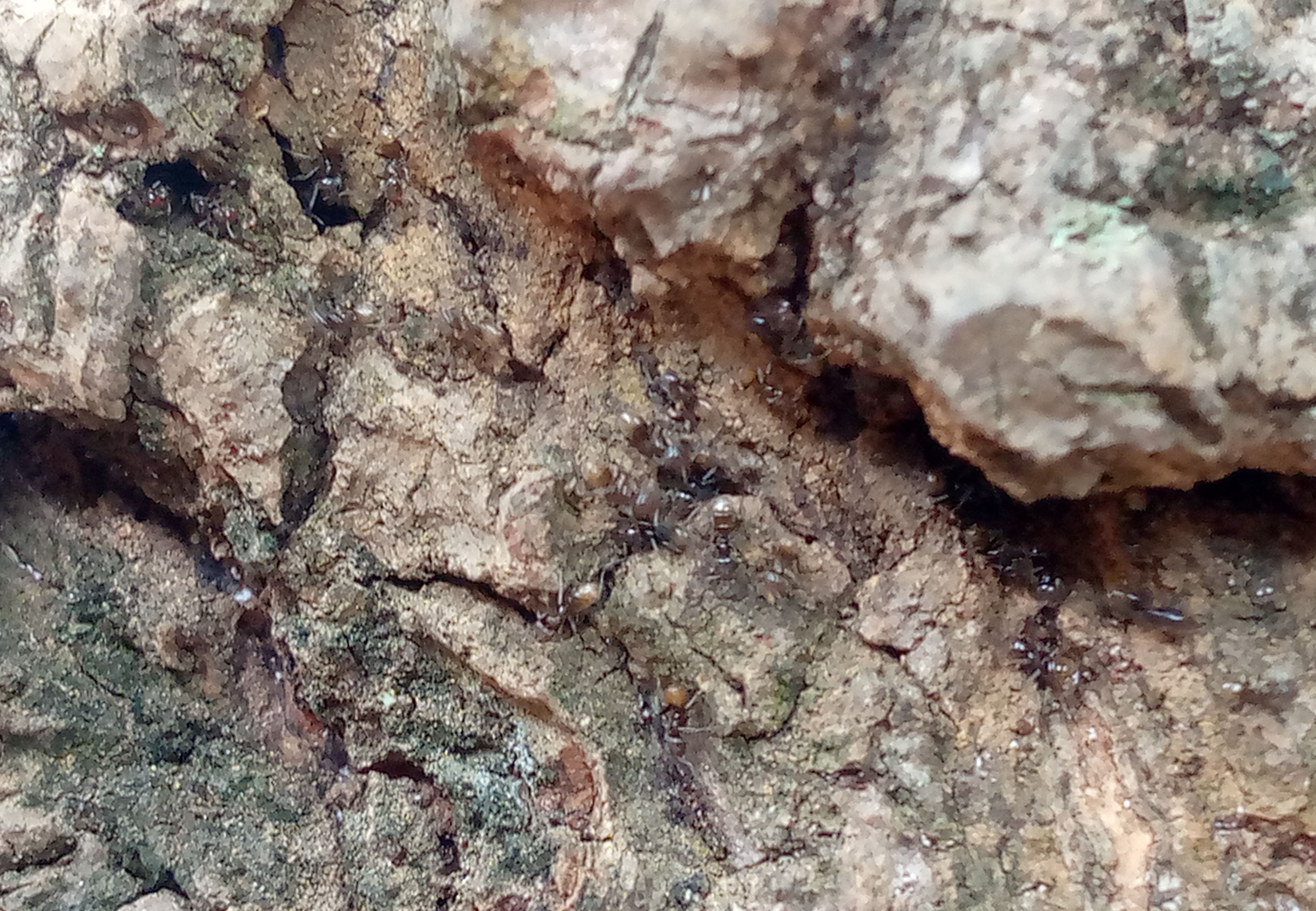 Al salir al patio en el tronco del árbol de mango encontré parte de la Colonia de estas trabajadoras Hormigas Negras
