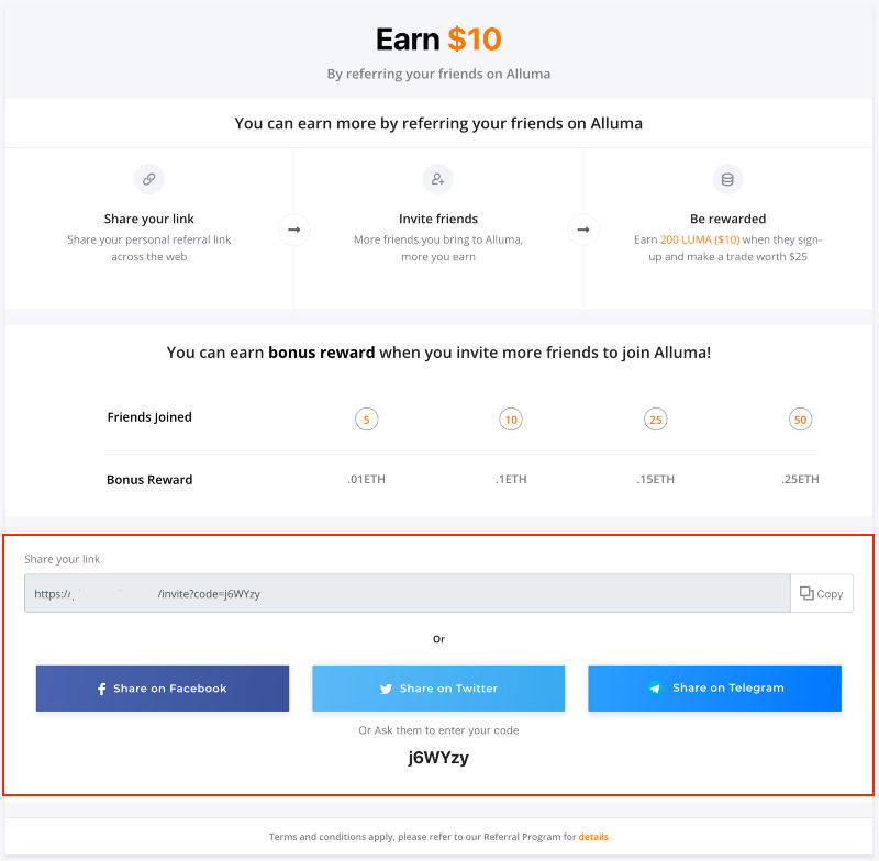 - You both earn $10 (200 LUMA tokens) when they trade over $25. (You can also earn up to 0.50ETH in bonus rewards!)