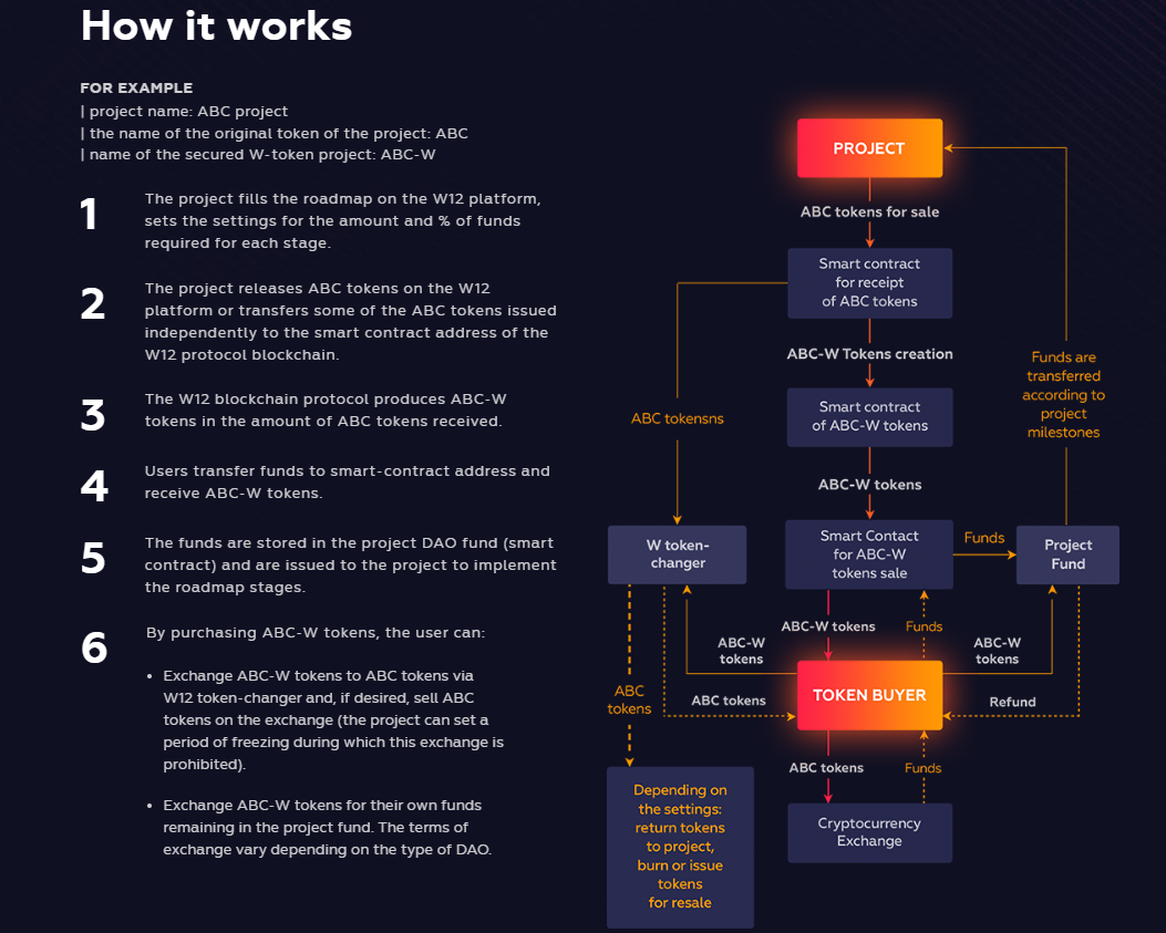 Any ICO company will have to register in the W12 project and provide all expenses. At the same time, all funds will be stored inside the W12 platform. When you perform each step of the road map plan, the company will receive funds.