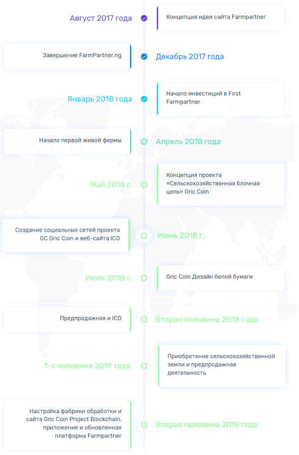 - Безперервне повернення. Щороку власники Gric Coin отримають 20% чистого прибутку проекту Gric Coin Project, яка включає сайт Farm / Blockchain, проект Farmpartner і проект з усиновлення.