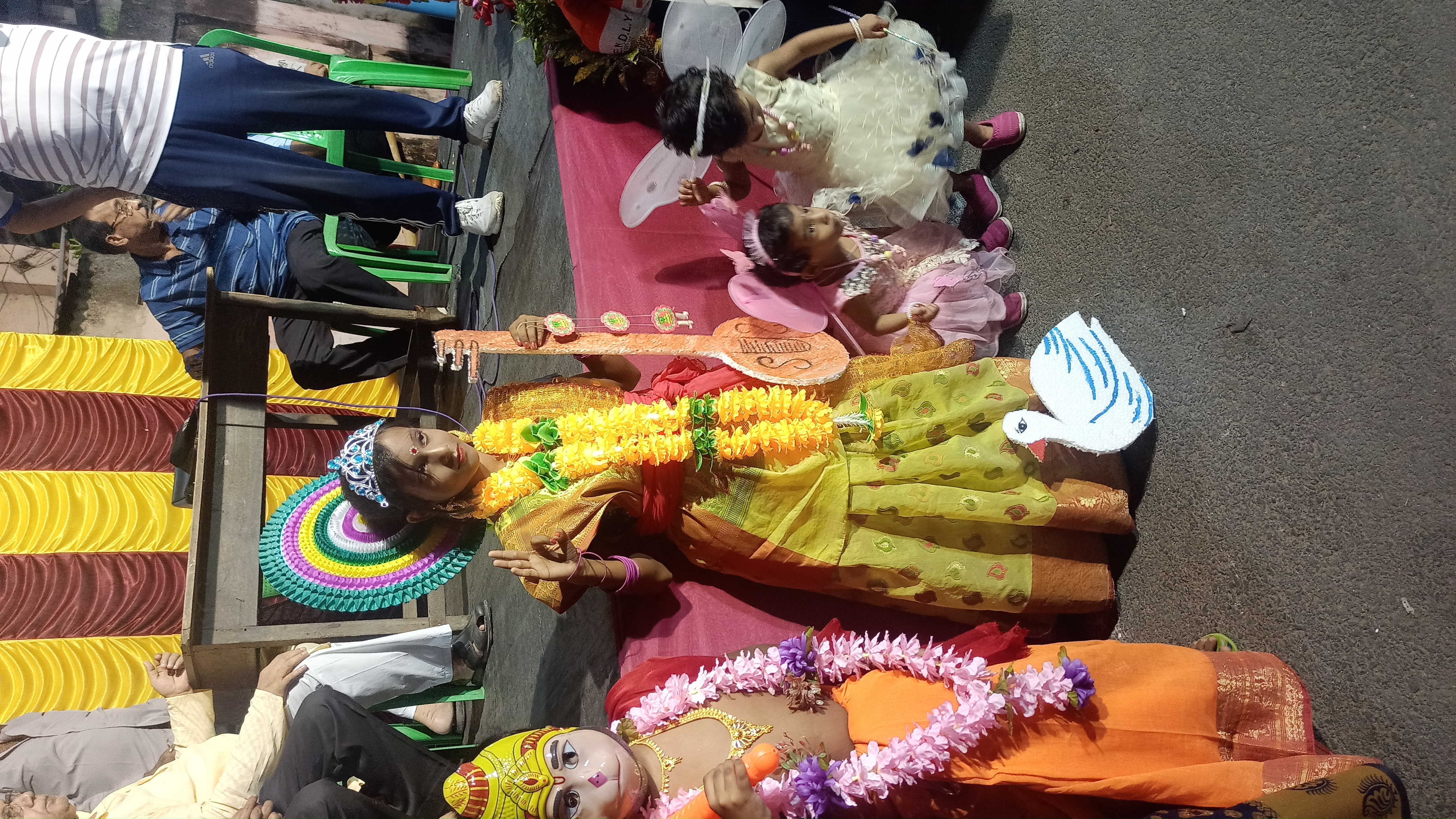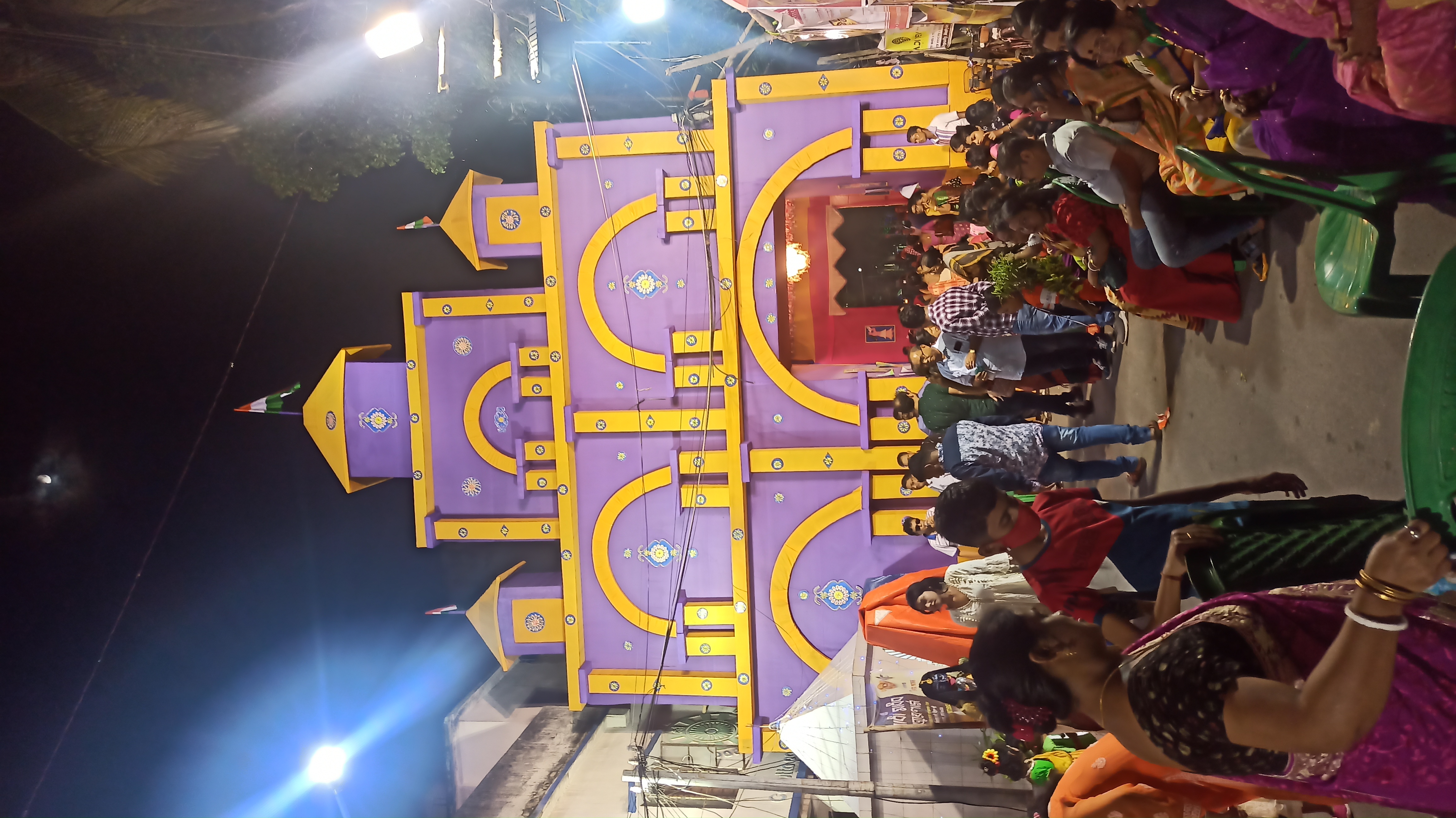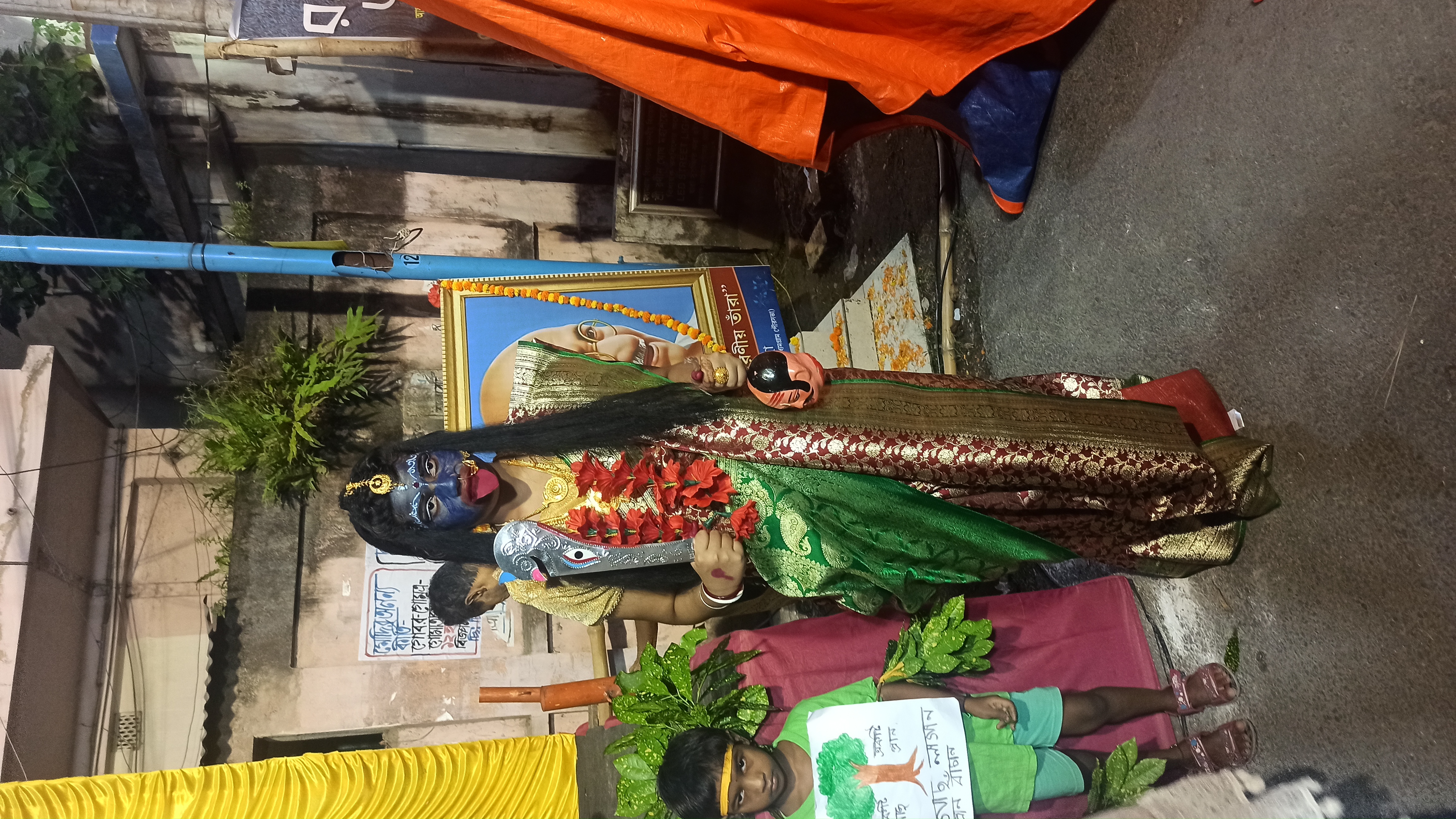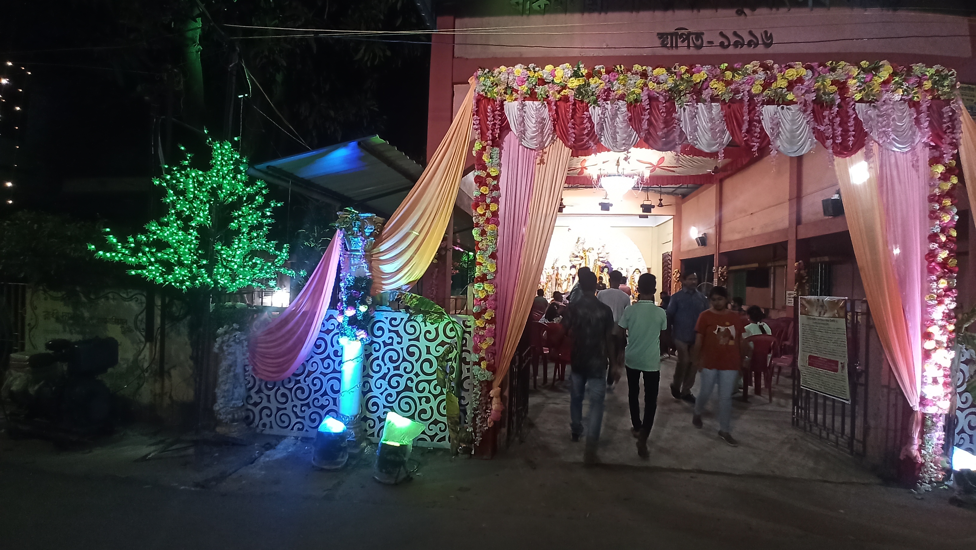 এই প্যান্ডেলের ভেতরে প্রবেশ করার আগে বিভিন্ন রঙের কাপড়ের ফুল দিয়ে গেট বানানো হয়েছে। এই গেটের ভেতর দিয়ে প্যান্ডেলে প্রবেশ করতে হবে। প্রবেশ করতেই চোখে পড়বে মায়ের সুন্দর মুখ। আবার এখানে ছোট ছোট বাচ্চারা কালী, লক্ষী ,সরস্বত ী ও হনুমান সেজেছে। এই ছোট বাচ্চাদের সাজা দেখে অবাক হয়ে যেতে হয়। তাই আমি দেরি না করে ছবি তুলে নিলাম।