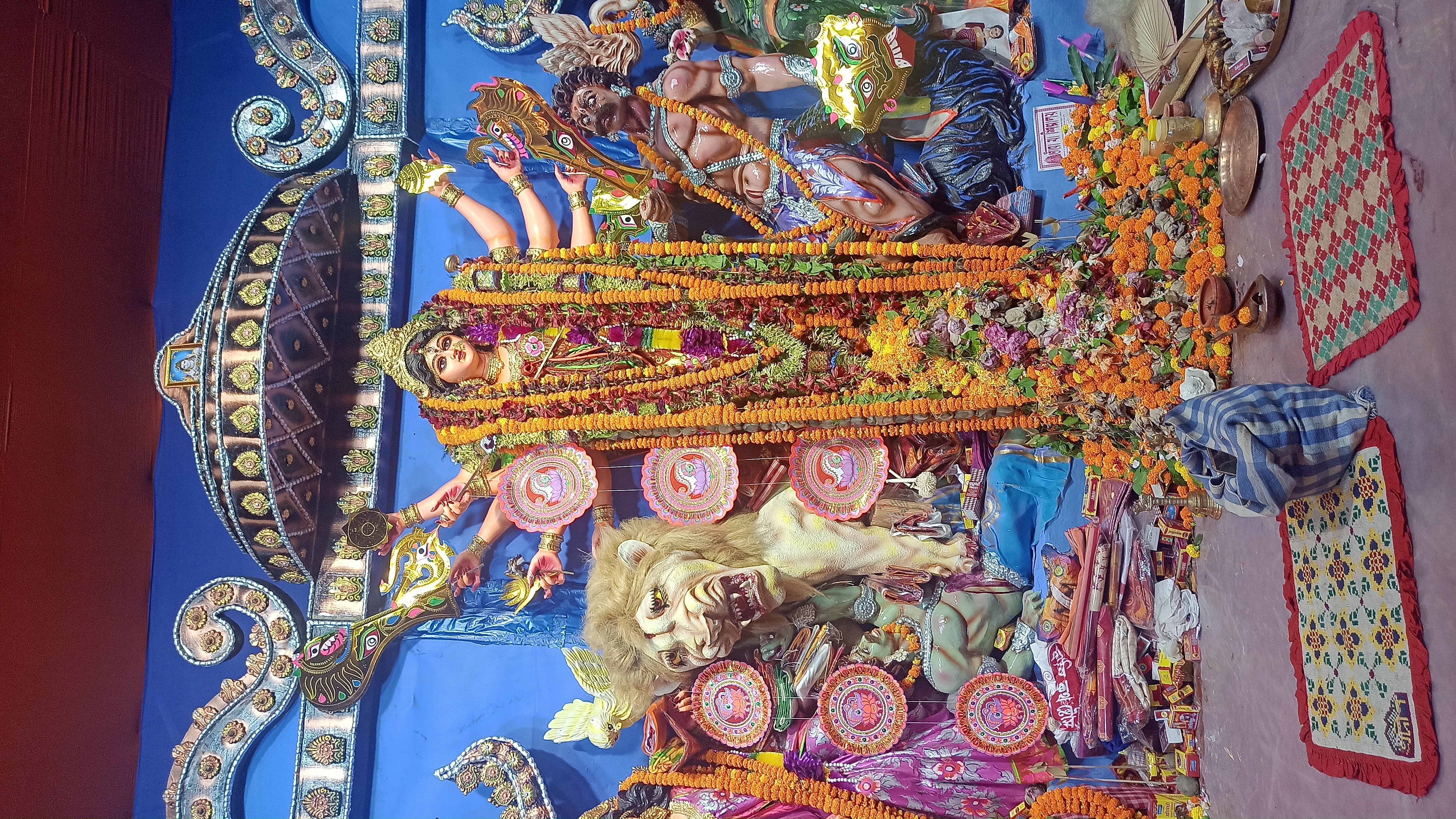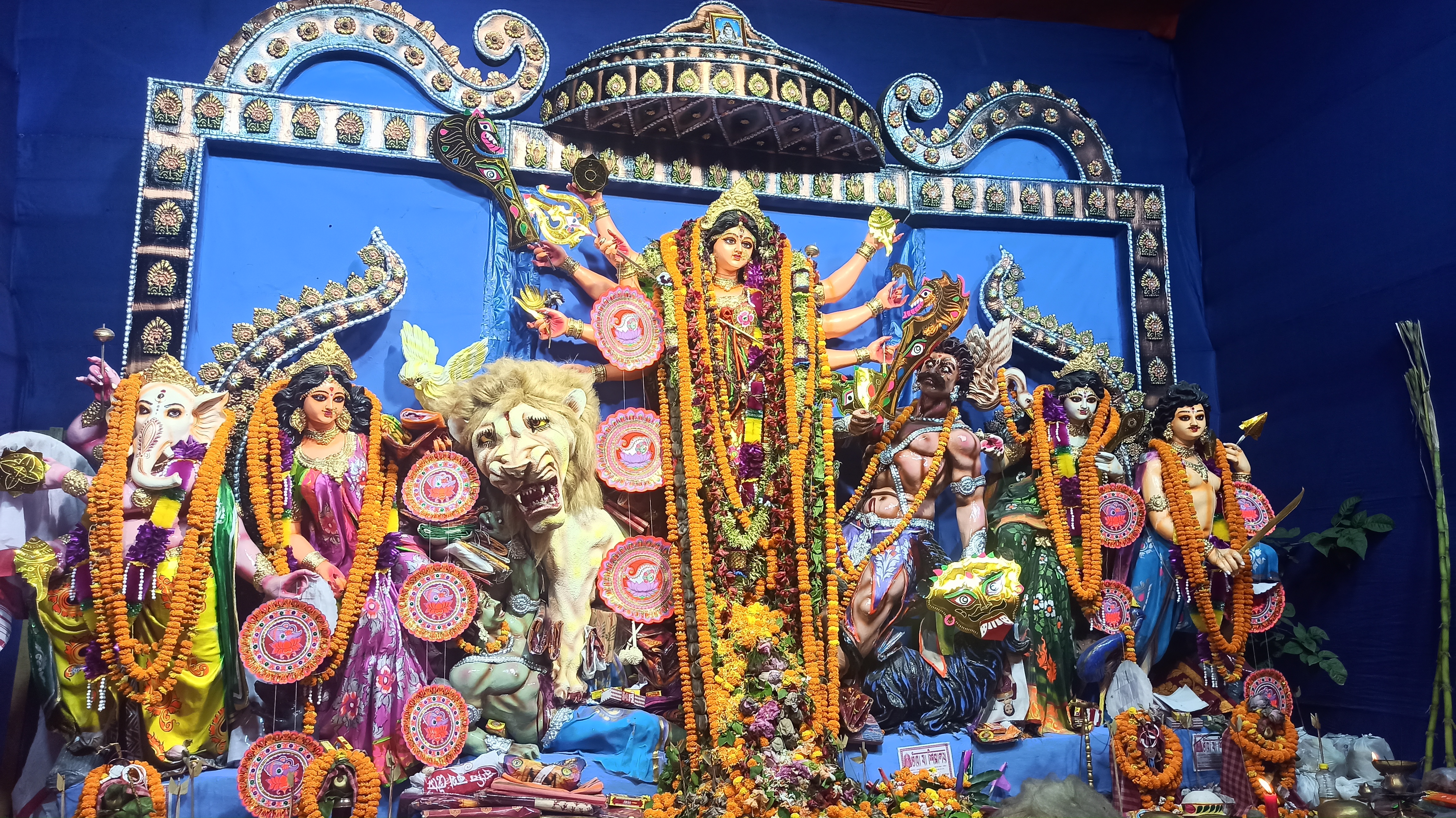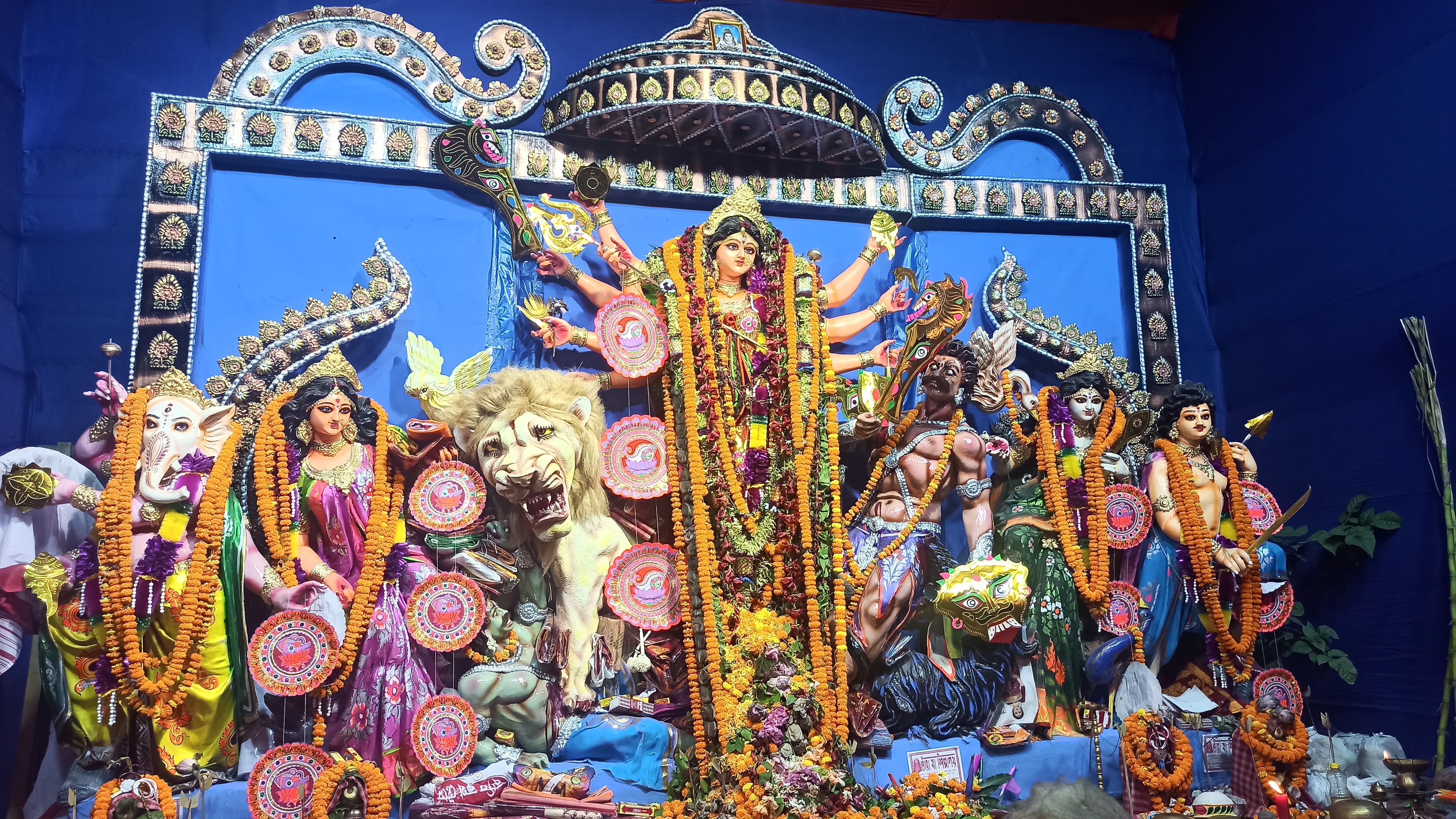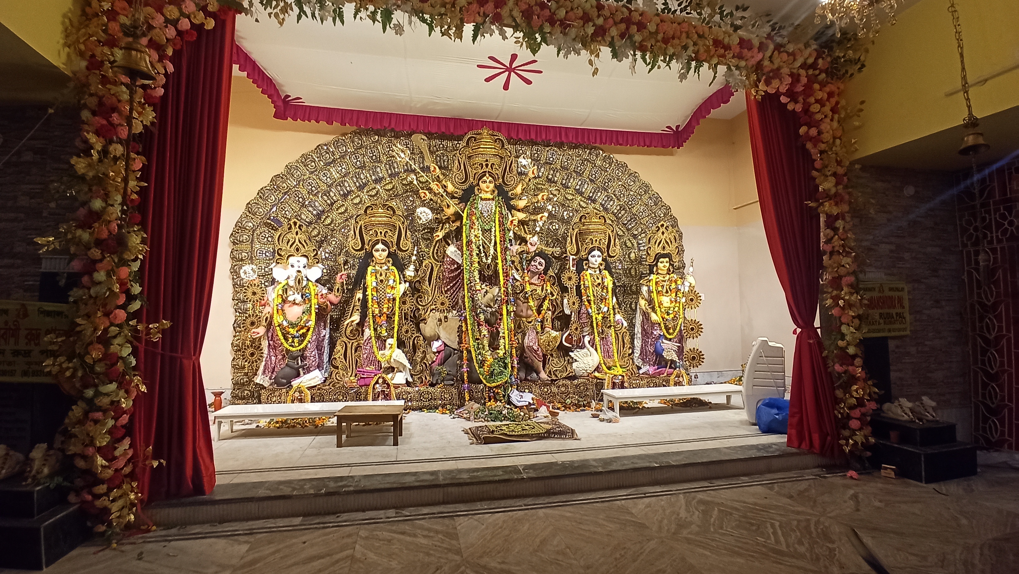 এটি মধ্যম গ্রাম চৌ মাথা মোড় রবার ফ্যাক্টরিতে তৈরি করা হয়েছে।ছোট ছোট কাগজের ফুল দিয়ে সাজানো হয়েছে। খুব একটা জাক জনক পূর্ন নয় তারপরও অনেক সুন্দর করে সাজানো হয়েছে। এত সুন্দর মায়ের মূর্তি তৈরি করেছেন শিল্পী হরিপদ পাল। বরণ করার আগের মুহূর্তের ফটোগ্রাফি।