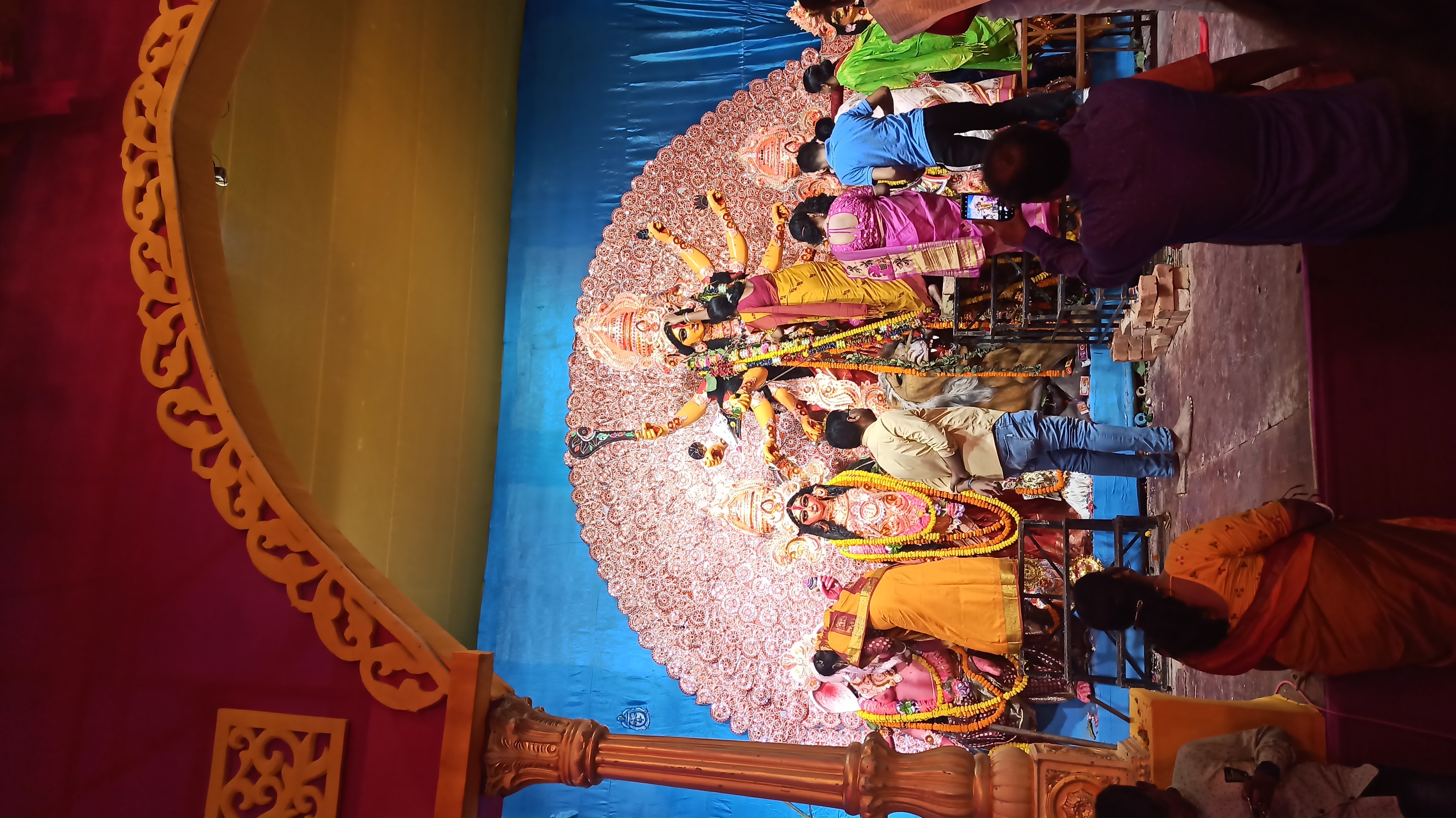 এখানে মাকে বিদায় দেওয়ার জন্য বরণ করা হচ্ছে। মাকে সিঁদুরে রাঙানো হয়েছে।