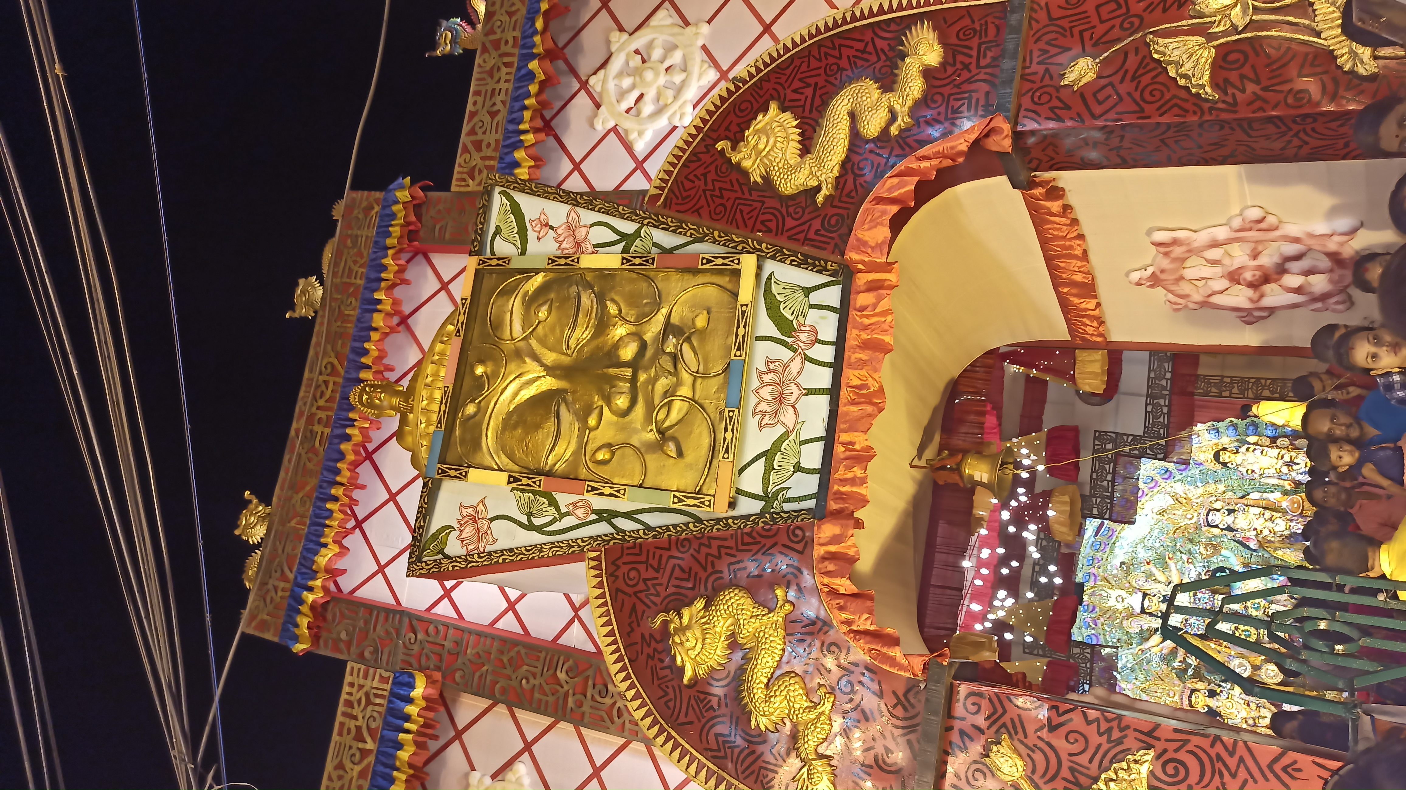 এই ড্রাগনের প্যান্ডেলটি করা হয়েছে কল্যাণী মোর লক্ষণপাড়া , মধ্যম গ্রাম। প্যান্ডেলের ভেতরে প্রবেশ করার সময় চোখে পড়বে দরজার দুই পাশে চক্র বানানো হয়েছে। পুরো প্যান্ডেলটি তৈরি করা হয়েছে কাপড় ও বাঁশ , বেত ও লাইটিং দিতে। আর দেয়ালের চার পাশে বুদ্ধের পেইন্টিং করা হয়েছে। যা দেখতে সত্যি অনেক সুন্দর লাগছে। আর মায়ের মূর্তি যেনো সোনার মত জল জল করছে।