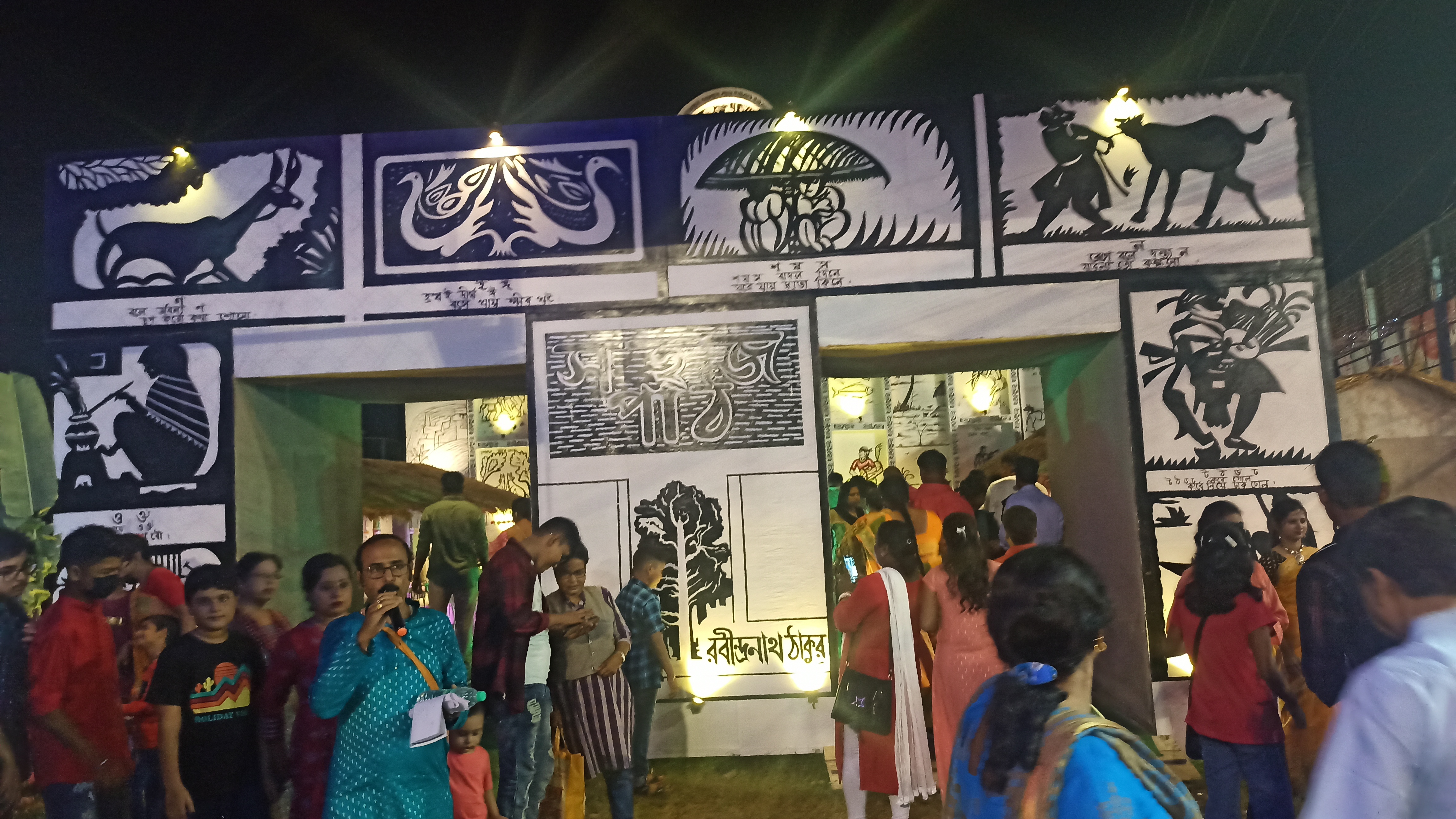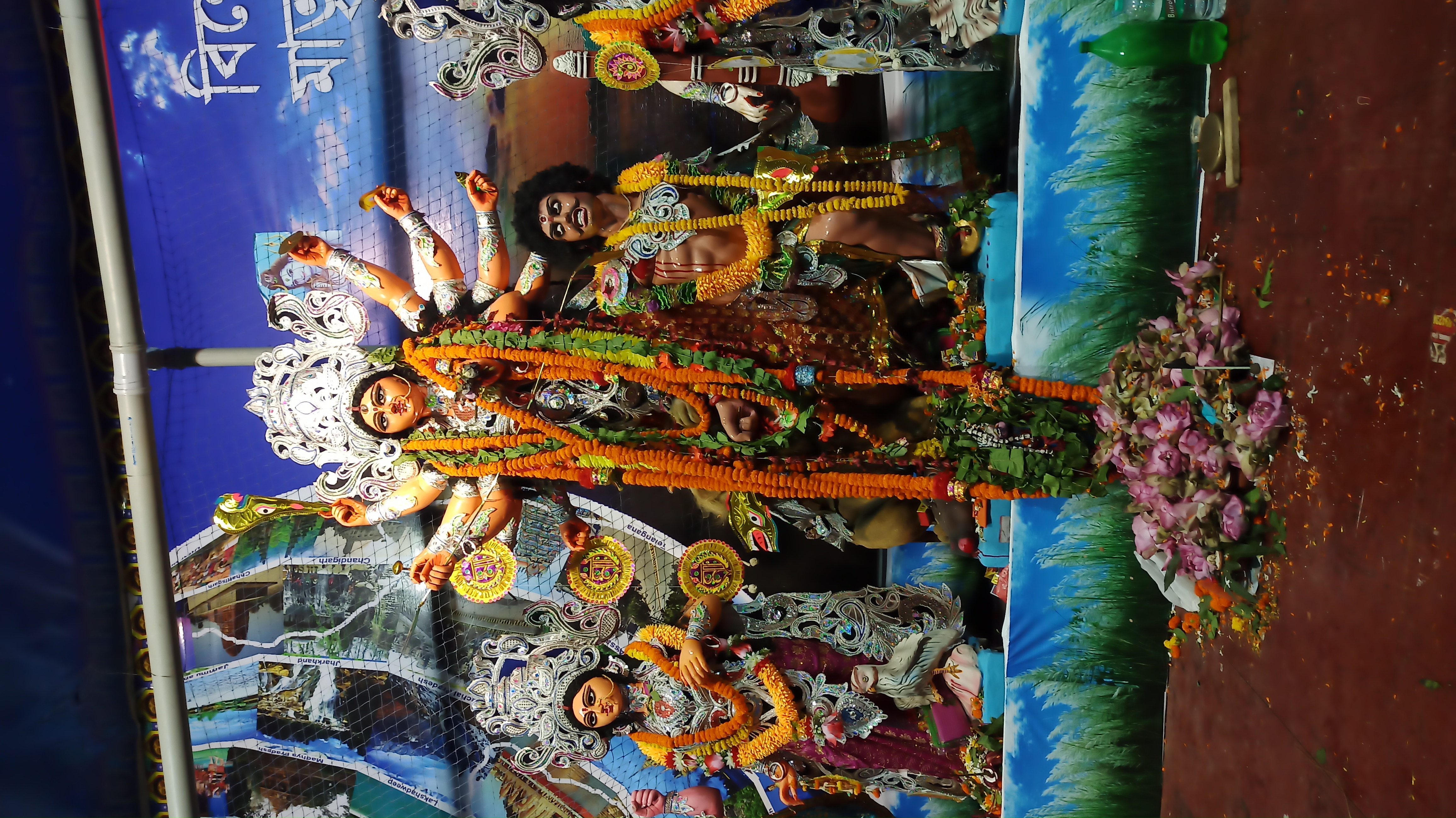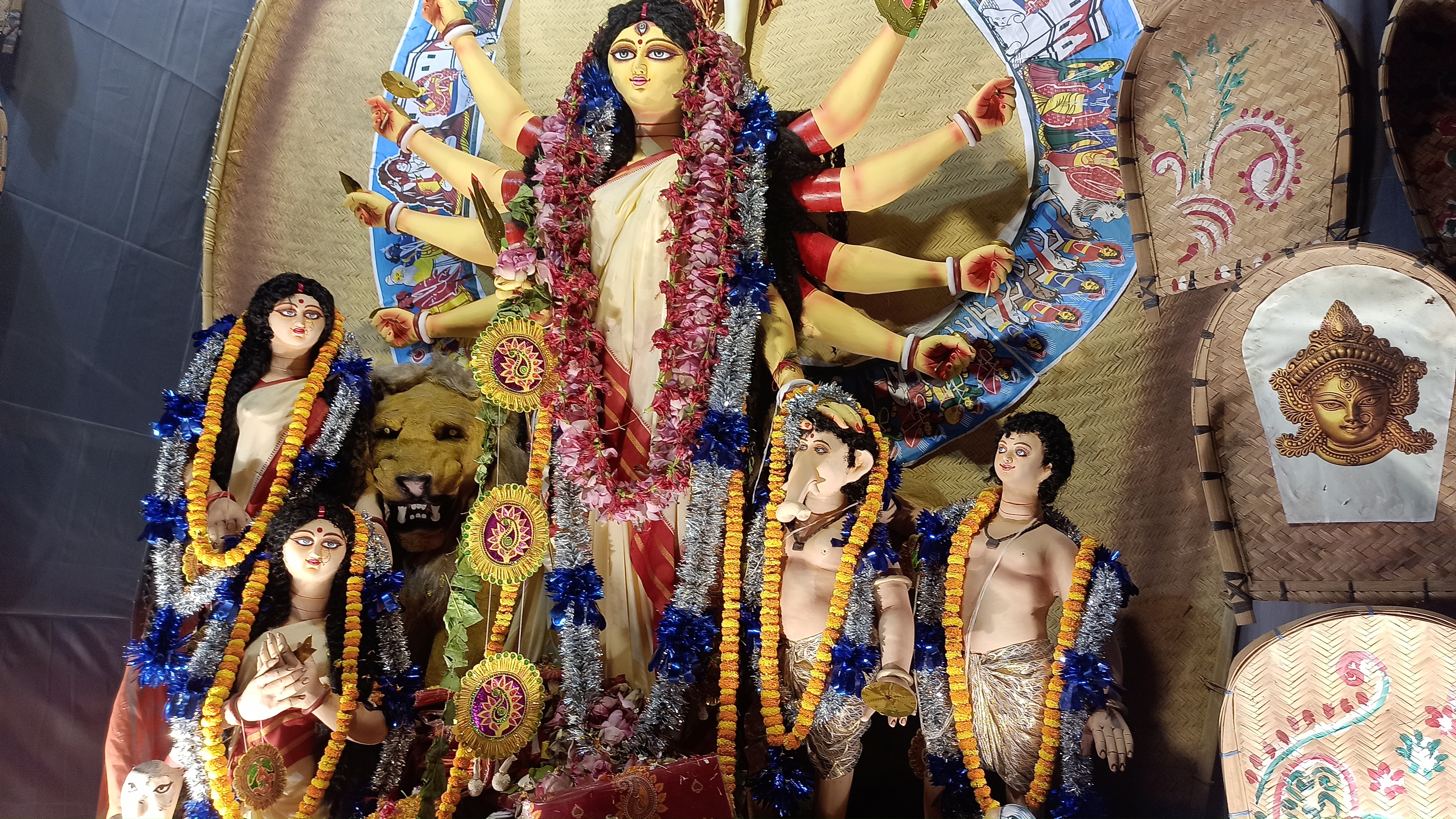 বারাসাত শেত পুকুর মানবতা ক্লাবের পক্ষ থেকে সার্বজনীন দুর্গোৎসব আয়োজন করা হয়েছে। এখানের প্যান্ডেল দেখলে সেই ছেলেবেলার কথা মনে পড়ে যায়। এখানে রবীন্দ্রনাথের সহজ পাঠের থিম বানানো হয়েছে। প্যান্ডেলের ভিতরে ঢুকতেই রবীন্দ্রনাথের মূর্তি চোখে পড়বে। প্যান্ডেলের ভেতরে দুপাশে ছোট ছোট মূর্তি বানানো হয়েছে সেগুলো পড়ে আপনাদের সাথে শেয়ার করছি। এরপর ভেতরে ঢুকতেই মায়ের তেজস্বী রূপ চোখে পড়বে। এত সুন্দর প্রতিমা তৈরি করেছেন শিল্পী মোহন বাঁশি রুদ্র পাল ও তপন রুদ্র পাল। প্যান্ডেলের ভেতরে চারপাশে। ছেলে বেলার সেই কারুকাজ করা।