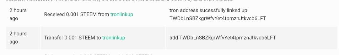 ১. ট্রন এড্রেস এড করার জন্য , @tronlinkup এই ওয়ালেট এ 0.001 steem পাঠাতে হবে, এবং মেমো তে add তারপর আপনার টি আর এক্স এড্রেসটি দিবেন । যেটা স্ক্রিনশট এর মাধ্যমে বলা আছে ।