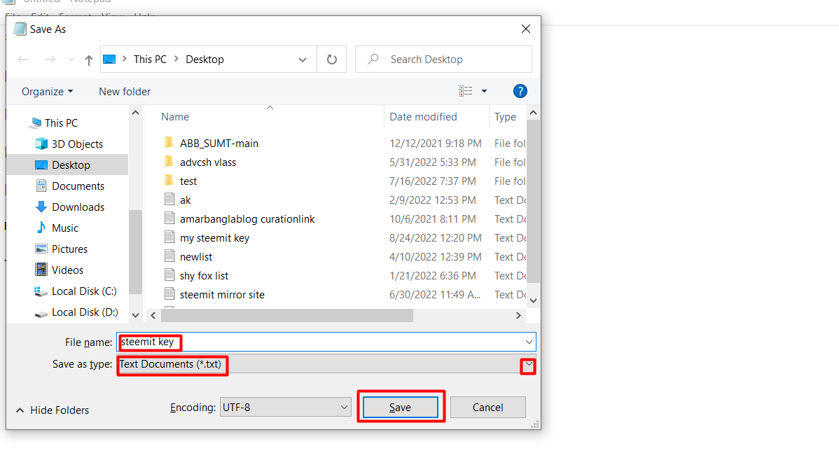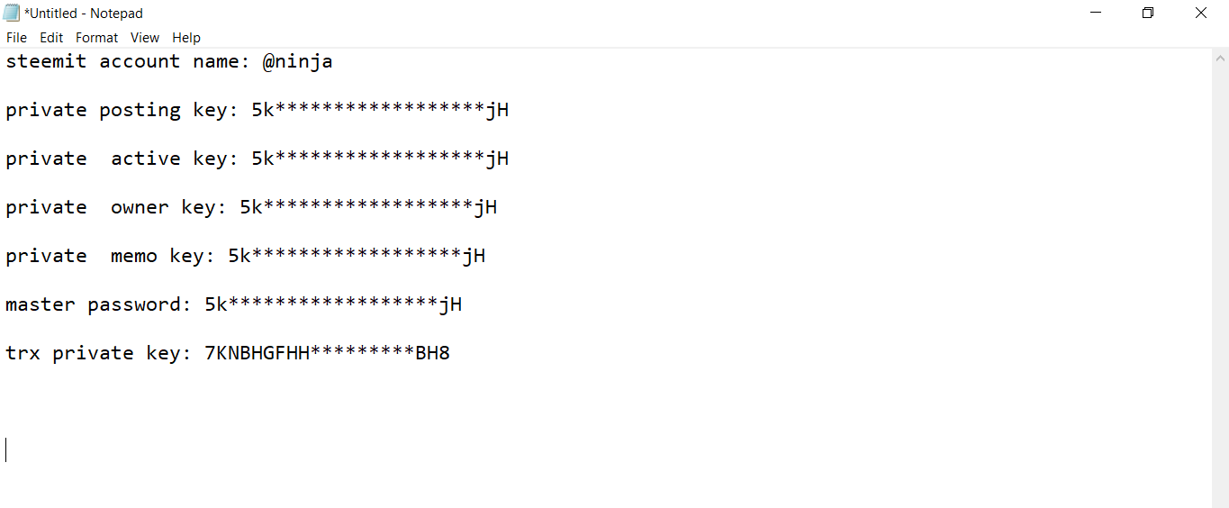 প্রথমে আমরা নোটপ্যাড সফটওয়্যারটি ওপেন করে । উপরের স্ক্রীনশটএর মত একটি ফরমেট সাজিয়ে steemit account name, private posting key, private active key, private owner key, private memo key, master password, trx private key গুলো টেক্সট আকারে লিখব ।