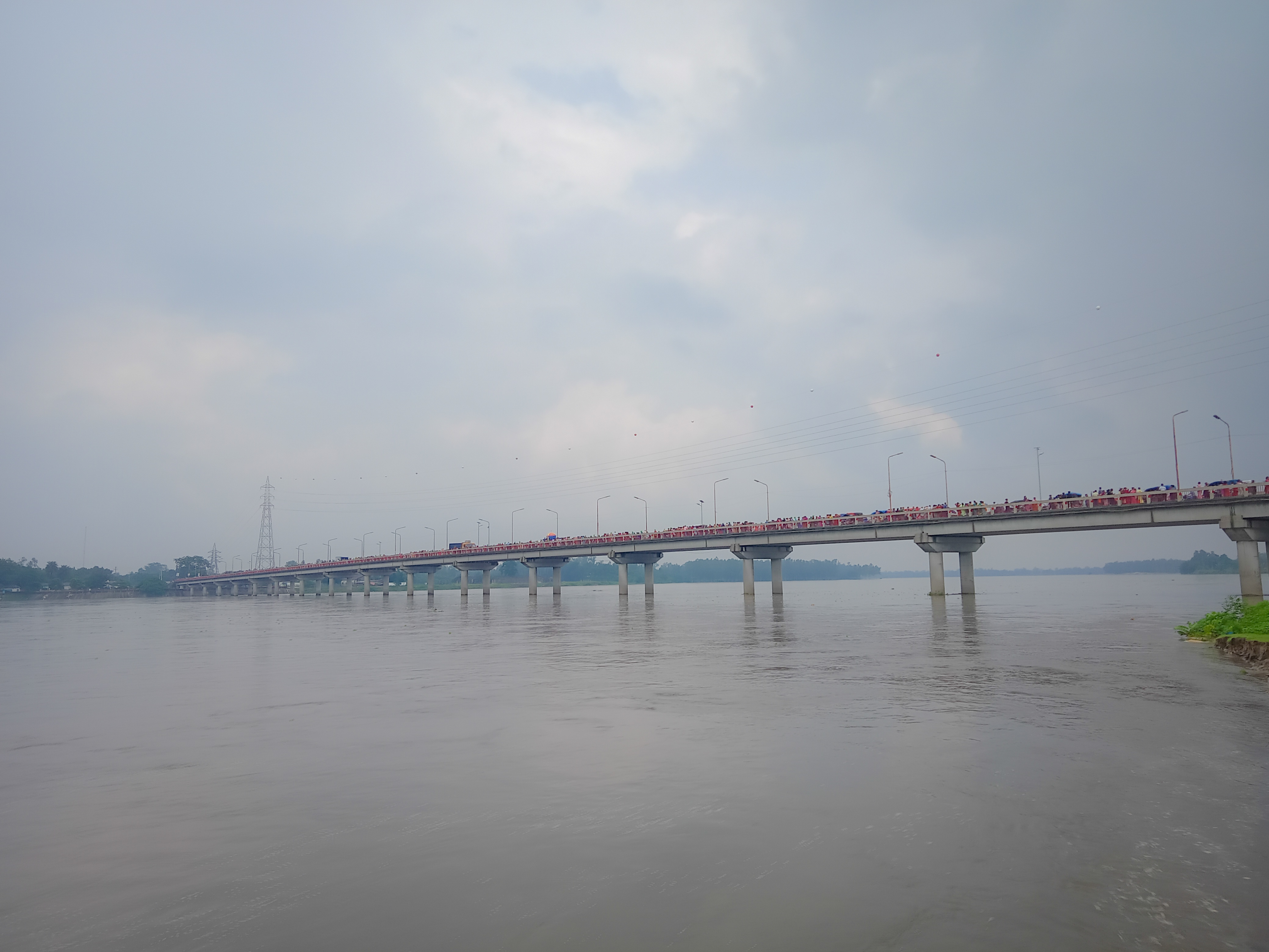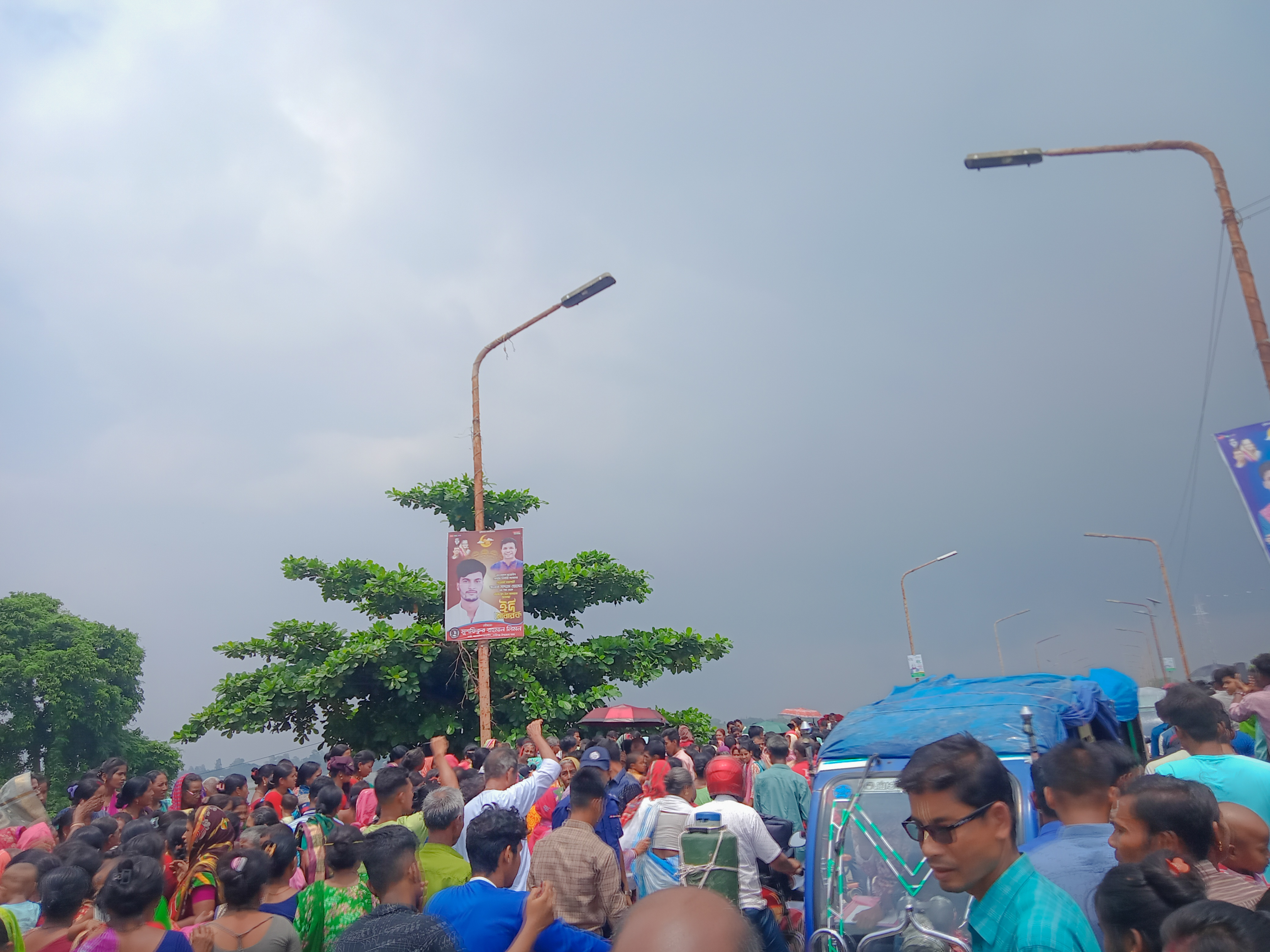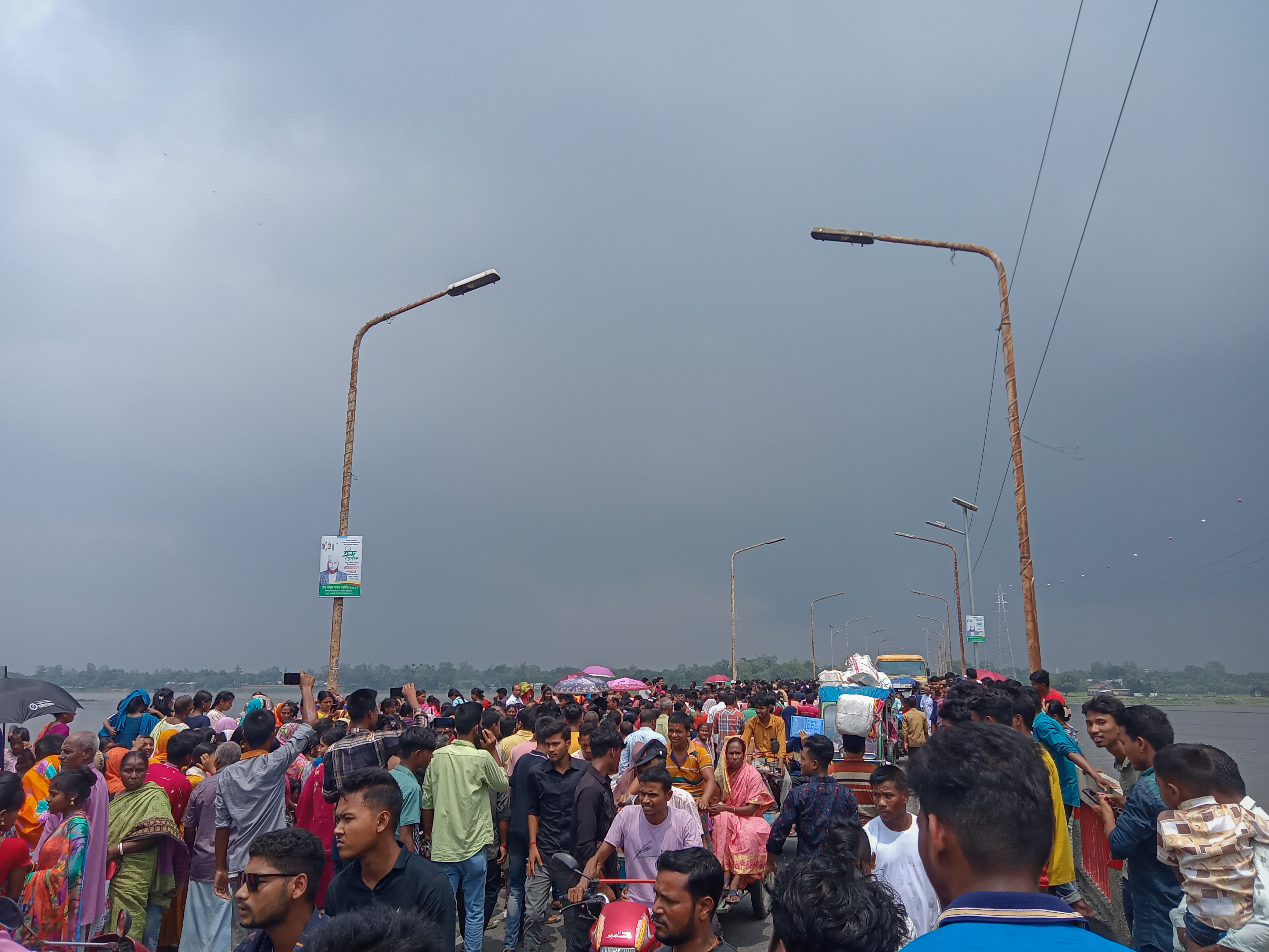এটা করতোয়া নদী ৷ কয়েক দিনের বৃষ্টিতে নদীর পানি অনেকটাই বেড়েছে ৷ নদীর ধার গুলো ভেঙ্গে ভেঙ্গে পড়ে যাচ্ছে ৷ আর ভরা নদীর স্রোতও বেশ ভালোই যাচ্ছে ৷ নদীর পাড়ে বসে এসব সৌন্দর্য উপভোগ করছি ৷ কিছুক্ষণ পরই প্রসাদ খাওয়া শুরু হলো ৷ নদীর ধারেই প্রসাদ খাওয়ার ব্যবস্থা করা হয়েছে ৷ বসলাম প্রসাদ খেতে , প্রসাদ দেওয়ার আগে শুর হলো বৃষ্টি ৷ উঠে পড়লাম , বৃষ্টি হচ্ছে ৷ বেশ ভালোই লাগছে ৷ সকাল থেকেই মেঘলা আকাশ তবে বৃষ্টি নেই ৷ তবে এবার মেঘ গুলো মন খুলে কিছুটা সময় বৃষ্টি দিয়ে থেমে গেলো ৷ আবার বসে বড়লাম প্রসাদ খেতে ৷ এতো মানুষের মাঝে প্রাসাদ খাওয়া , সময় কাটানো , ঘুরে বেড়ানো , নদী আর বৃষ্টির সৌন্দর্য্য উপভোগ করা ৷ সবটাই যেনো দারুণ ছিলো ৷ ভীষণ ভালো লেগেছে প্রতিটা মুহূর্ত ৷