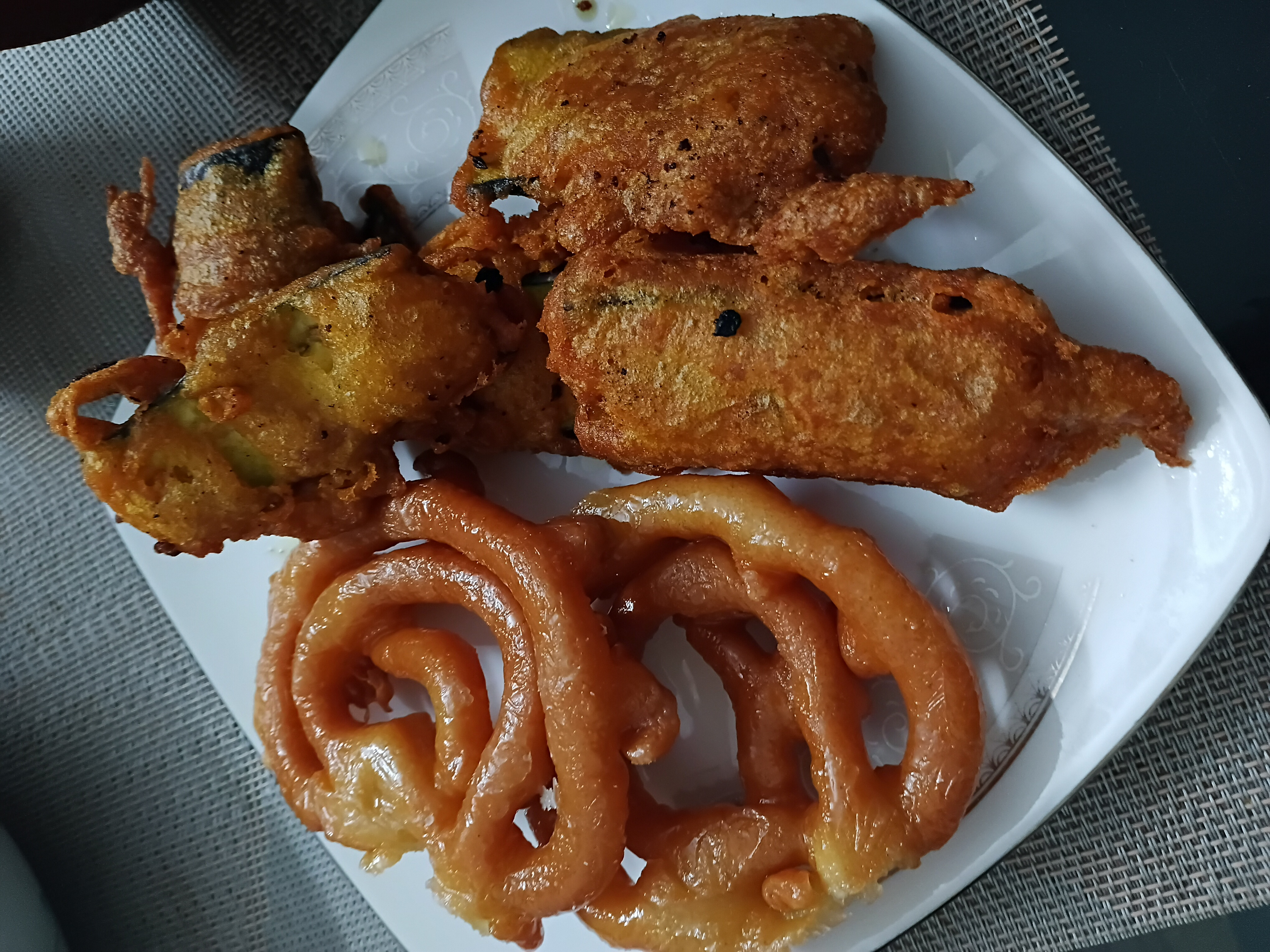 আমি ডিম সিদ্ধ ও ইফতারে রেখেছিলাম।আর কিছু ফল কেটে দিয়েছিলাম।এরপর আলুর চিকেন চপ, সমুচা, বেগুনি,পেঁয়াজু,ছোলা ভুনা সবকিছু ই তৈরি করে নিয়েছিলাম অল্প অল্প করে।প্রথম ইফতার খুব সুন্দর মতো ই করা হয়েছিল।হাসবেন্ড আর ছেলে ইফতারের প্রতিটি আইটেম খুব সুন্দর পছন্দ করেছিল।আমরা মিষ্টি খাবার খুব একটা পছন্দ করিনা।আর ইফতারের পর তো আরো করিনা।কিন্তু হাসবেন্ড খাওয়ার পর মিষ্টি খাবার খেতে পছন্দ করেন।তাই নিজের জন্য জিলাপি নিয়ে এসেছিল।