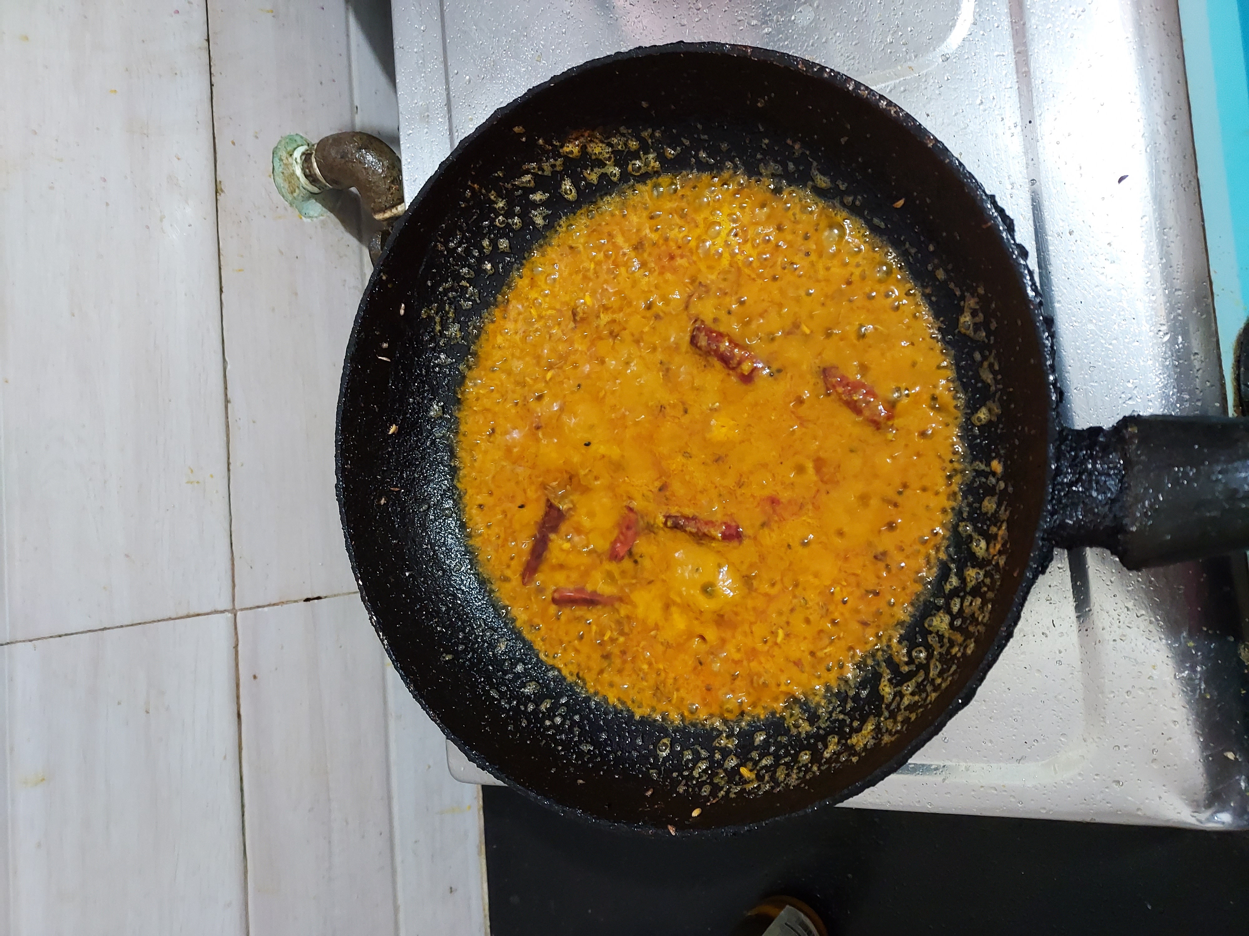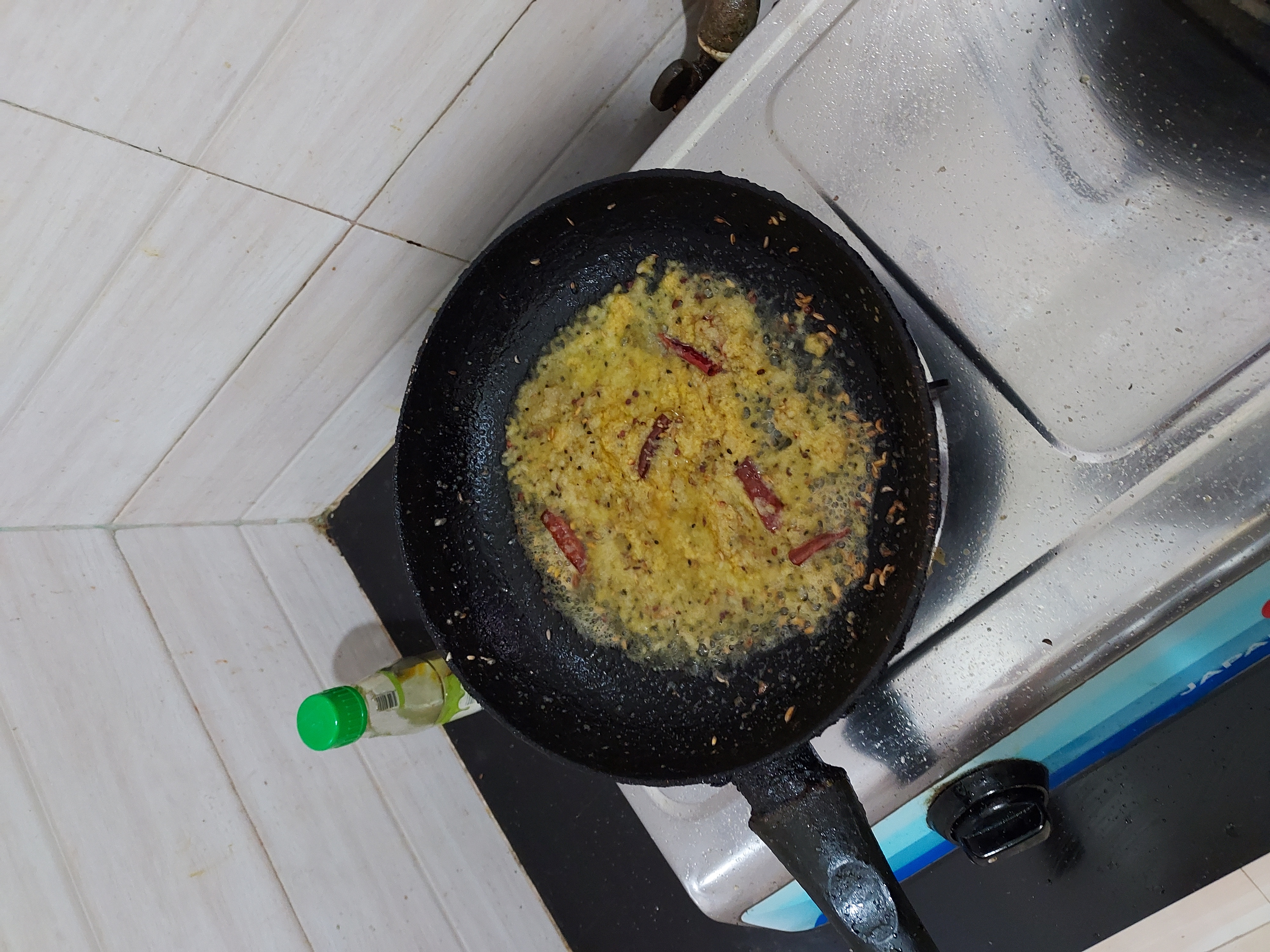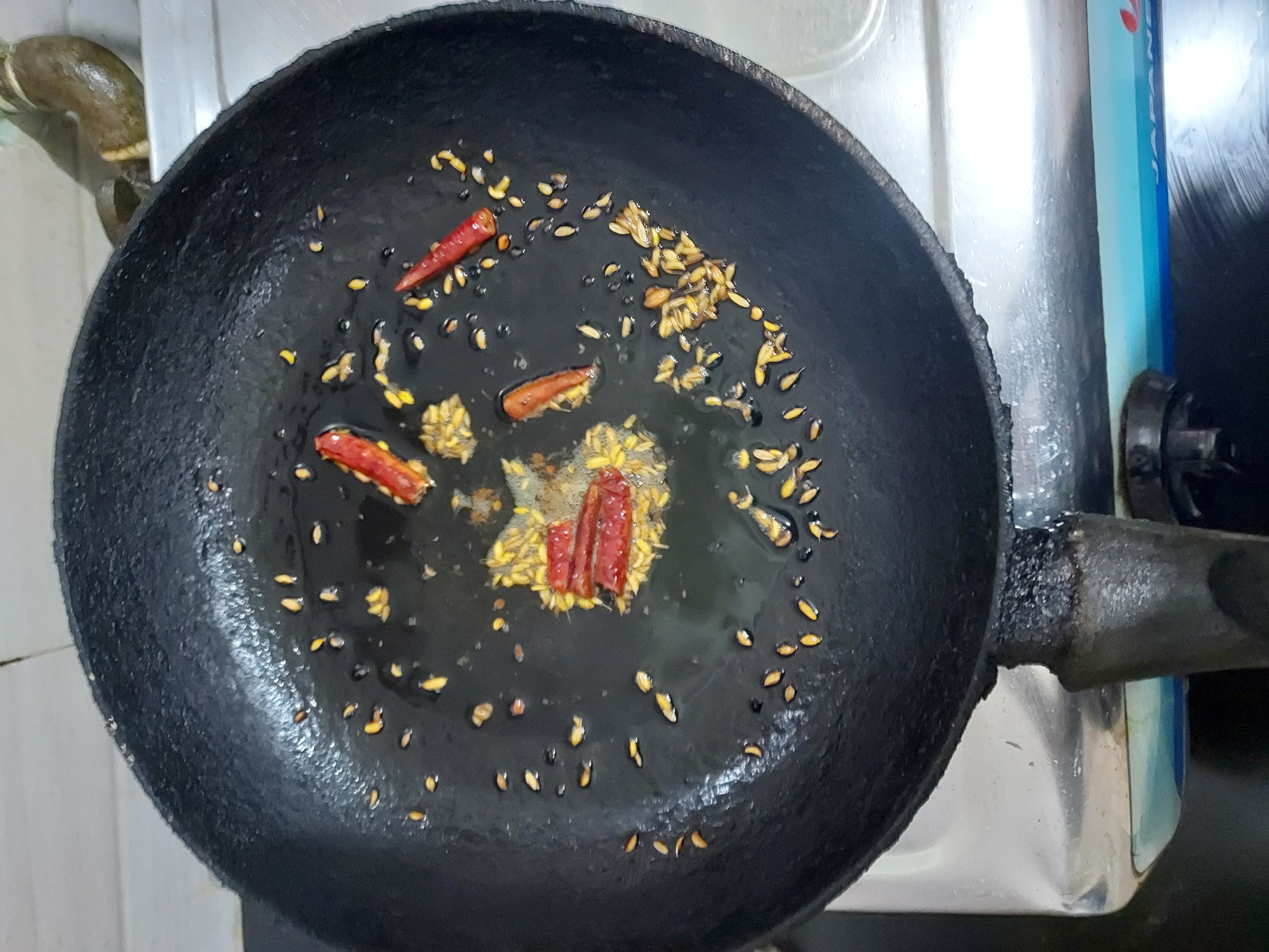 তৃতীয় ধাপঃ ফ্রাই প্যানে পরিমান মত সরিষার তেল দিতে হবে। তেল গরম হলে তাতে আধা চা চামচ গোটা পাঁচফোড়ন, ৩টি শুকনো মরিচ দিয়ে ফোড়ন দিতে হবে।