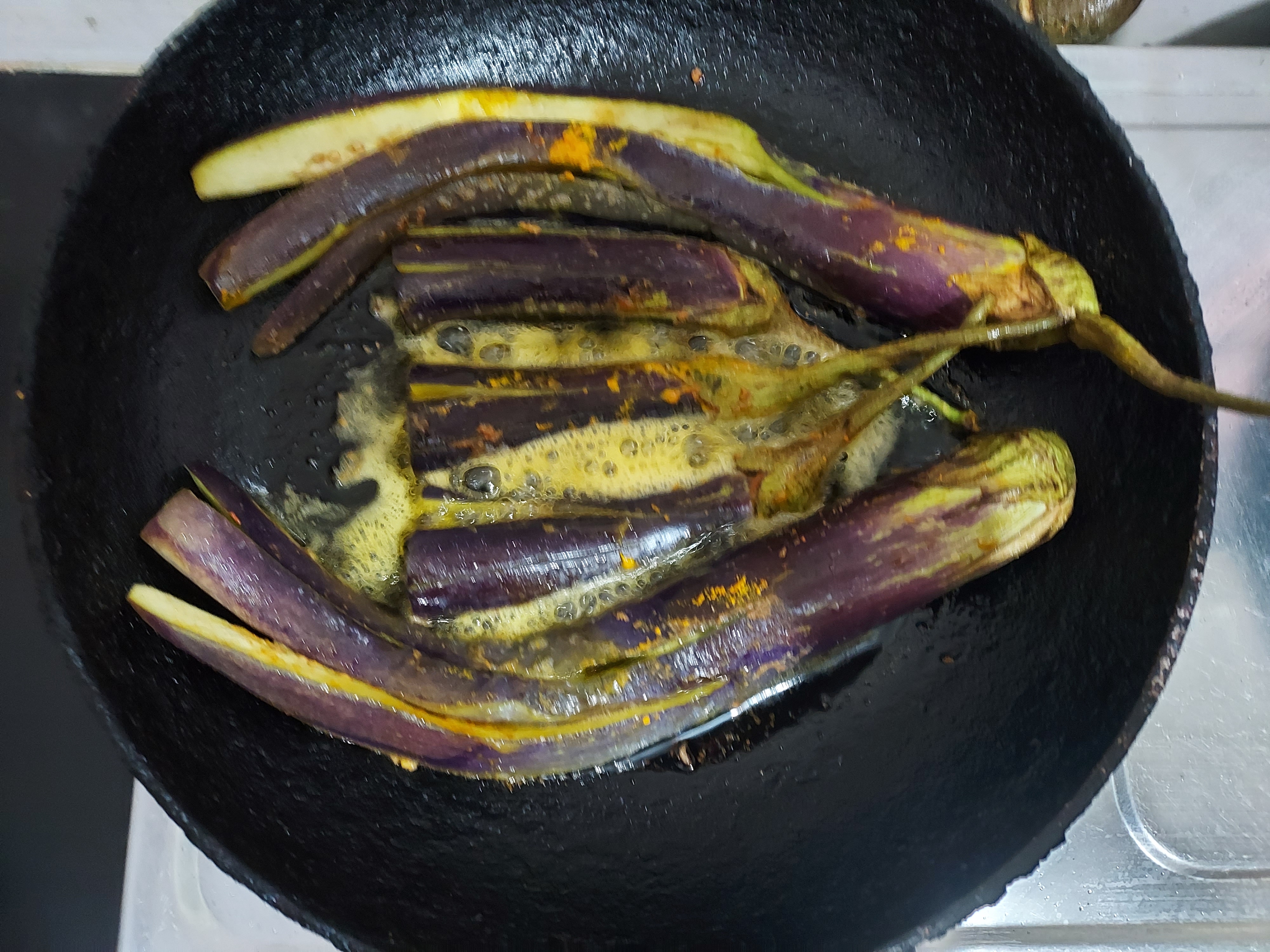 দ্বিতীয় ধাপঃ কাটা বেগুন গুলোতে একটু খানি হলুদ গুড়ো