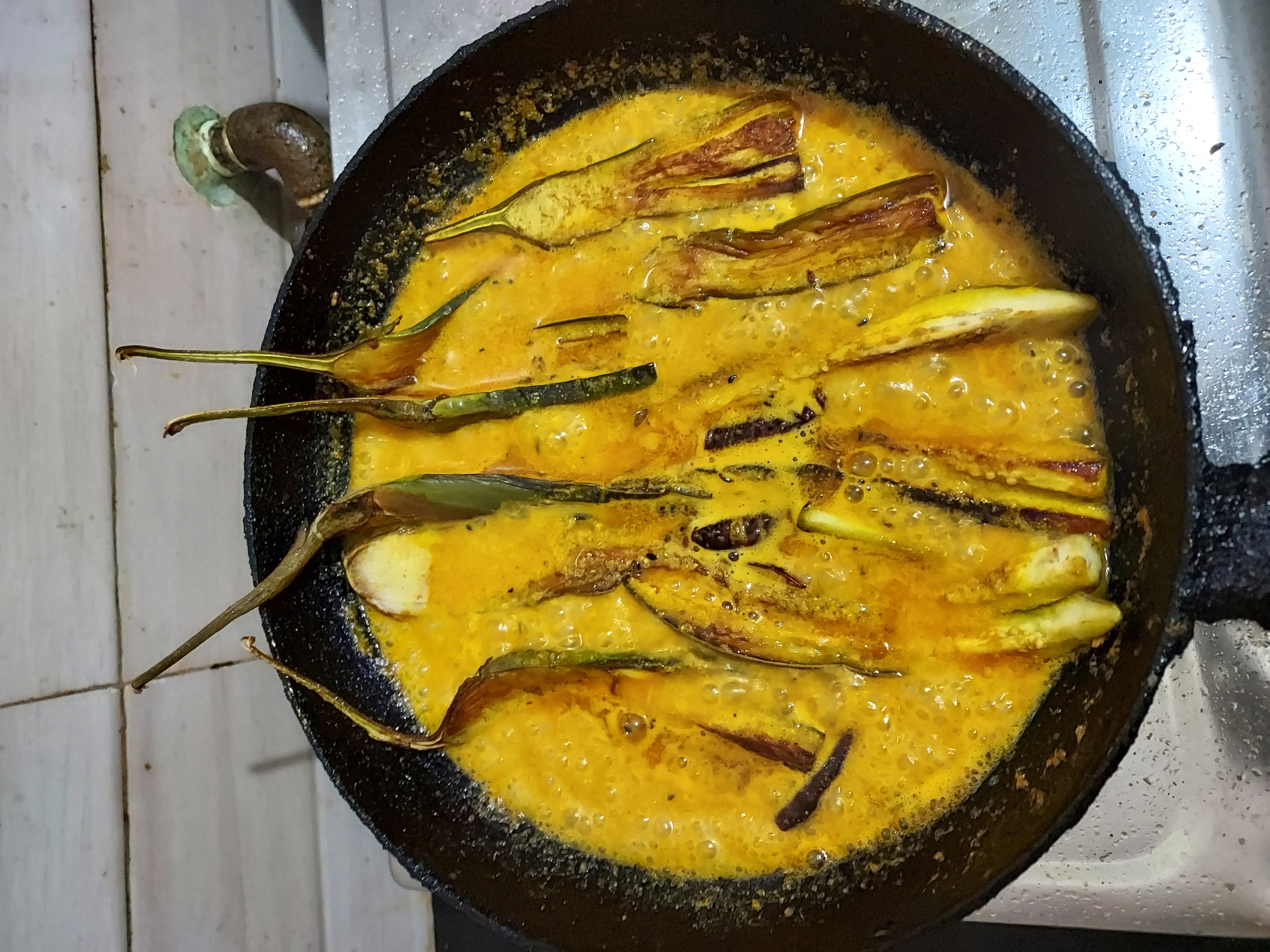 পঞ্চম ধাপঃ পানি শুকিয়ে গেলে তাতে আধা কাপ টক দই দিয়ে দিতে হবে। টক দই মশলার সাথে মিশে ফুটতে শুরু করলে তাতে ভেজে রাখা বেগুন গুলি দিয়ে দিতে হবে