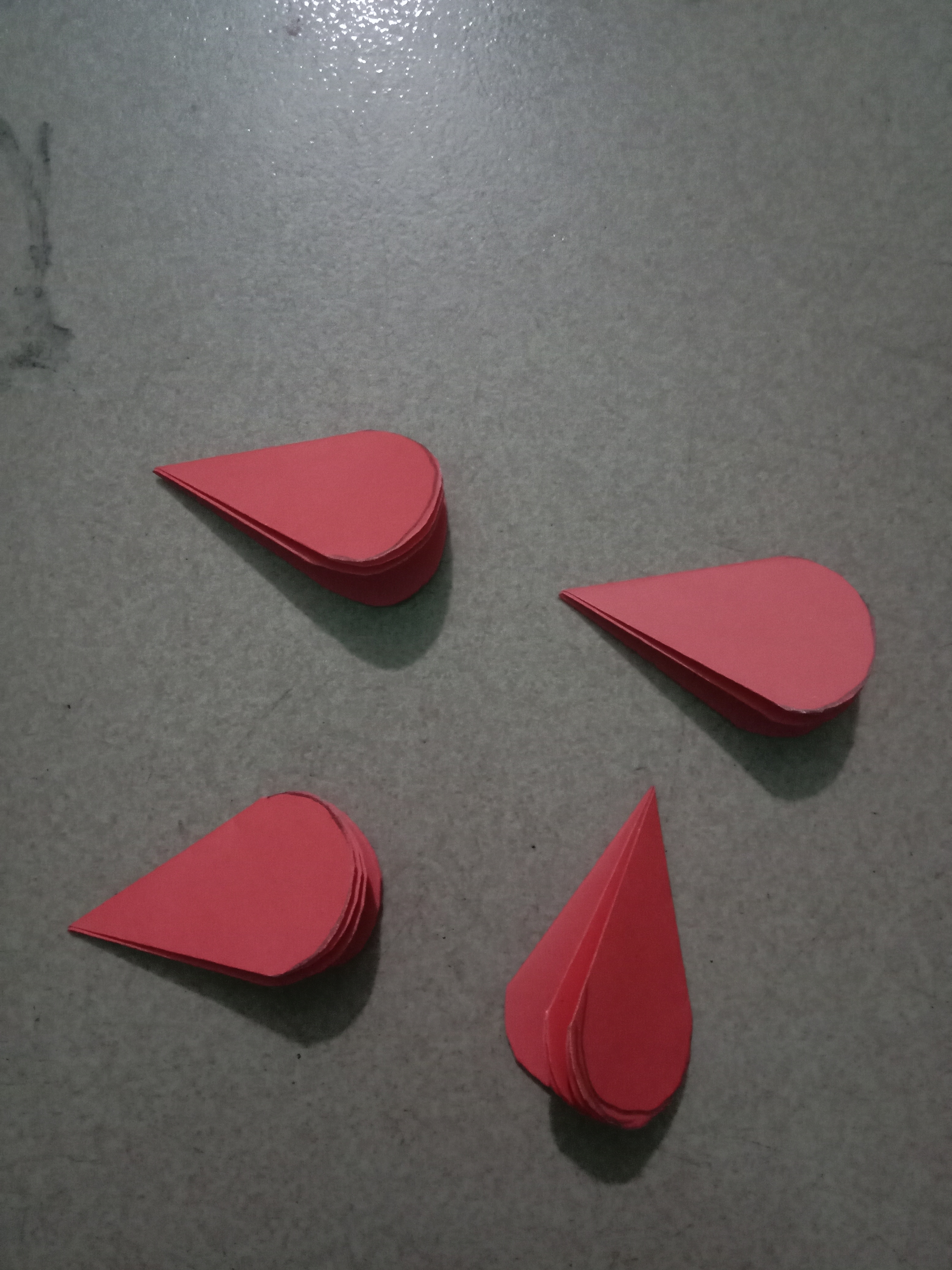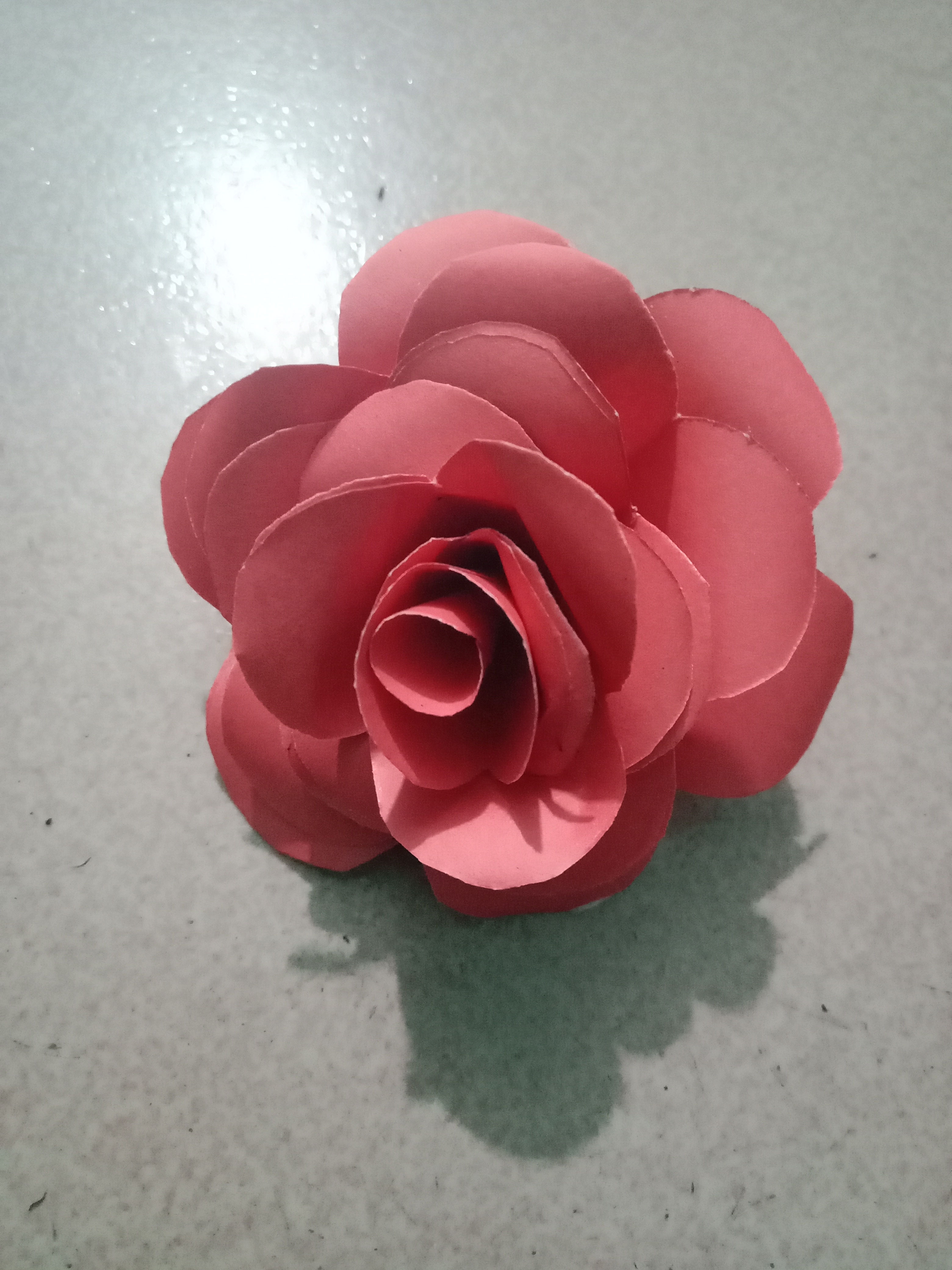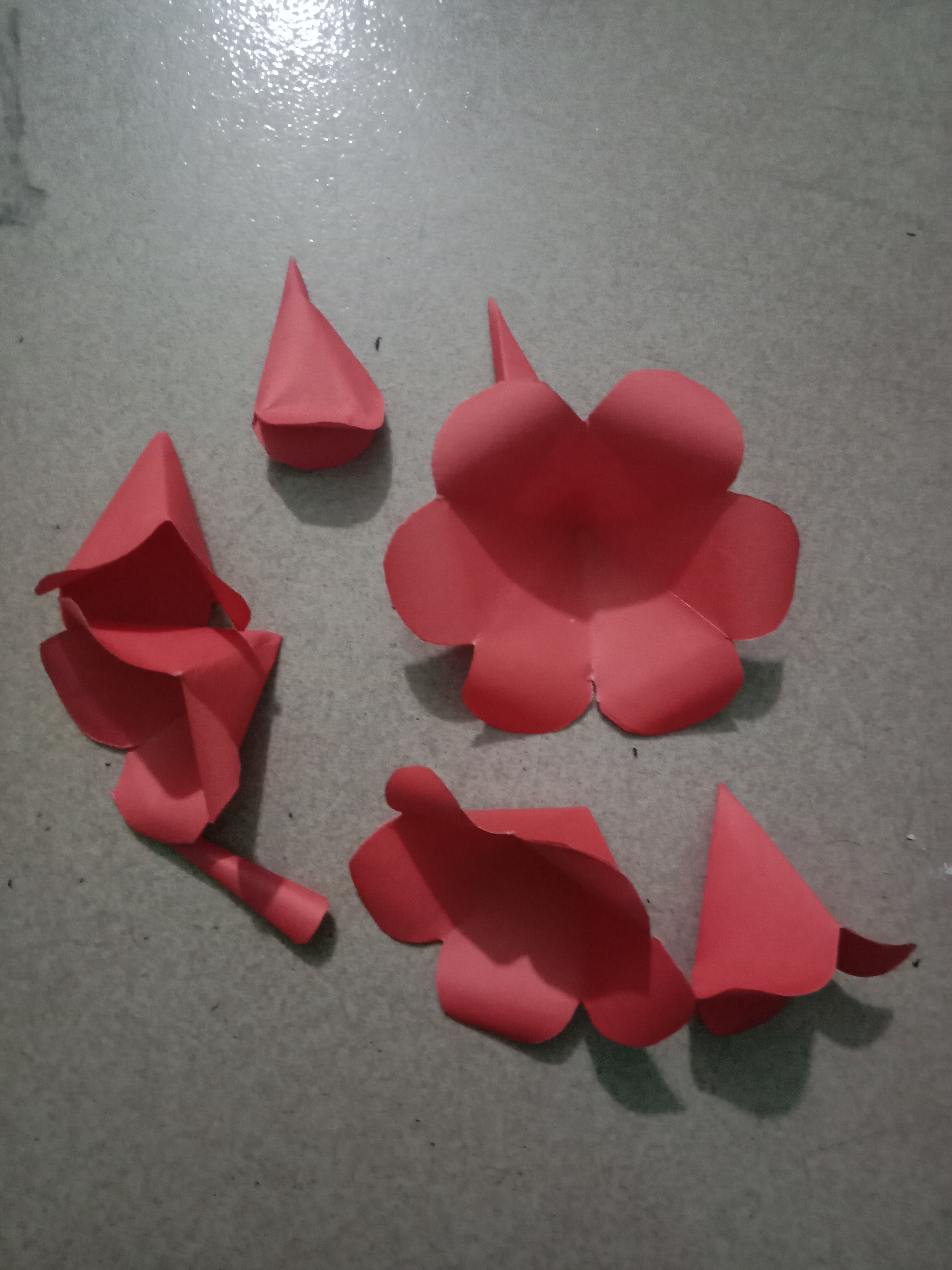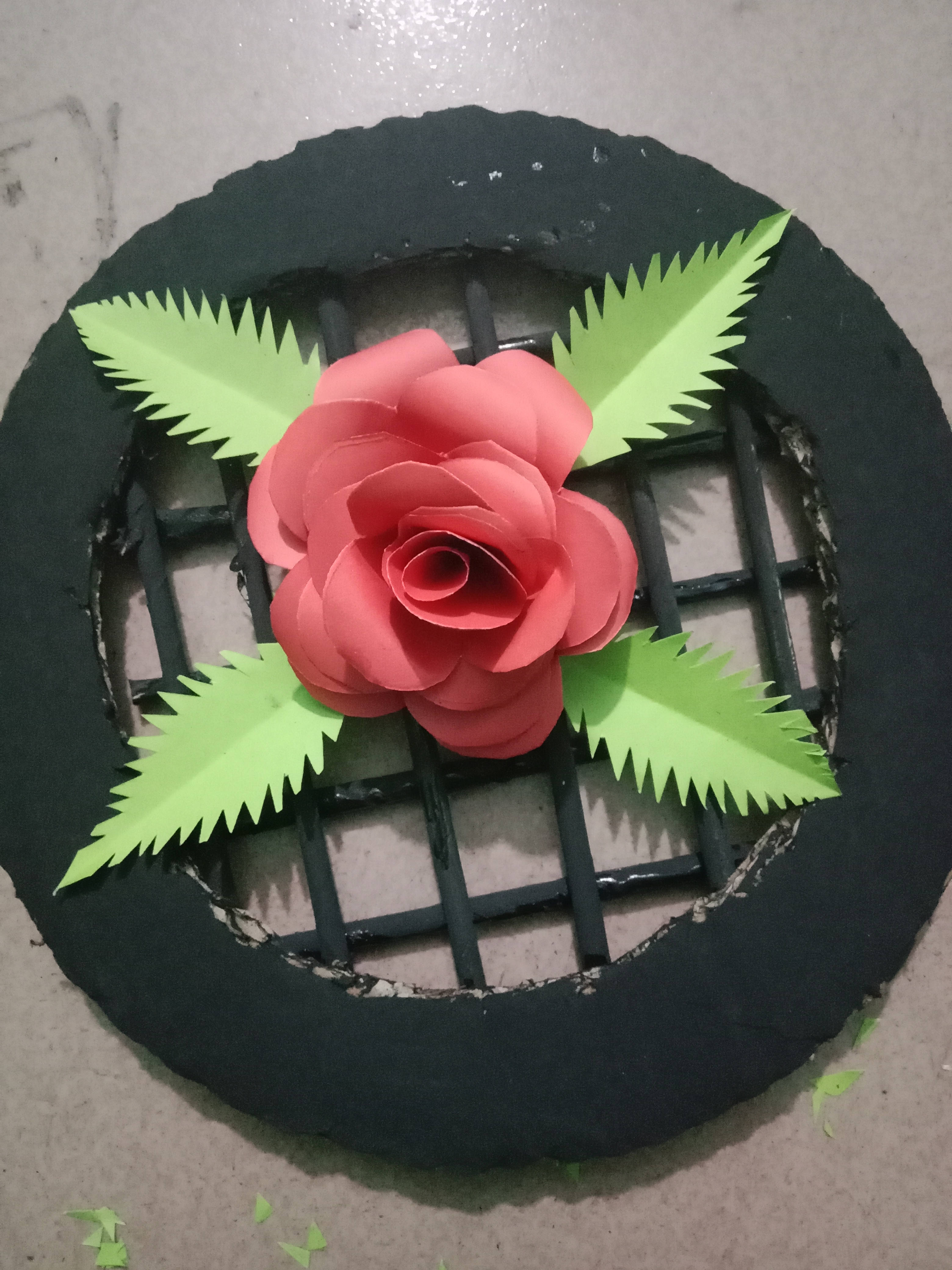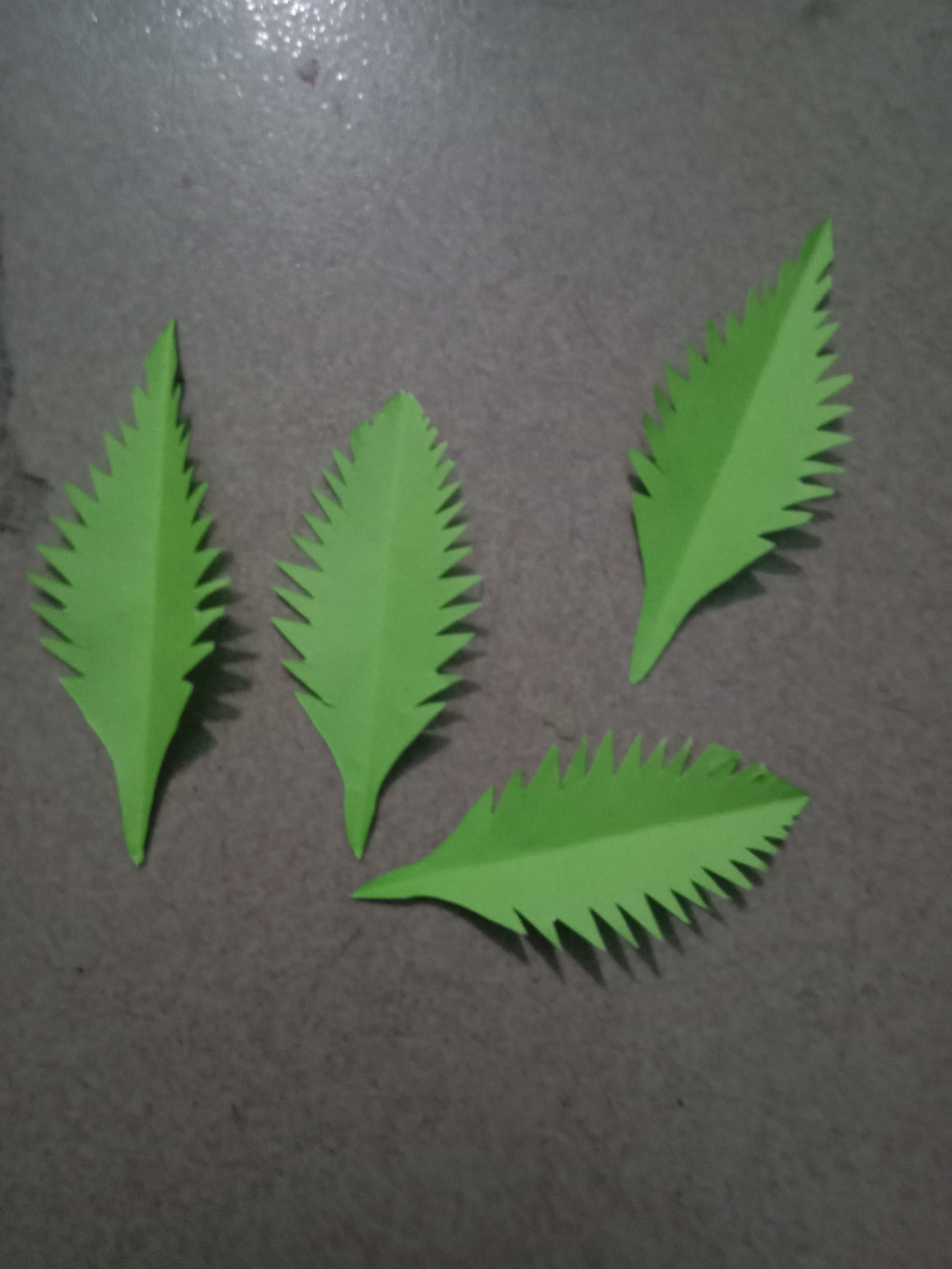 এবার সবুজ পেপার দিয়ে পাতা বানিয়ে নেবো। এরপর গোলাপ ফুলের চারপাশে চারটি লাগিয়ে নেবো।