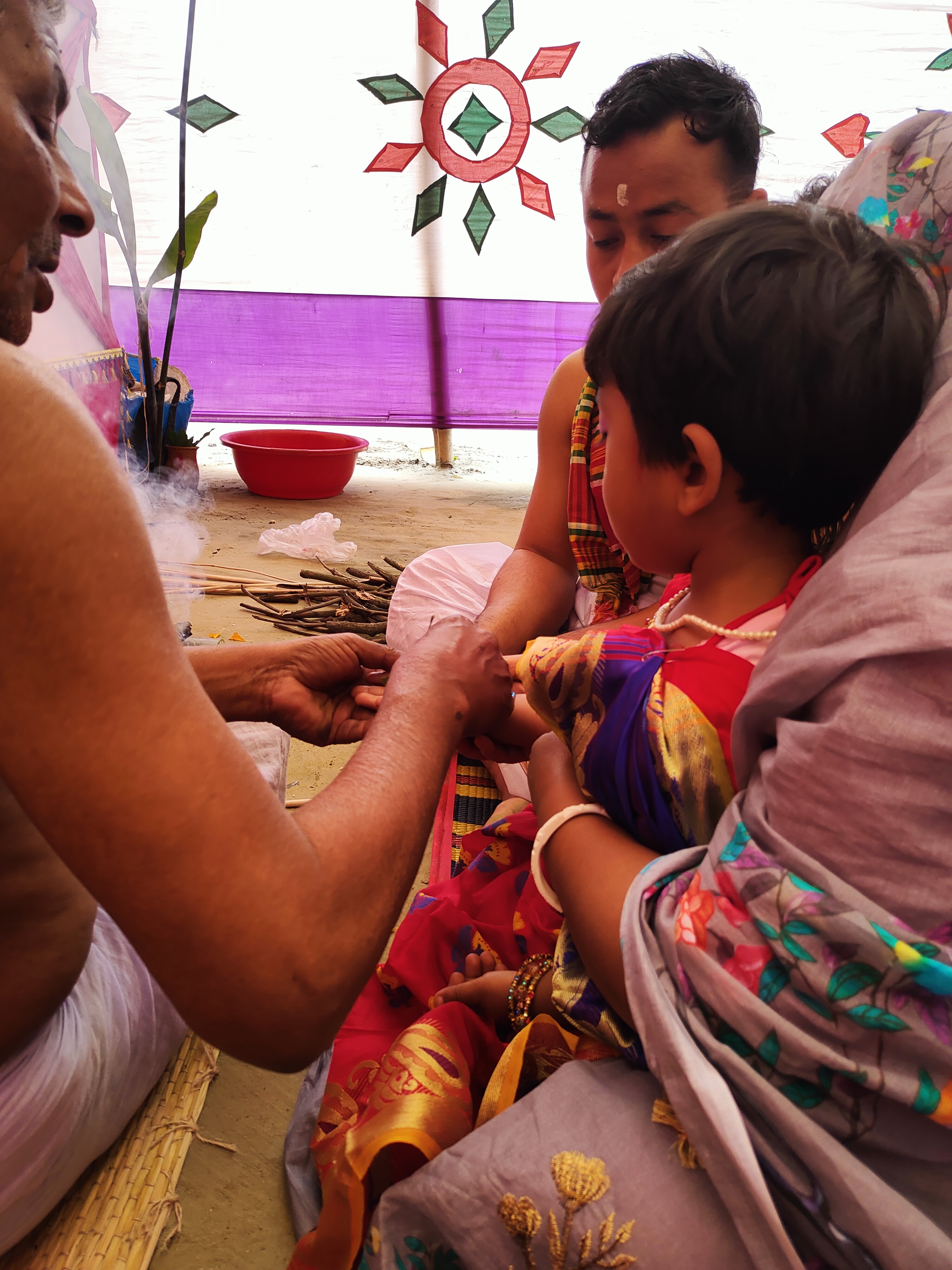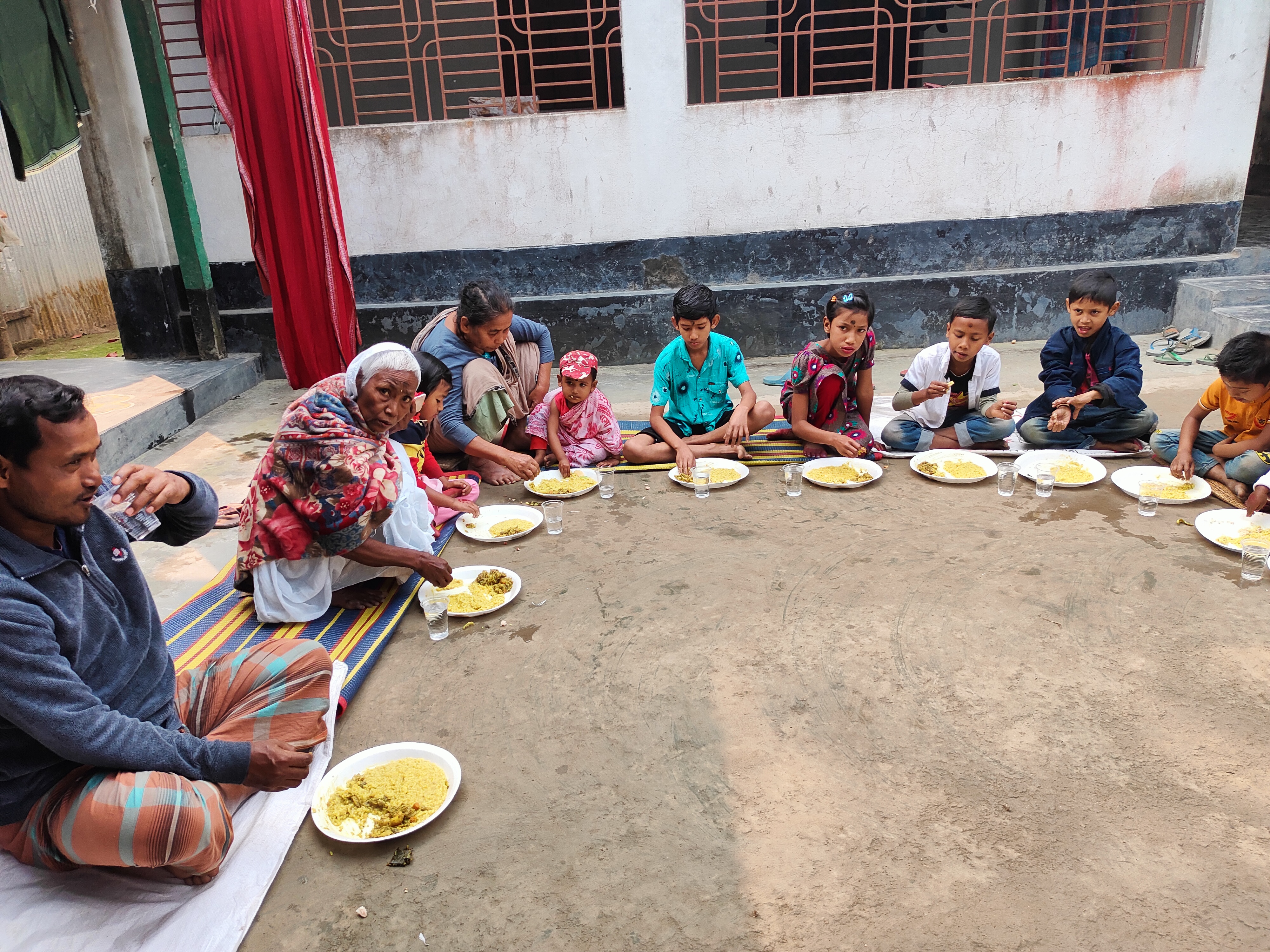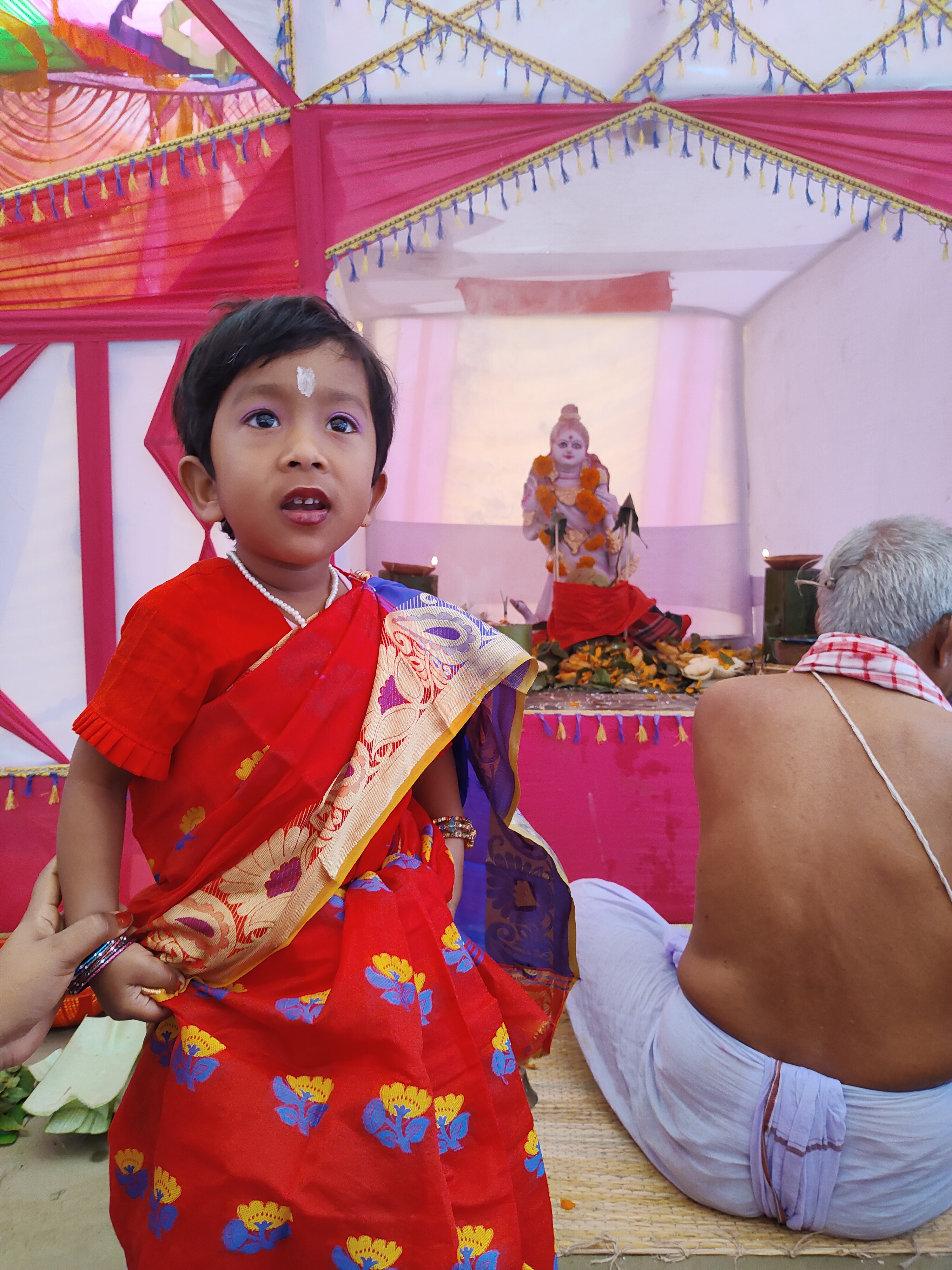 উপরের শাড়ি পড়া ছোট্ট পরীটাই তিনি, যার জন্য স্পেশাল এই আয়োজন। তো পূজো, হাতেখড়ির পর্ব সব ভালোয় ভালোয় শেষ হয়েছে। আর নিচের ছবিতে আমরা আমাদের বাড়ির তিন বউ। মানে আমার শ্বাশুড়ি আর আমরা দুই বউ। আমাদের শ্বশুড়বাড়িতে যে কোন আয়োজনেই মানুষ খাওয়ানোর যেন ধুম পরে যায়! আর প্রায় সারা গ্রামের মানুষ ই কোন না কোন সময়ে এসে প্রসাদ নিয়ে যান। তাই এলাহি কান্ড বলা চলে৷ সারাদিন জুড়েই এমনকি সন্ধ্যা পর্যন্ত চলতে থাকে প্রসাদ খাওয়ার ব্যবস্থা।