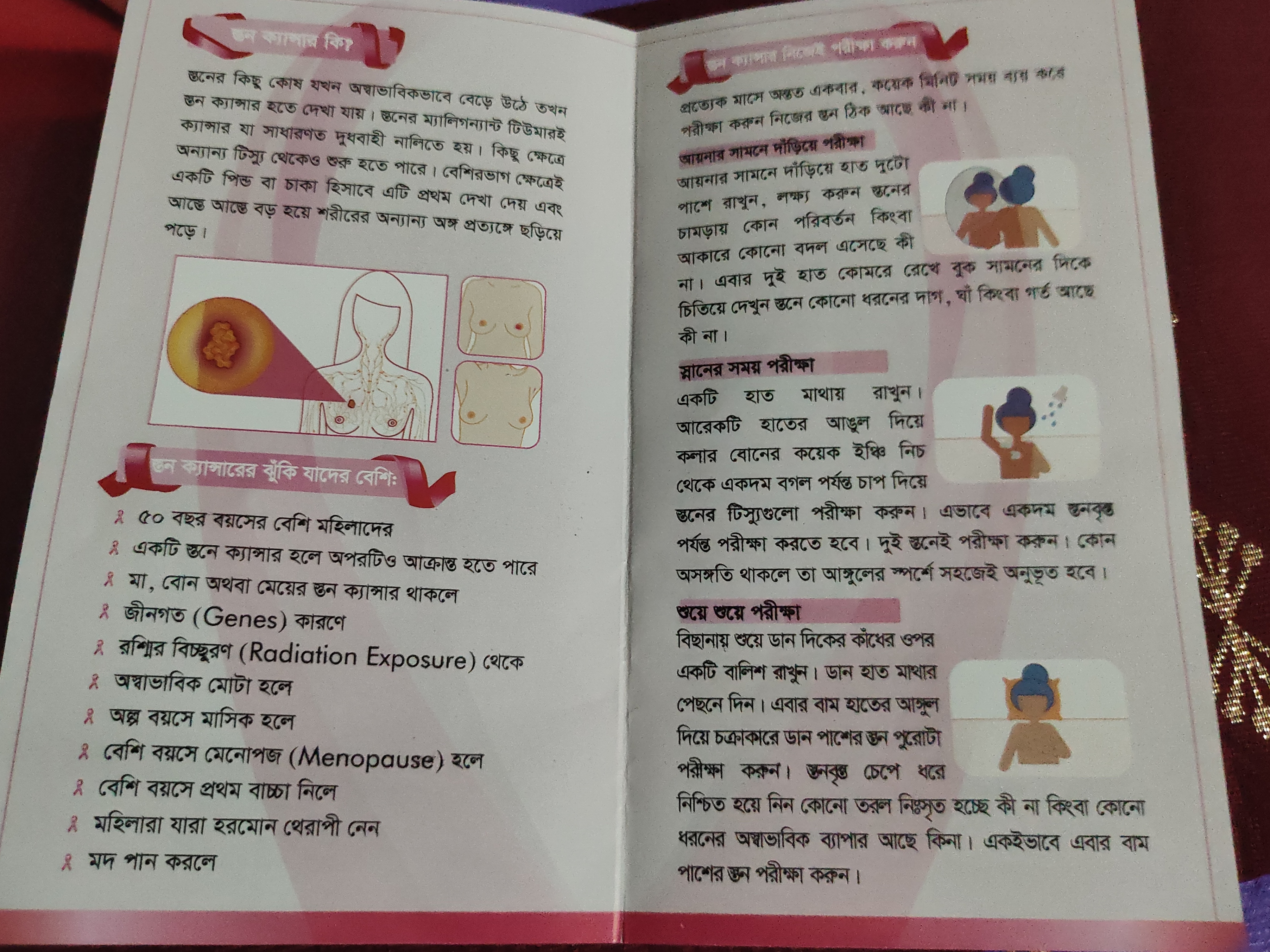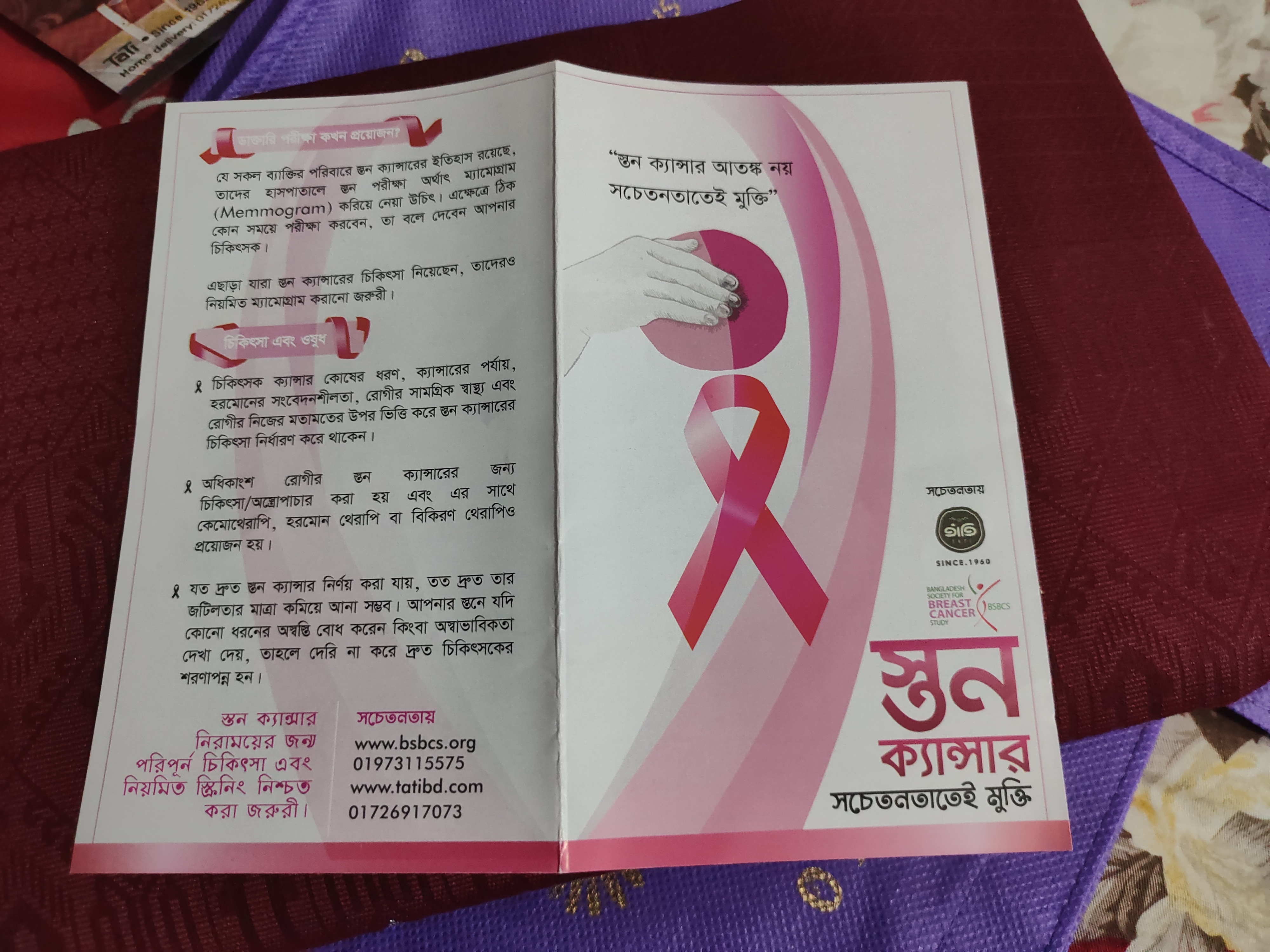 আজকে এই নিয়ে আলোচনার আসল কারণ হচ্ছে অপ্রত্যাশিত ভাবে একটি উদ্যোগ দেখে ভালো লেগেছে, তার থেকেই অনুপ্রেরণা নিয়েই মনে হলো এই বিষয় এই কিছু লেখা উচিত। মূলত, অনলাইনে কেনাকাটা তো টুকটাক সবারই করা হয়। তেমনই একটি পেইজ থেকে শাড়ি অর্ডার করেছিলাম দুদিন আগে। সেই শাড়ি যখন ডেলিভারি পাই, তার সাথে একটি লিফলেট পাই স্তন ক্যান্সার সচেতনতা বিষয়ে.....। তাদের ট্যাগের সাথেও একটি আলাদা ট্যাগ ছিলো এই বিষয় টি নিয়ে। সেই লিফলেটে বেশ সুন্দর ভাবে গুছিয়ে অনেকগুলো পয়েন্ট তুলে ধরেছেন তারা। যেমন- স্তন ক্যান্সার কী, কাদের ঝুঁকি বেশি স্তন ক্যান্সারে, কীভাবে স্তন ক্যান্সার বাসাতেই নিজে নিজেই প্রাথমিক ভাবে পরীক্ষা করা উচিত, কখন ডাক্তারি পরীক্ষার প্রয়োজন এসকল বিষয় ই বেশ সুন্দর করে চার পেইজের মাঝেই তুলে ধরেছেন সচেতনতার অংশ হিসেবে৷