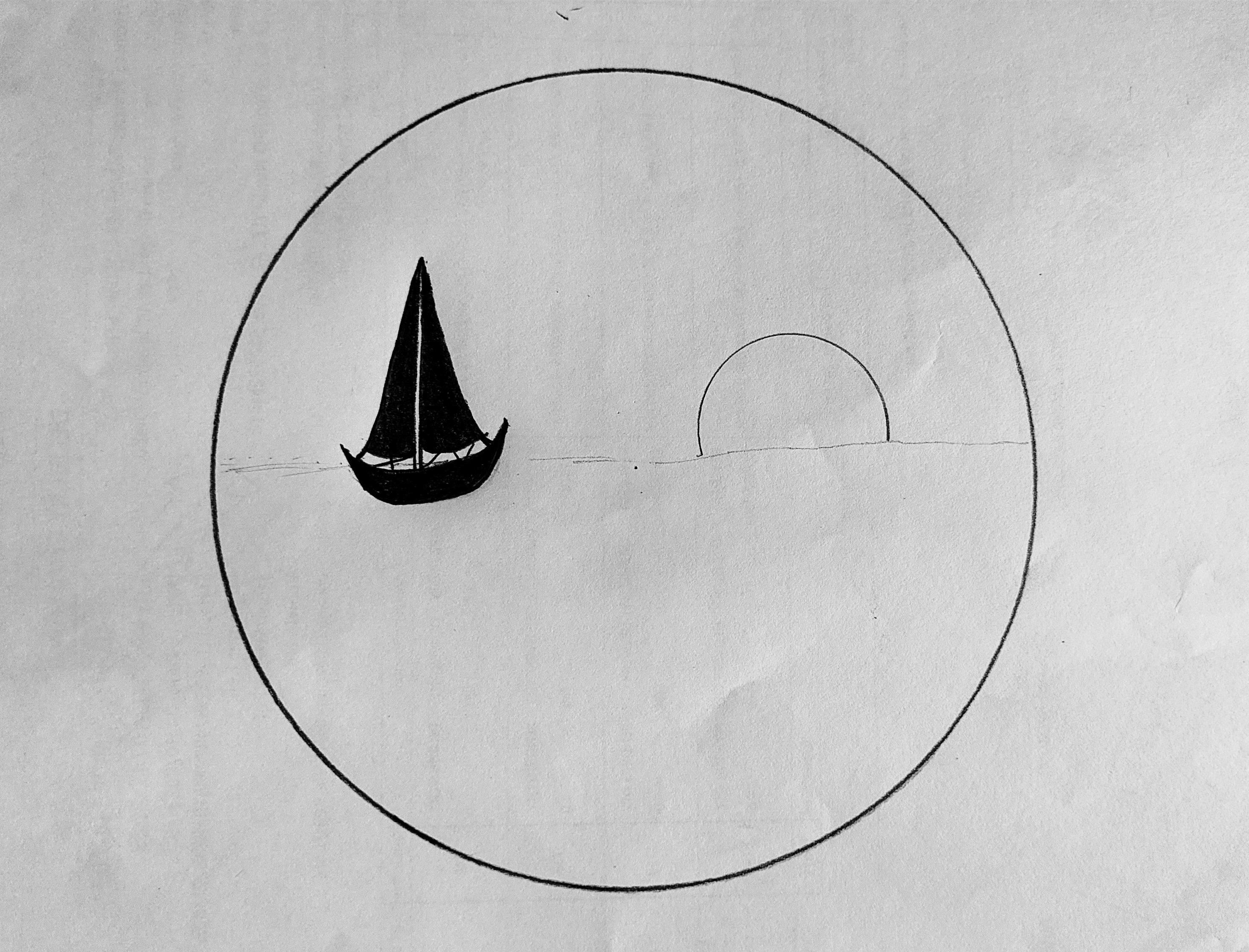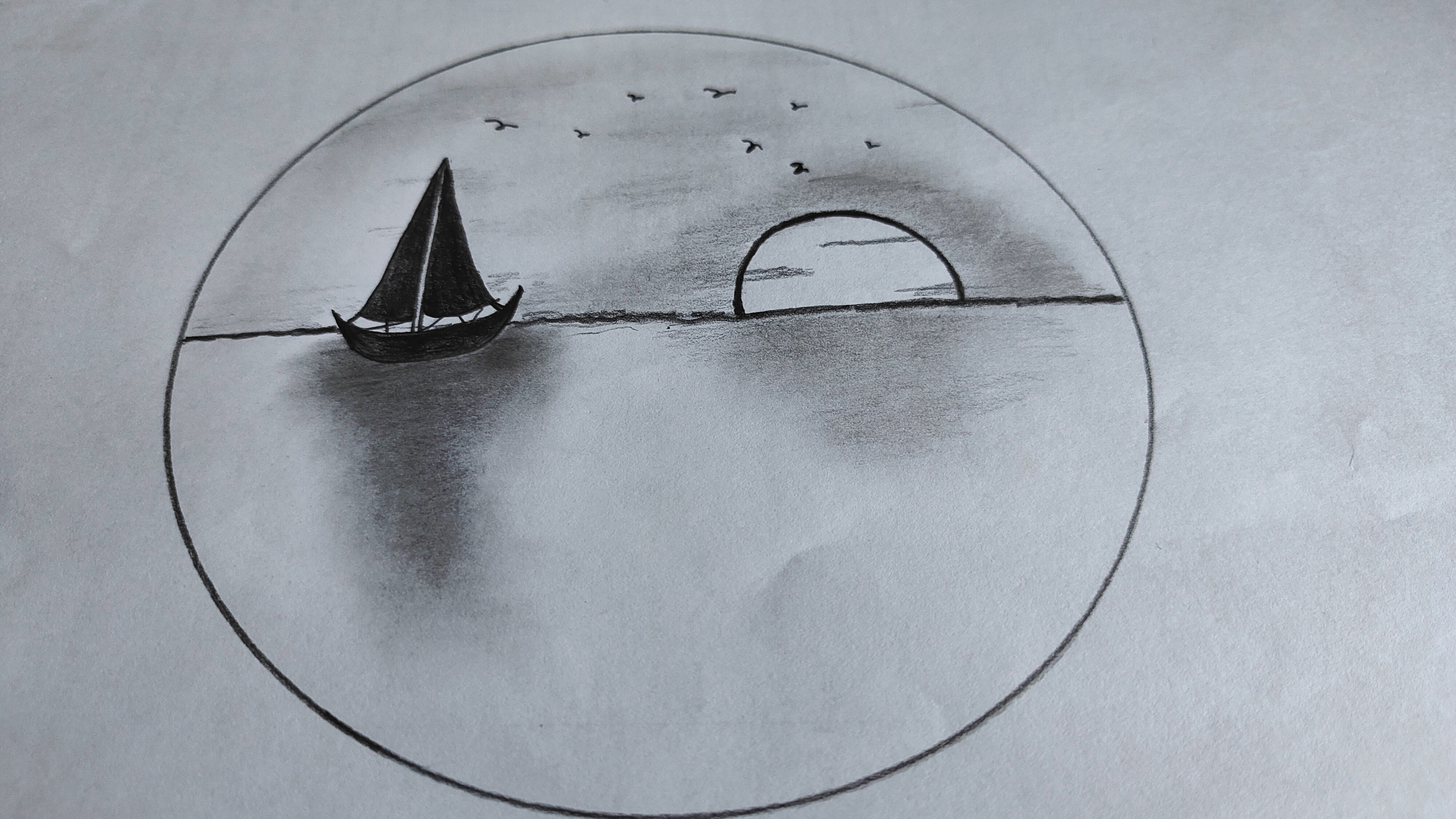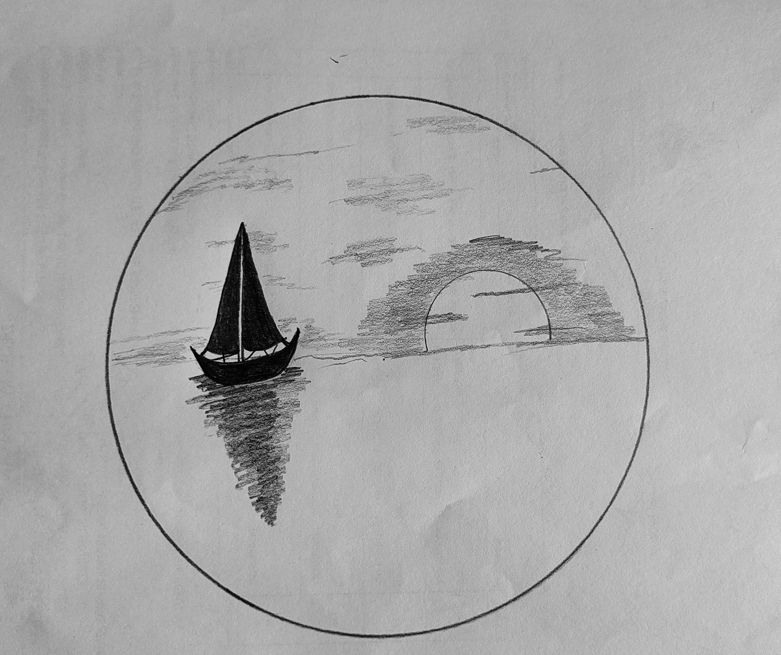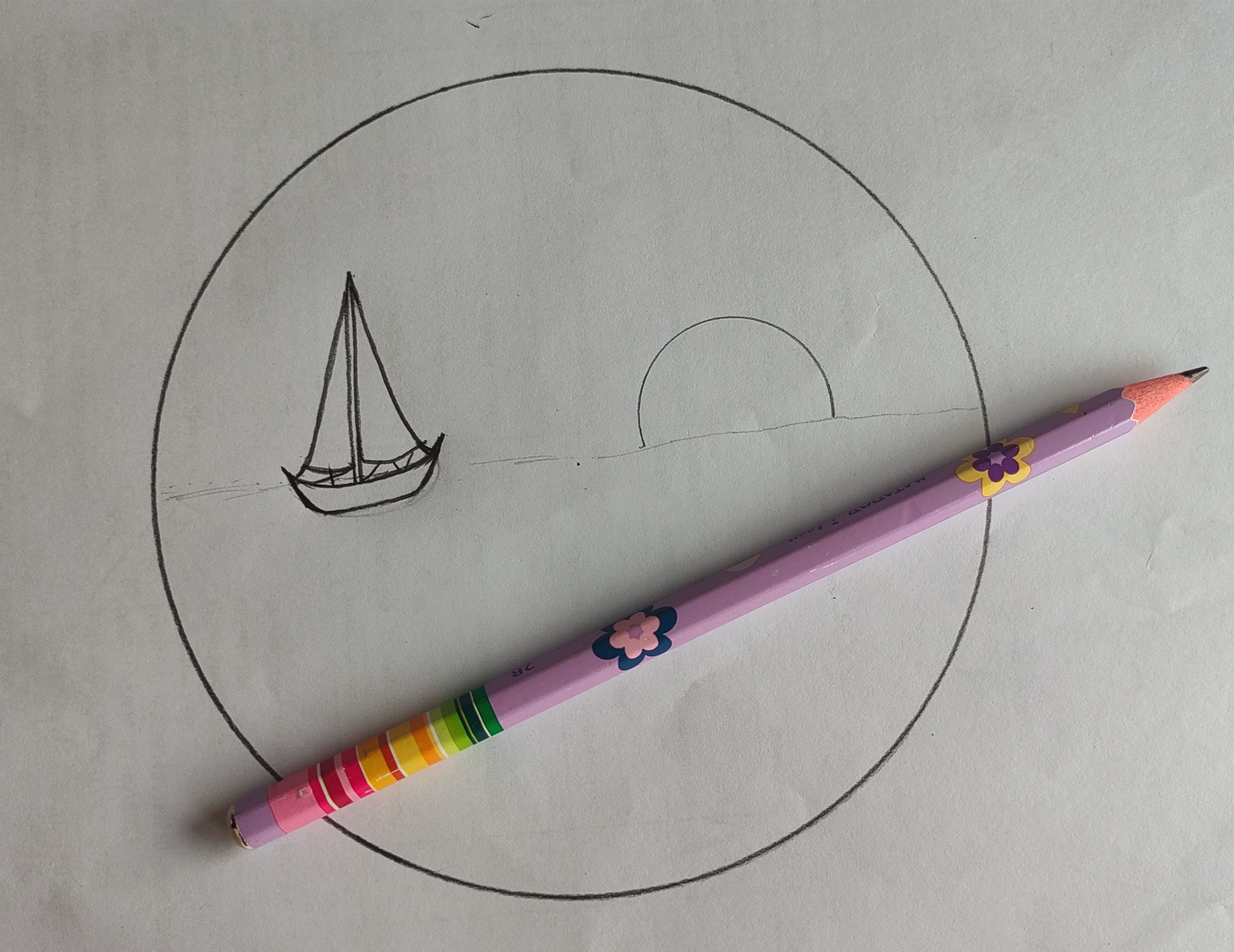 প্রথমে পেন্সিল কম্পাসের সাহায্যে একটি বৃত্ত এঁকে নিবো। এরপর এর মধ্যে একটি চাঁদ এবং পাল-তোলা নৌকা এঁকে নিবো।