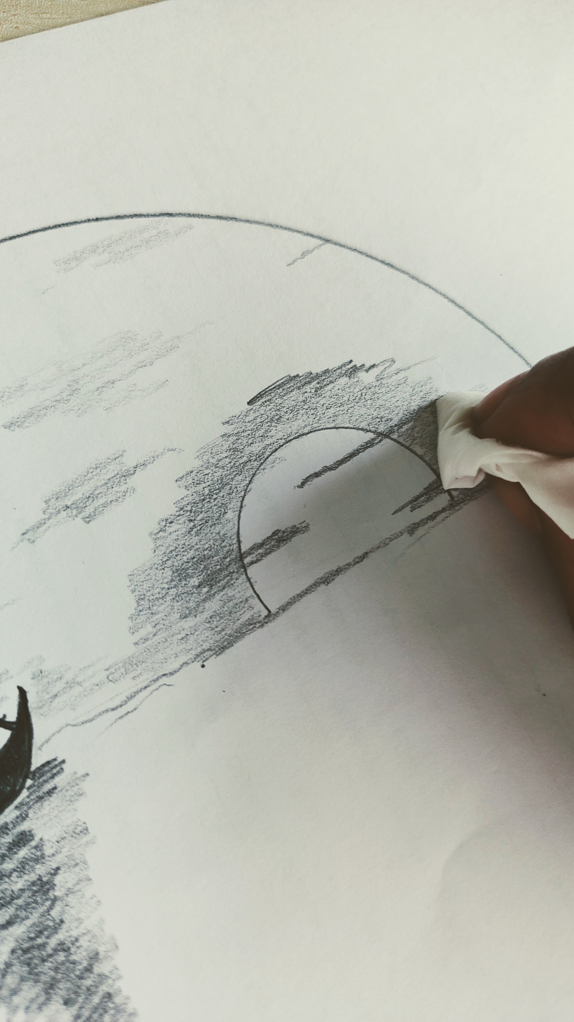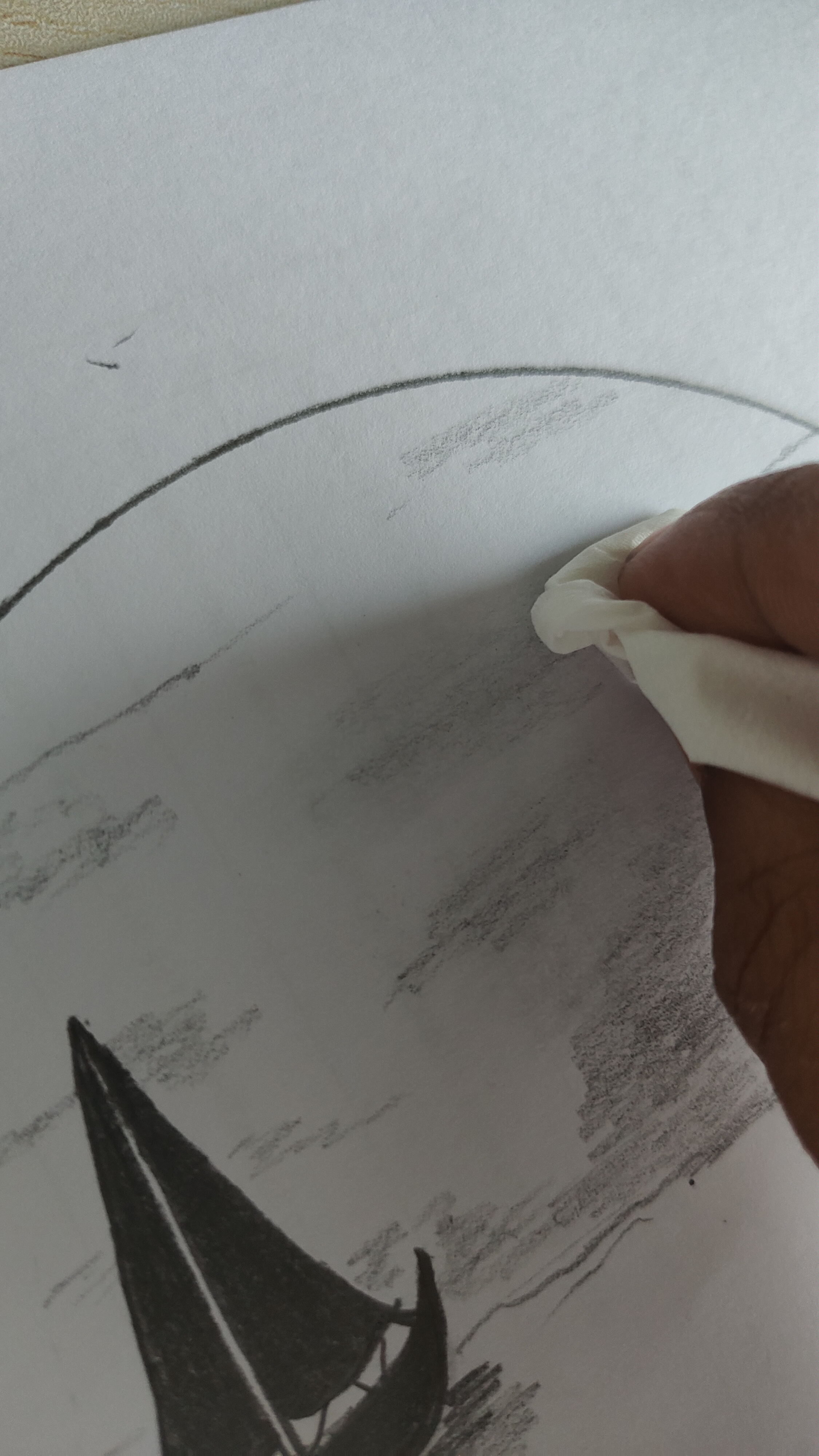 এবারে নৌকা এবং নৌকার পাল ব্লাক পেন্সিলের সাহায্যে ভরাট করে নিবো। চাঁদের পাশের এবং আকাশে কিছু মেঘ দিয়ে দিব। এবং নদীতে পালতোলা নৌকার প্রতিচ্ছবির ঢেউ এর মতোন এঁকে নিবো।