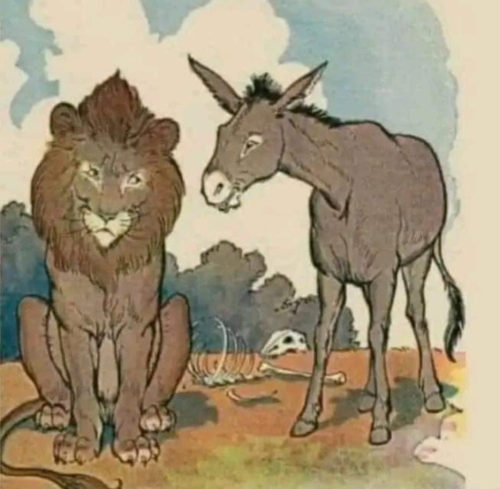 রাজদরবারে সিংহের কাছে পৌঁছানোর আগেই গাধা ডাক ছাড়তে শুরু করে দিল — " মহারাজ, আপনিই বলুন ঘাসের রং নীল কি না?"