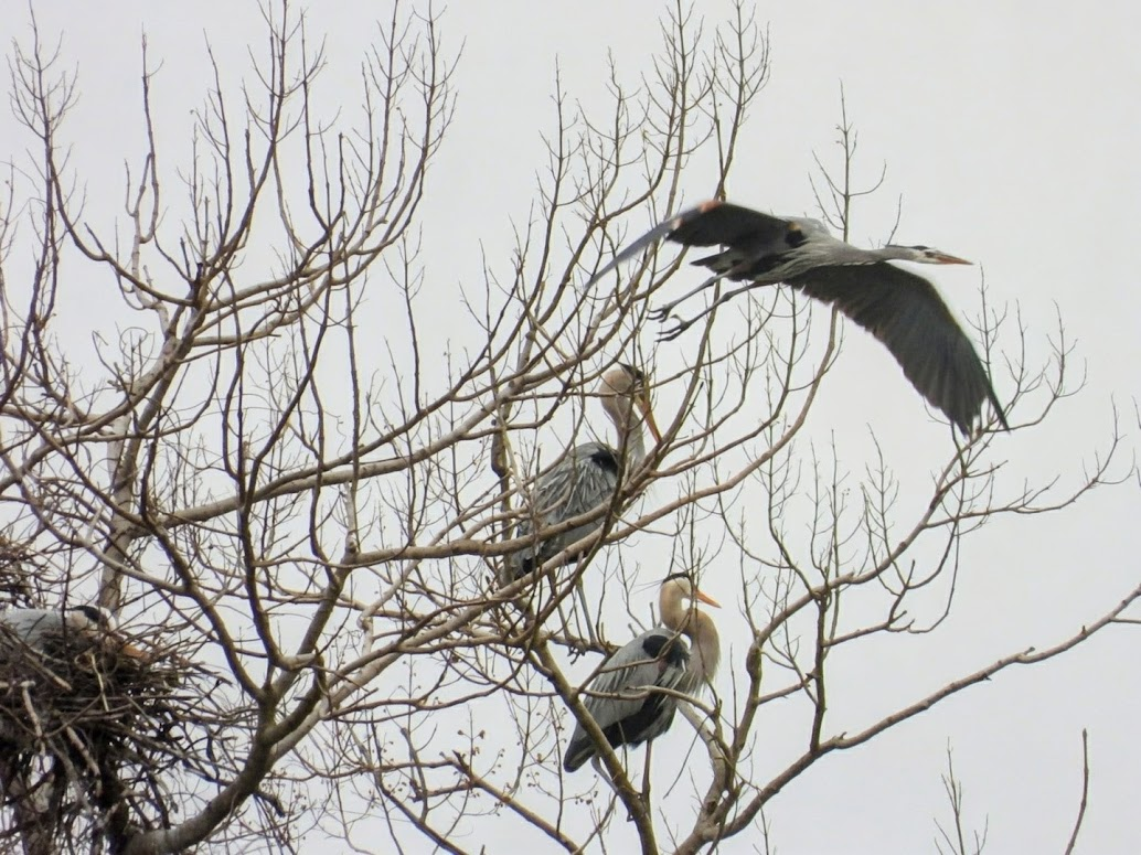 The main attractions there were the Great Blue Herons, though. There were many of them already resting in the trees, and more arriving constantly. It turned out that we could just focus our cameras on the trees, and wait for a heron to fly into the camera to get a flight photo.