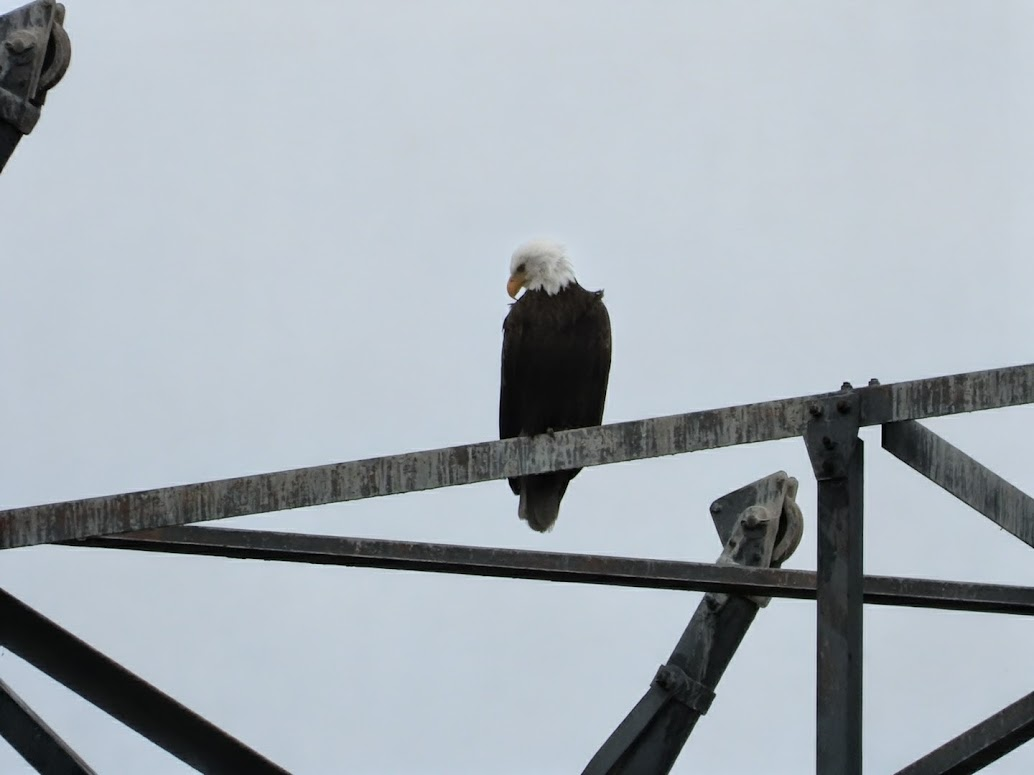 An Adult Bald Eagle on the electric tower on Rowland Island