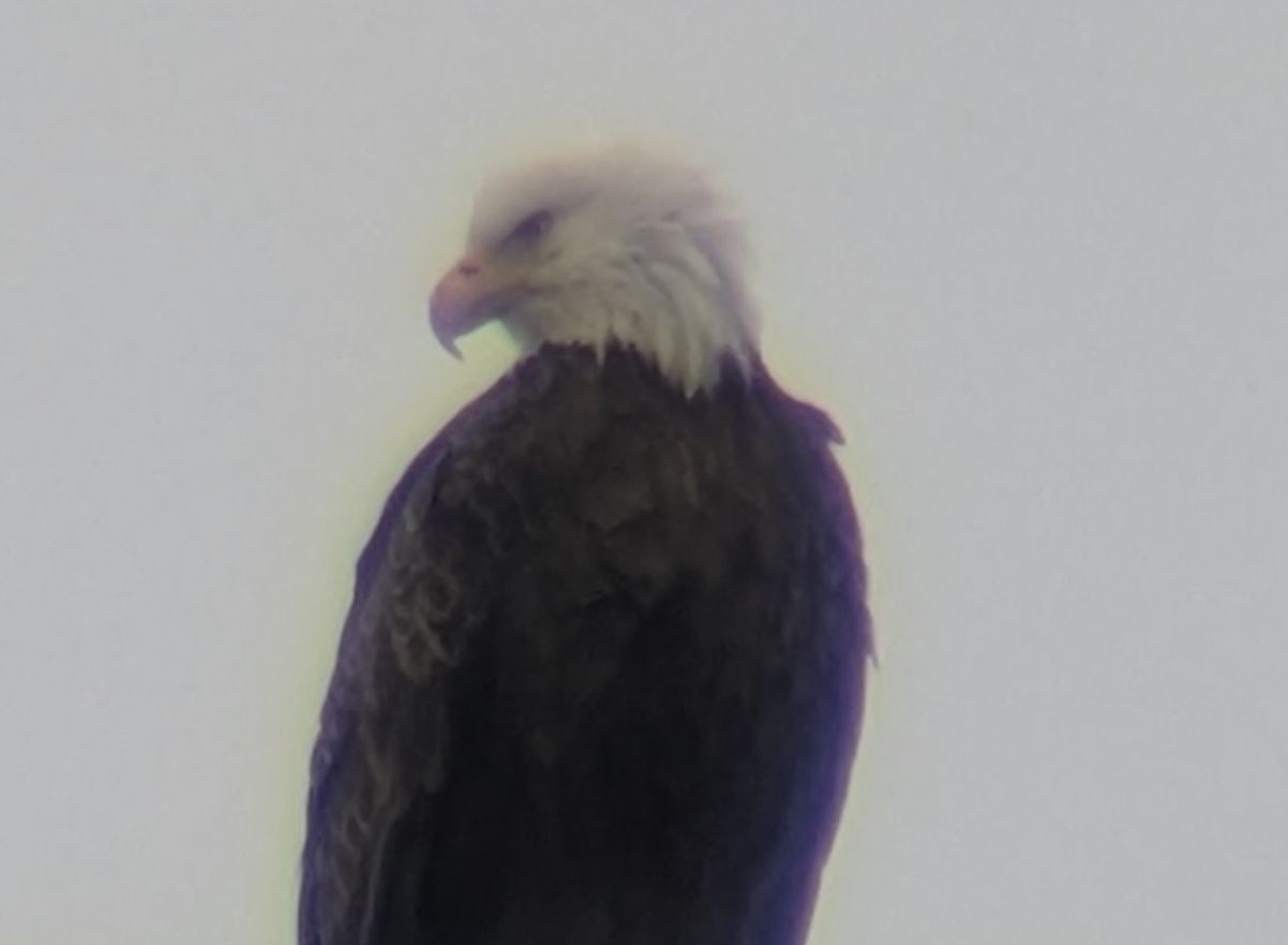 When we first got there, there was an adult and a juvenile roosting in a tree on the far side of the river (9/10 of a mile, according to one of the AIs). Later, there were two adults. It seems to be a popular resting spot.