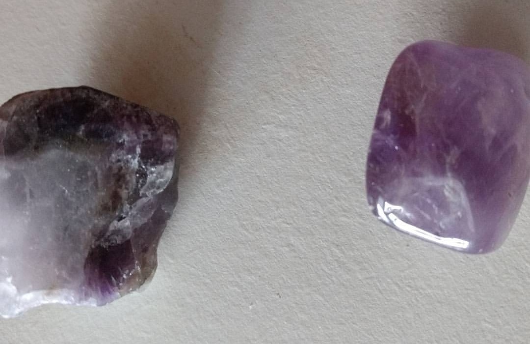 Both of these beautiful gems are amethyst crystals the one on the left is a raw form and the one on the right is all polished and shined ,but like people both are absolutely gorgeous.