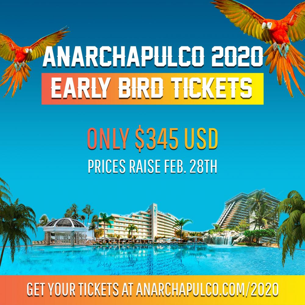Wenn Du Anarchapulco 2020 [3] nicht verpassen willst, hast Du jetzt die Möglichkeit, den ersten Early-Bird-Vorverkauf zu nutzen, welcher für die Tickets der niedrigste sein wird.