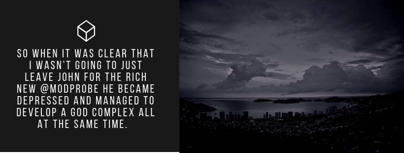 Now one could say it was true love or something along those lines but considering she was the first woman to come into his presence after moving out of my house it seems a bit fishy. It gets worse when he seemingly tried similar tactics with me before moving out. It doesn’t seem related to the woman at all but more to the fact that the only women @modprobe was seemingly coming into any heavy contact with in his life he spent largely alone happened to be women in relationships. Not only that but he’d built up a genius/god complex and by the time he was telling me to leave John he was both admitting he had not experience to be talking but would also say in the same breath he thought it was best for me to leave.