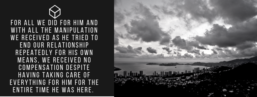 We took care of literally everything for him after that accident, including making several smoothies for him a day since he was on a liquid diet temporarily. After we helped him find a place and move into it where his loneliness that plagued him living with us festered and got worse. For all we did for him and with all the manipulation we received as he tried to end our relationship repeatedly for his own means, we received no compensation despite having taking care of everything for him for the entire time he was here. To be clear we took care of pretty much everything for him for to help him get acclimated with Acapulco especially concerning the accident and were compensated for none of it other than access to loans through him.