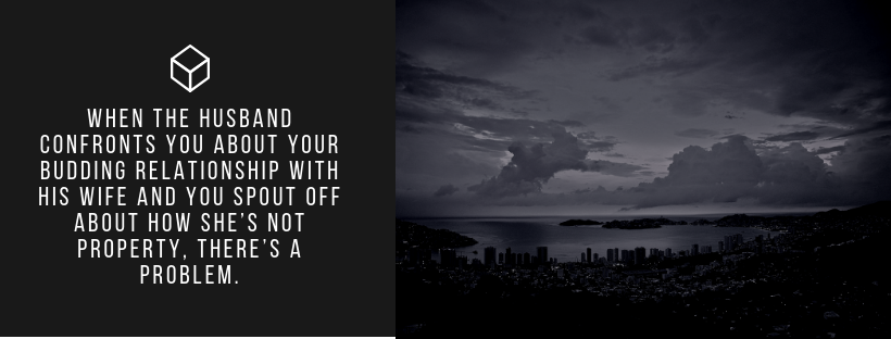 And honestly even showing a little fucking remorse over the fact that you just weasled in and ended a 15 year relationship regardless of if you plan to stay with her for the rest of your life is the very least you could do. When the husband confronts you about your budding relationship with his wife and you spout off about how she’s not property, there’s a problem. A simple “Man, I understand she’s great so losing her must be really hard but we’re in love, I’m sorry” would have been a million times better than the snarky shit he came up with when confronted.