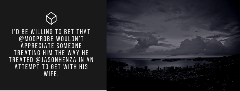 At the end of the day this is a basic violation of the non-agression principle. I’d be willing to bet that @modprobe wouldn’t appreciate someone treating him the way he treated @jasonhenza in an attempt to get with his wife. And quite frankly the way he treated us, his supposed best friends as he tried to manipulate us apart for his own reasons.