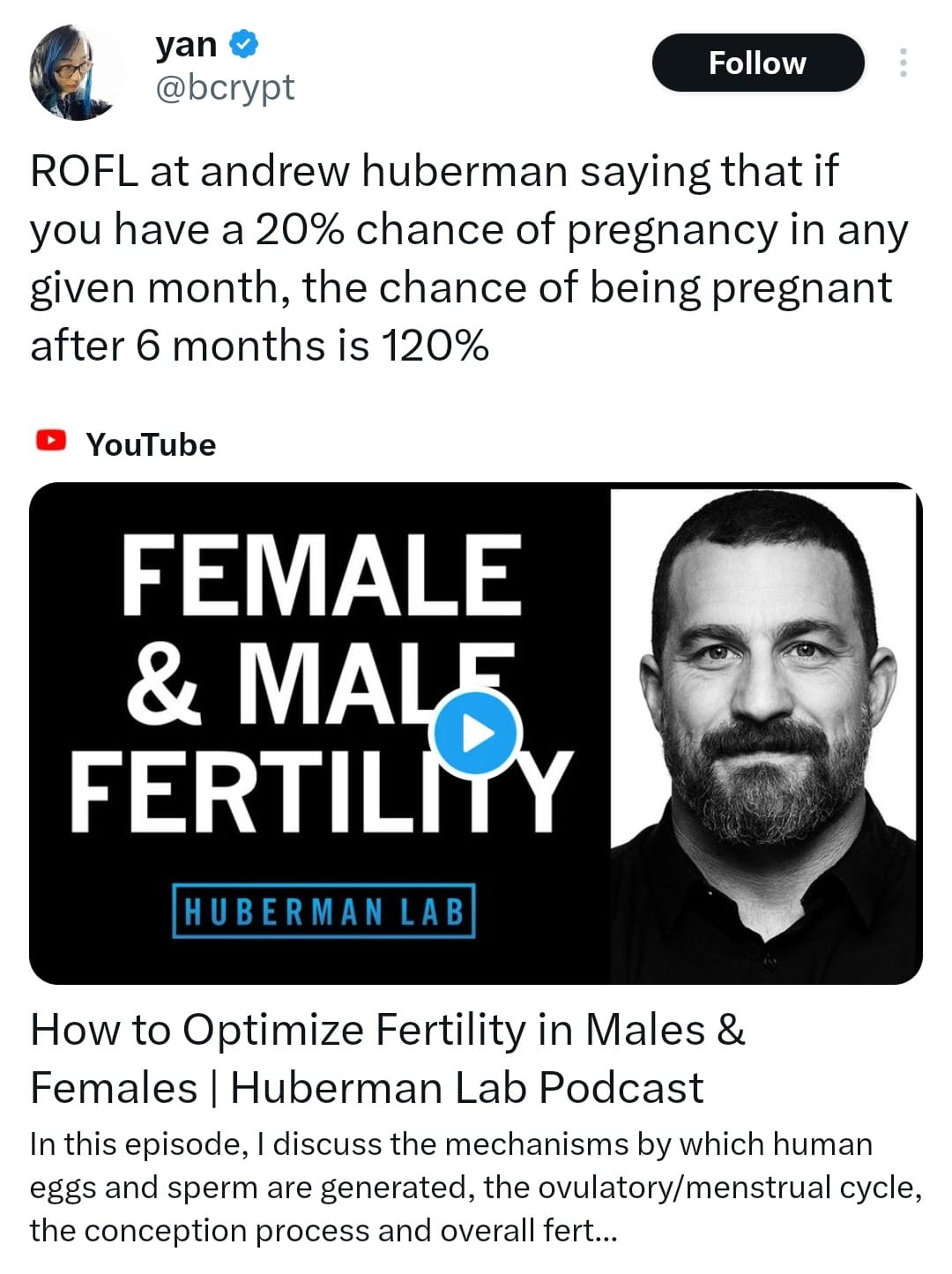 And I get math is hard. And I get that probabilities are even harder for people as they can be unintuitive. But I'm really surprised a dude with a neuroscience doctorate would make such a silly error. C'mon a 120% probability? You don't need to be a mathematician to know you goofed there.