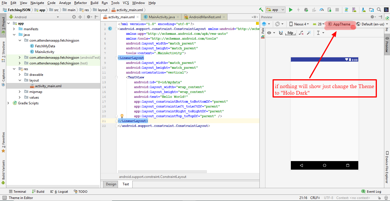 Then Design your Layout and add a Button and a TextView where we fetch our JSON data by clicking that Button and give them id. Follows