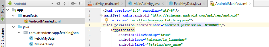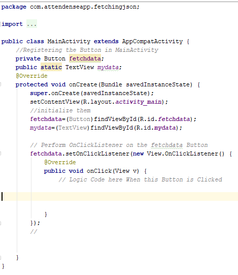Now Register these Elements in the Main Activity, initialize them and implements the OnClickListener on the fetching Button as follows. Make sure that the TextView is public static