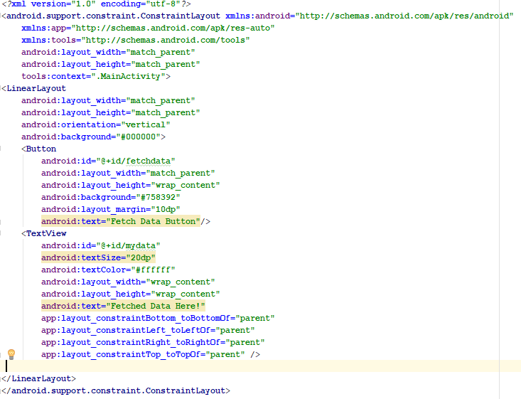 Now open the XML file of your MainActivity and add a Button and TextView in your Design. You can also copy this code for Testing