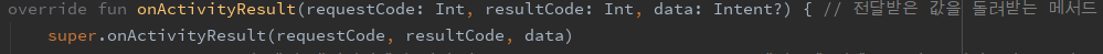 requestCode: 호출시 mainActivity에서 입력하는 코드 startActivityForResult 메서드에 인텐트와 함께 입력해서 호출한 코드(또는 버튼)를 구분한다.