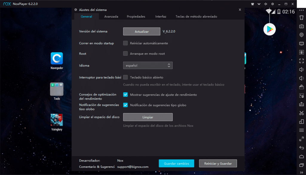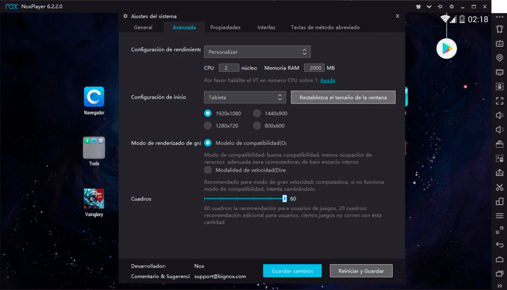 estas son solo las opciones de configuración para rendimiento que nos ofrece Nox, entre otras muchas cosas podemos cambiar temas, usar nuestra cámara web del emulada para cualquier video llamada, grabar pantalla y entre muchas otras opciones que no son importantes a la hora de emular, [pullquote]