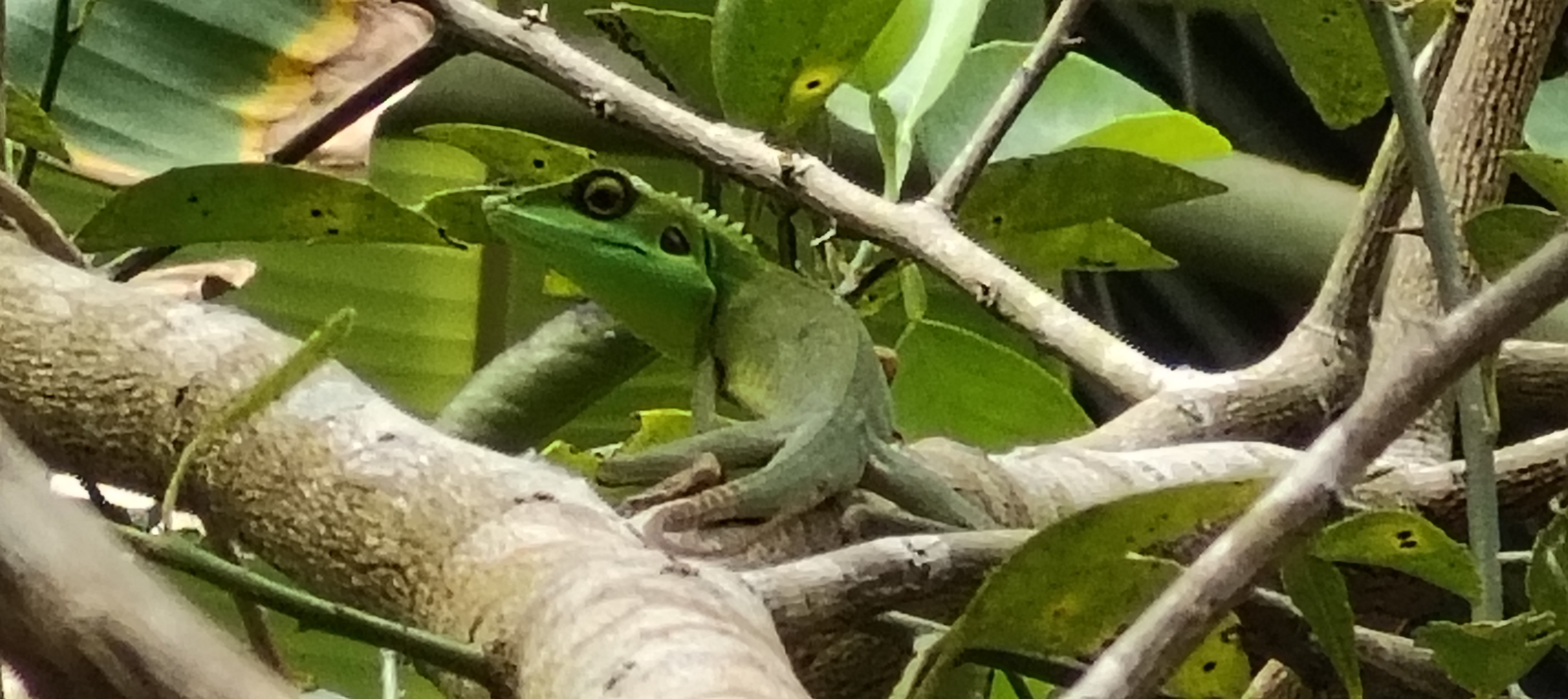 dan sembunyi dari yang mengganggunya dengan kelebihan yang dimilikinya yaitu bisa berubah warna tubuhnya dengan banyak warna.Pada saat saya kembali mengambil hp untuk memfotonya dari warna hijau terus melompat ke batang pohon jeruk nipis berubah warna menjadi coklat dan saya terus mencari dan pada akhirnya saya dapat melihatnya kembali dan bisa mendapatkan foto bunglon tersebut.