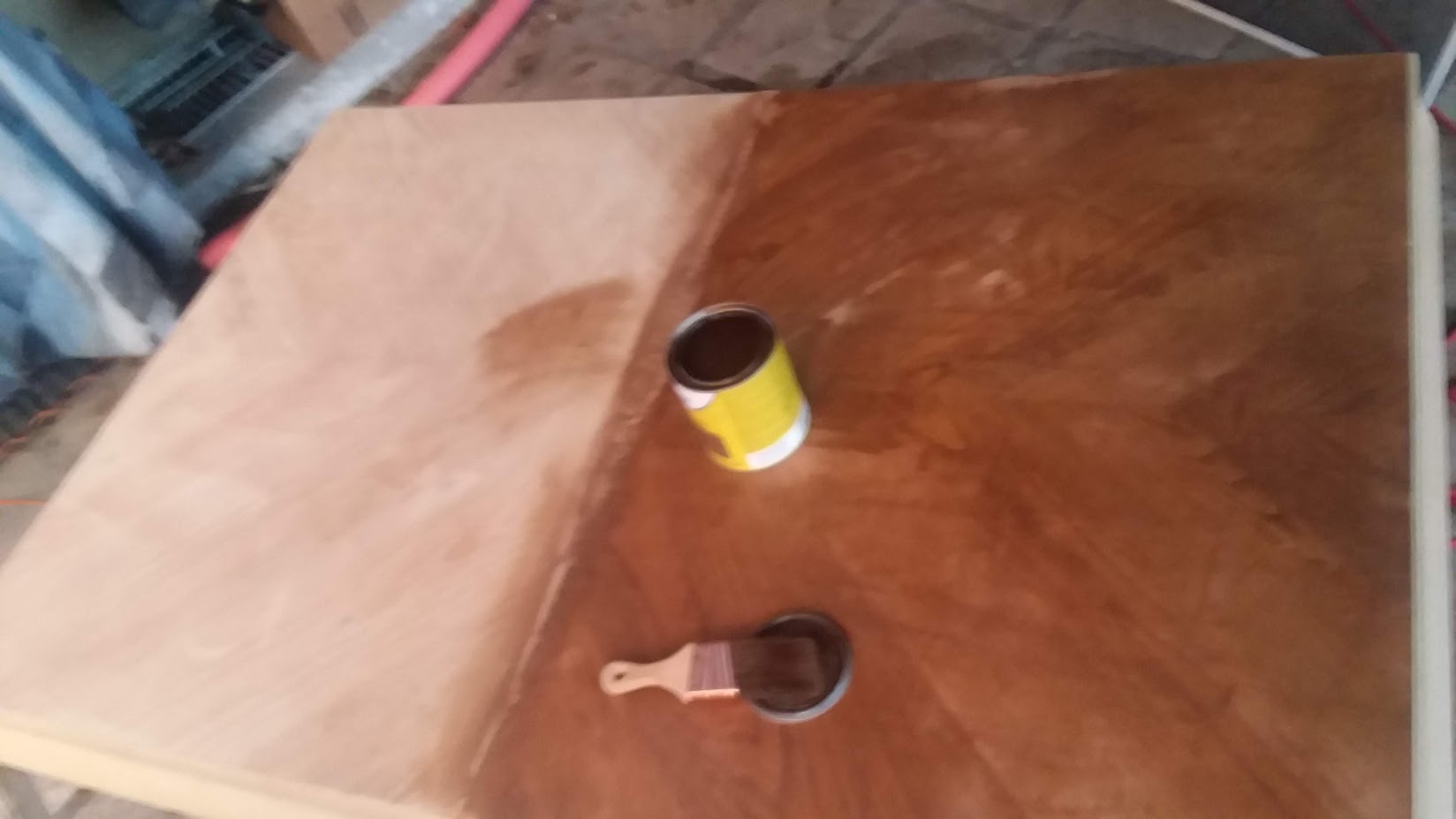 Here you can see the drastic difference in the stained half and the unstained half. Side note, is that the can of stain, paint brush, and lid are on a dry portion of the table. If it was still wet you don't want to rest anything on it or it will leave marks.