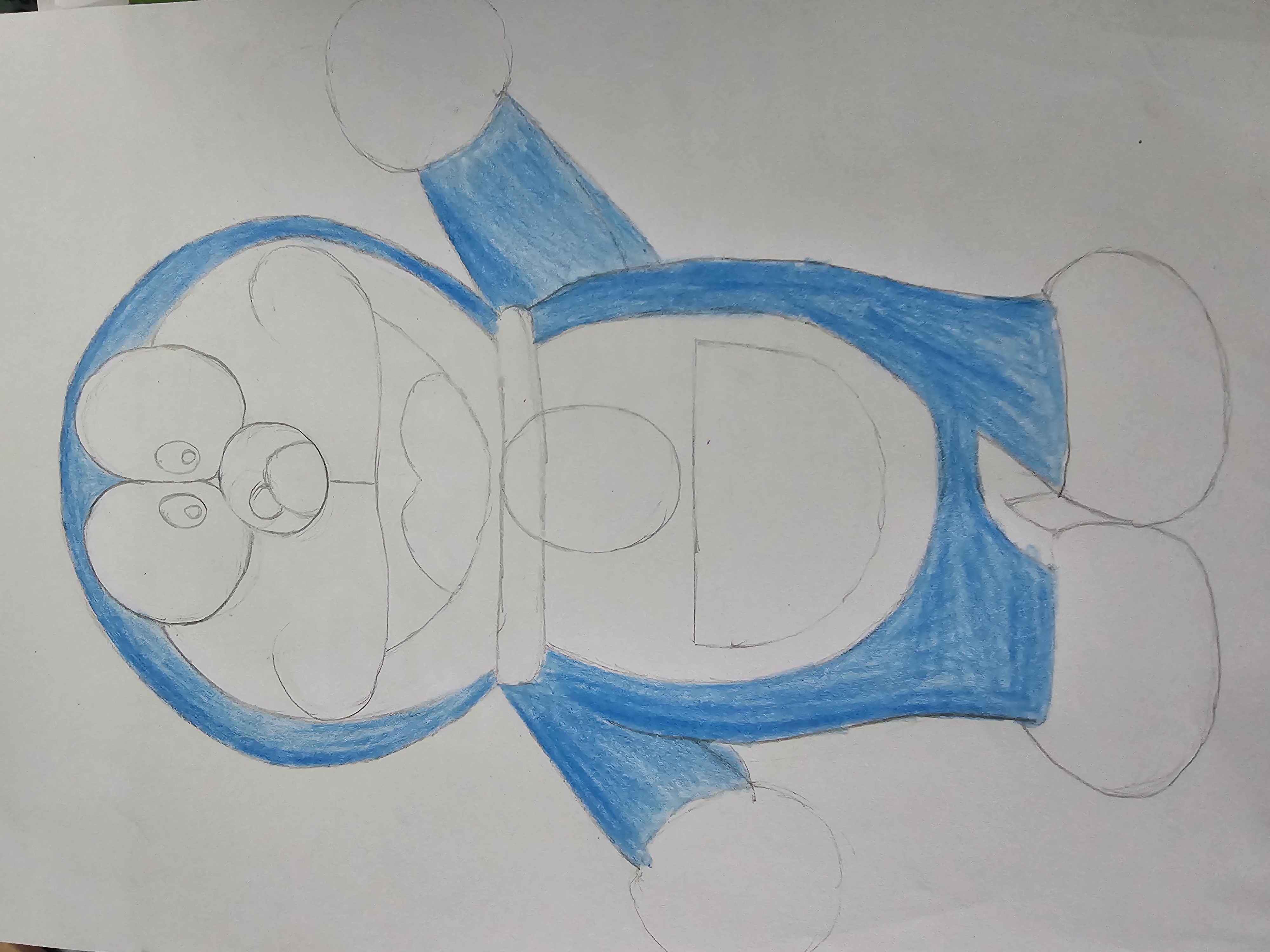 - After finishing the sketch, I will use the color of the wooden pencil to create shadows. Since the color of Doraemon's body is blue, I will first color the entire body of the character with blue color.