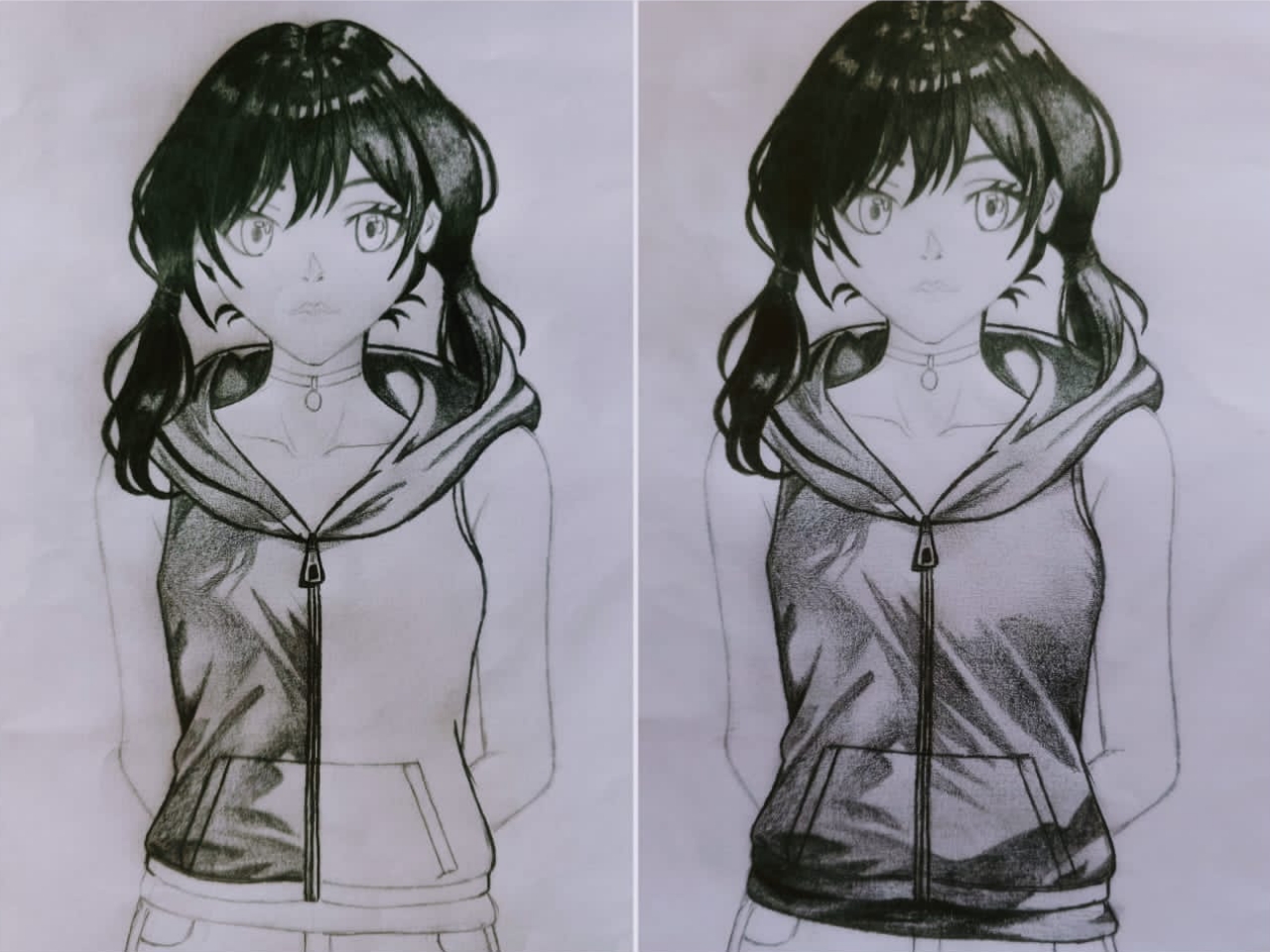 Sombras: Es importante agregar zonas de oscuridad e iluminación para ofrecerle volumen y profundidad al dibujo. Para ello, es necesario aplicar distintas tonalidades, ya sea a través del grafito o con lápices de colores, respetando la forma del personaje y dirección de la luz. Lograr una transición suave es fundamental en el estilo realista y se busca obtener un degradado sutil entre los distintos tonos, esto con la finalidad de obtener un resultado más natural.
