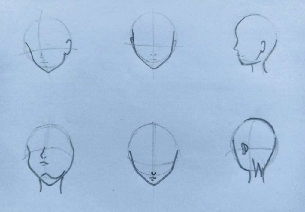 Estructura del rostro: Un boceto guía que ayude a conocer las zonas específicas en las cuales deberán ir los ojos, nariz y boca de nuestro personaje animé según su ángulo es fundamental para poder respetar las formas y proporciones.