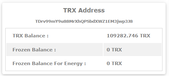 The Tron balance details are shown in the following section. such as your Tron account balance and frozen (staking) balances.