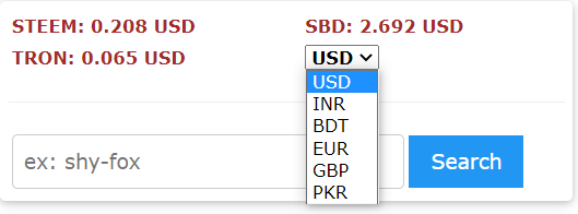 At the top of the page, you can see the current STEEM, SBD, and TRON prices with local currencies (USD, EUR, GBP, INR, BDT, and PKR) and the Search option to find your steemit account.