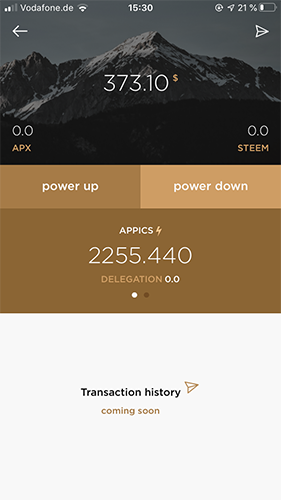 Oben seht ihr wie gesagt euren Wallet Wert. Unten seht ihr die "APX" die eurem Account als Power gutgeschrieben sind, ähnlich wie mit "Steempower". Oben habt ihr jeweils APX & Steem. Links sind die APX die euch nicht als AppicsPower zugewiesen sind. Rechts habt ihr eure Steem. Ihr verdient von allen Voter durch die App "APX" und von Votern die über Steemit.com voten verdient ihr natürlich "Steem".