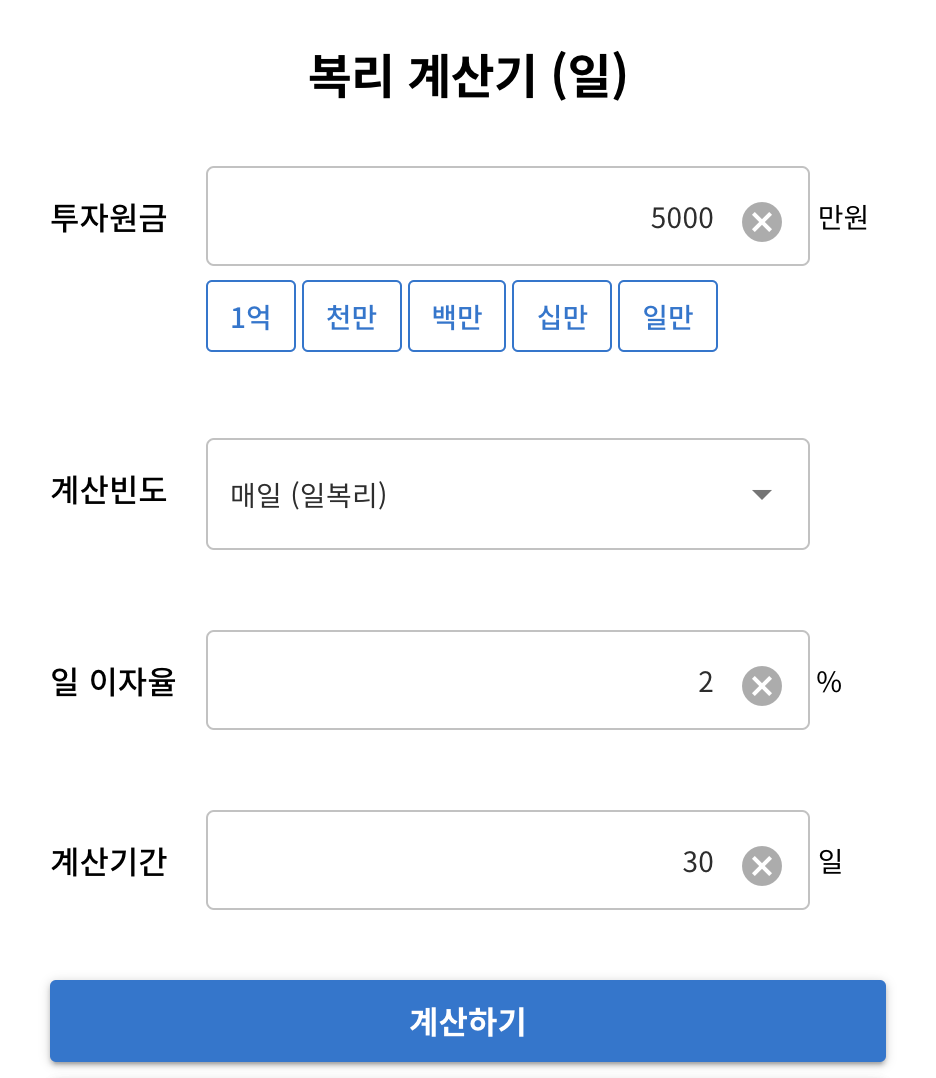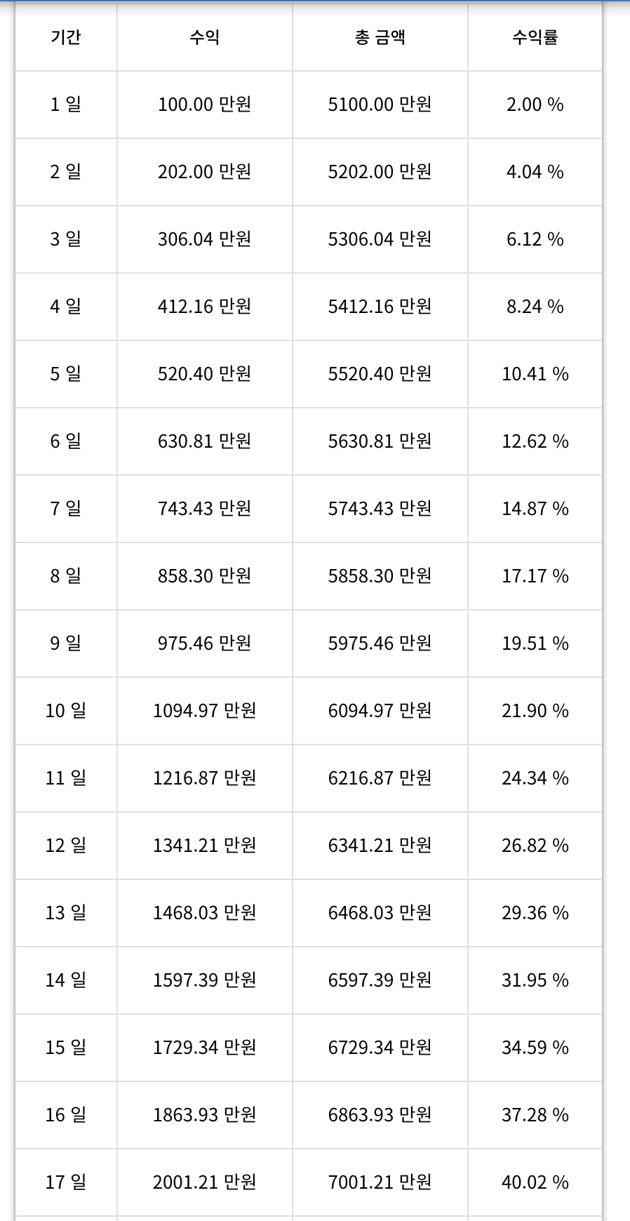 이번에 bdollar덕분에 1일 복리계산이 해볼 필요가 있었습니다. 5천만원을 2% 일복리로 자산을 키우면요.