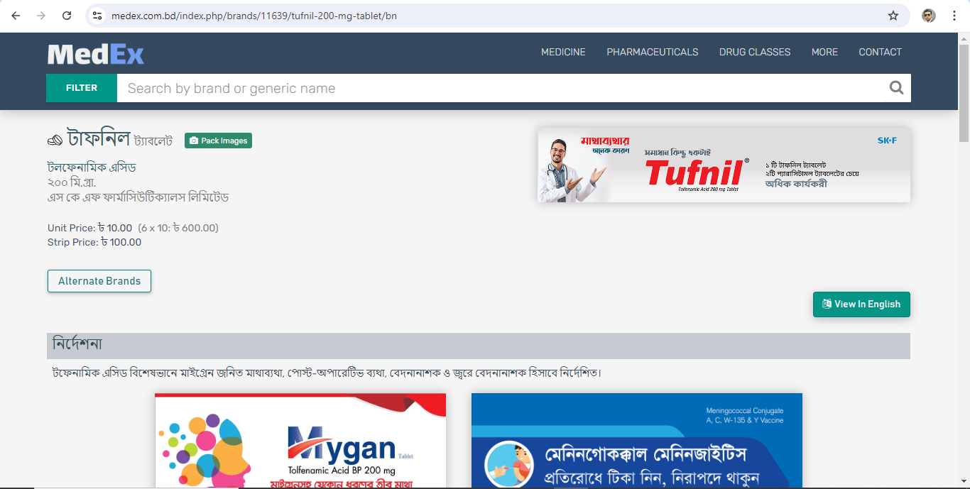 এখানে আরেকটি অ্যাপ দেখতে পাচ্ছেন যেটার লিংকও আমি নিচে দিয়ে দিচ্ছি। লিংক এই অ্যাপটির নাম হলো medex । এখানে আমি মাথা ব্যাথার খুবই পরিচিত একটি ঔষুধের নাম লিখে সার্চ করলাম। tufnil লেখার সাথে সাথে কোম্পানির নাম ও প্রাইস চলে এসেছে। খুচরো মূল্য ১০ টাকা। ফুল বাক্সের দাম ৬০০ টাকা, এক বক্সে ছয় পাতা ঔষুধ থাকে। এক পাতার দাম ১০০ টাকা। দুইটি অ্যাপের মধ্যেই বাংলা ও ইংরেজিতে লিখে সার্চ করতে পারবেন। সকল তথ্য ইংরেজির পাশাপাশি বাংলাতেও পাবেন।